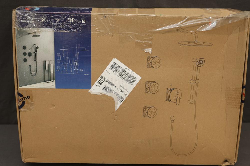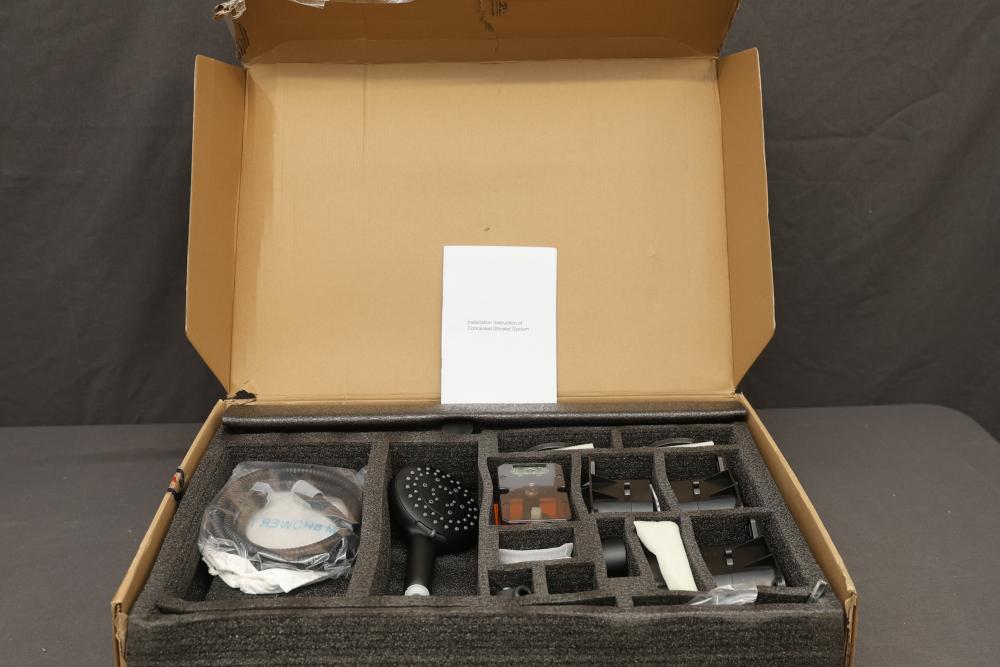 Innovative Technologies Shower System in Matte Black with Cobbe Shower System. Includes shower head, hand shower, slide bar, shower arms, hoses, valve trims, and lever handles. All components carefully packaged in original boxes with instructions for installation. Sleek matte black finish for a modern look. Pickup only.