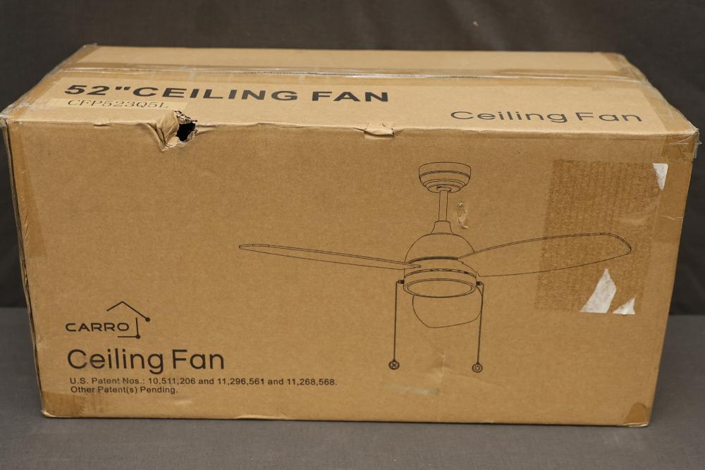 Carro CFP523Q5L 52 Inch Ceiling Fan, featuring a sleek design with durable materials and equipped with a built-in LED light and remote control. The box includes the fan blades, installation instructions, and all necessary components for setup. Pickup only.