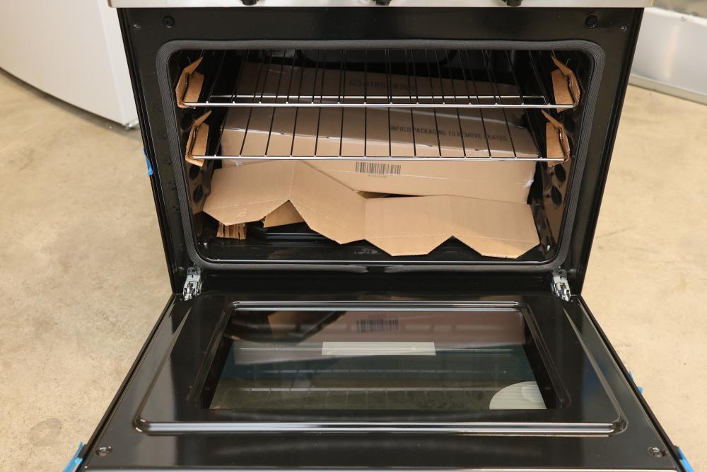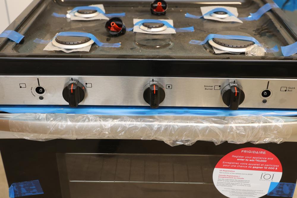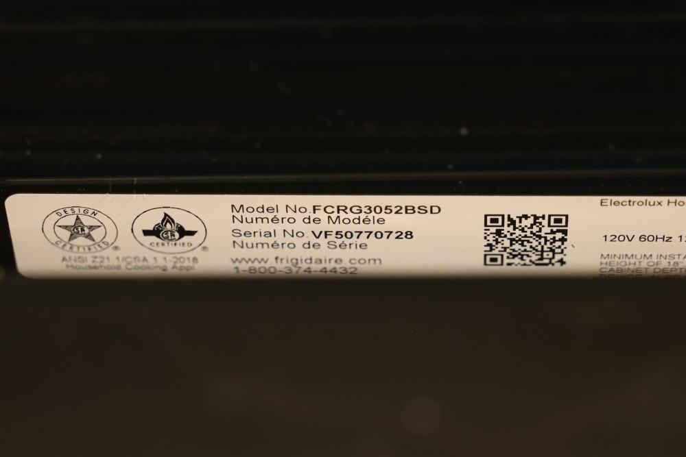 Frigidaire FCRG3052BS 30 Inch 5 Burner Freestanding Gas Range in Stainless Steel. Features include a 30-inch freestanding design, 5 burners, and a sleek stainless steel finish. Includes interior racks and storage drawer. Condition may vary, see photos for details. Pickup only.