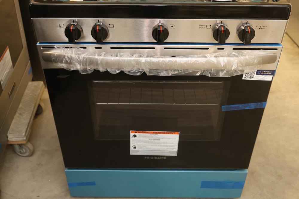 Frigidaire FCRG3052BS 30 inch 5 Burner Freestanding Gas Range in Stainless Steel. Features a spacious oven with racks and a 5-burner gas cooktop. Condition may vary, see photos for details. Operation manual and accessories included. Pickup only.