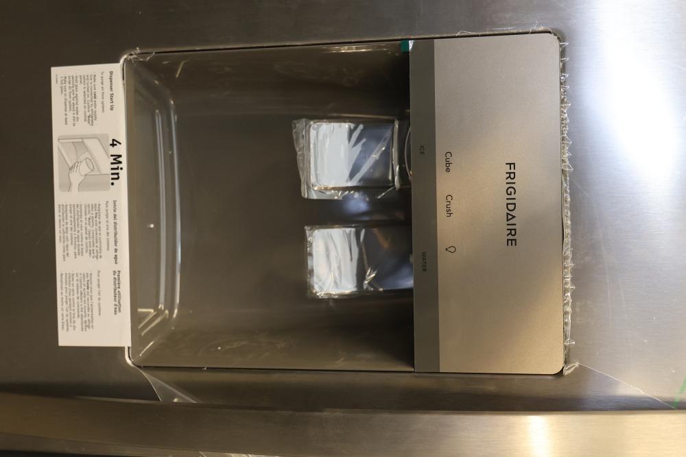 Frigidaire FRSS2623AS 36 inch freestanding side by side refrigerator with a depth of 25.6 cubic feet. Features an external dispenser for cube and crushed ice, as well as water. Includes multiple adjustable storage shelves and compartments. Conditions may vary, see photos for details. Pickup only.