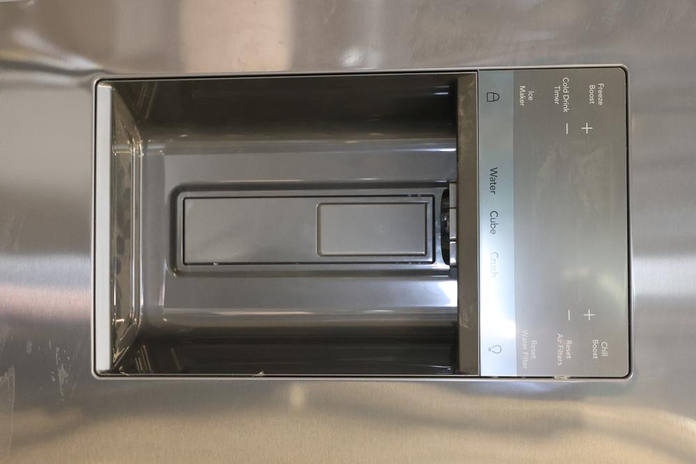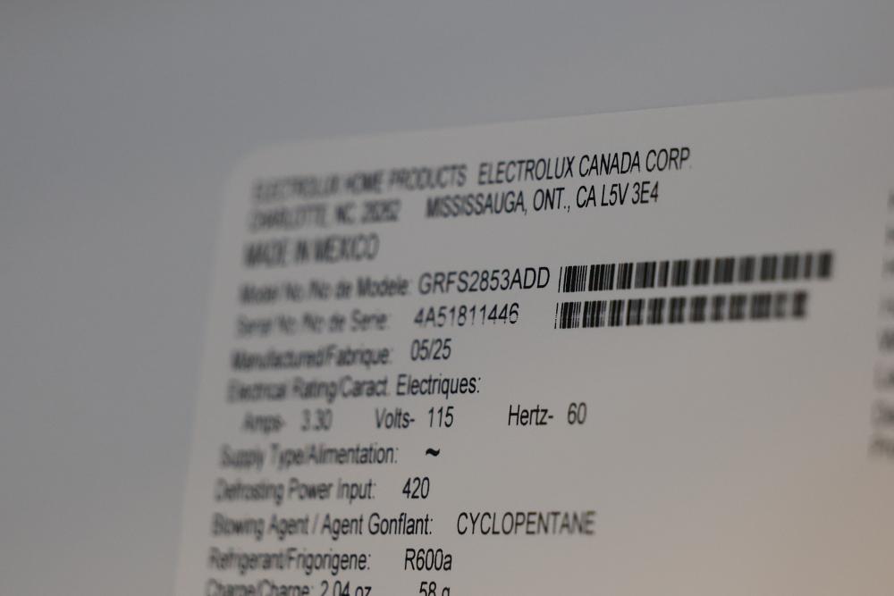 Frigidaire GRFS2853AD 36 Inch French Door Refrigerator with 27.8 Cubic Ft Capacity. The unit features a spacious interior, water and ice dispenser, and multiple clear storage compartments. Wheels on the unit seem to be broken, and the condition may vary. See photos for details. Pickup only.