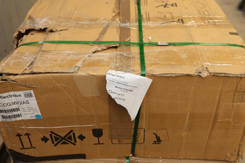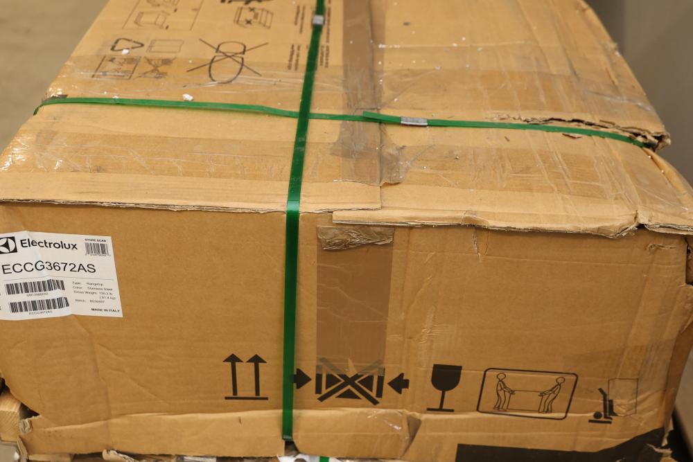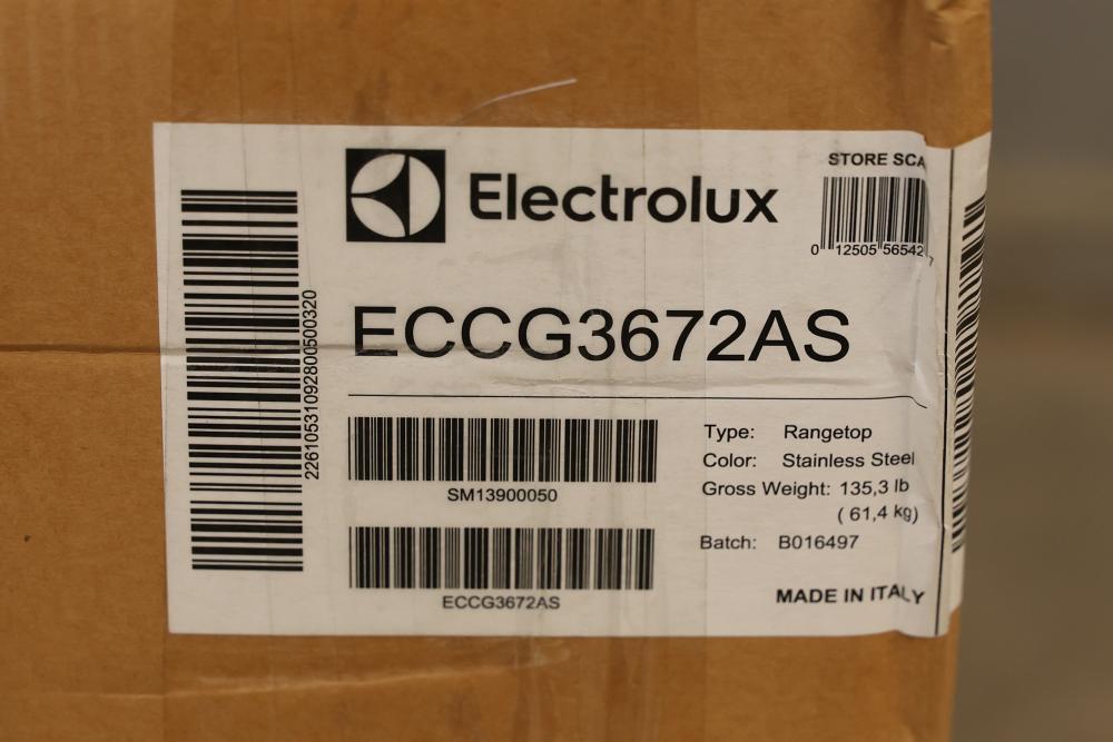 ElectroLux ECCG3672AS 36 Inch Gas Stainless Steel Rangetop. Item has not been removed from the box, and the condition may vary. The box shows visible signs of wear, including dents and tears. Gross weight is 133.5 lbs. Pickup only.