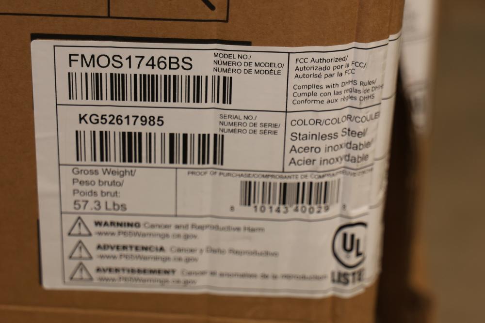 Frigidaire 30 Inch Over-The-Range Microwave FMOS1746BS With 1.7 Cubic Feet Capacity. The microwave features stainless steel construction and a variety of functions accessible through its touch controls. Condition may vary, see photos for details. Box shows some wear from handling and storage. Pickup only.
