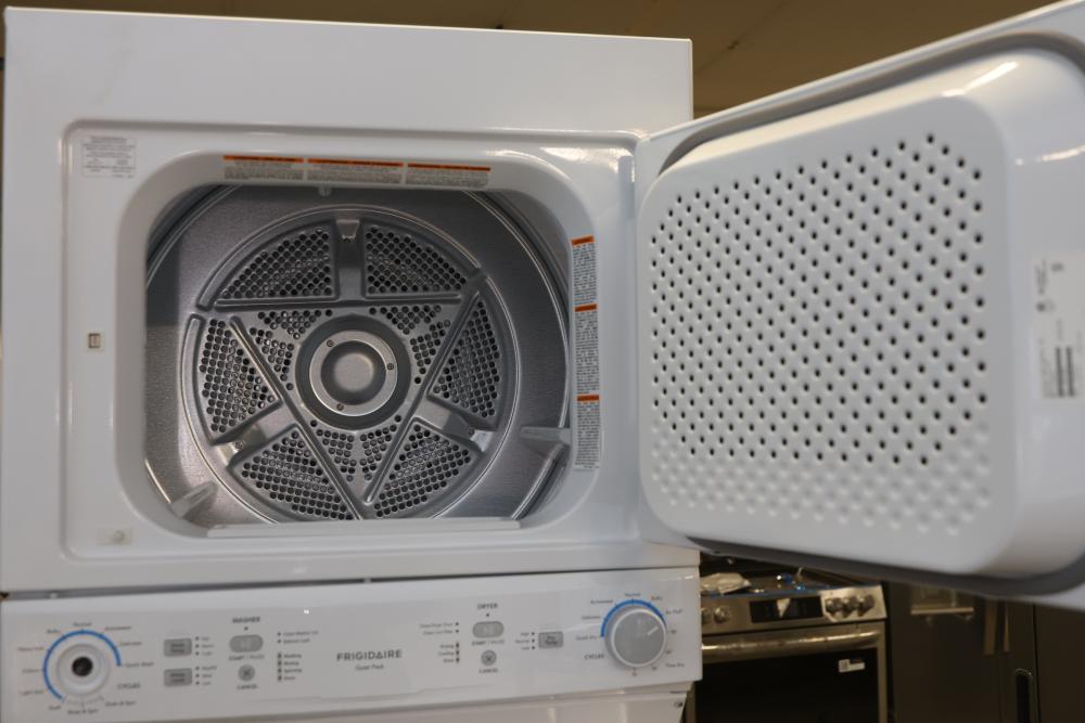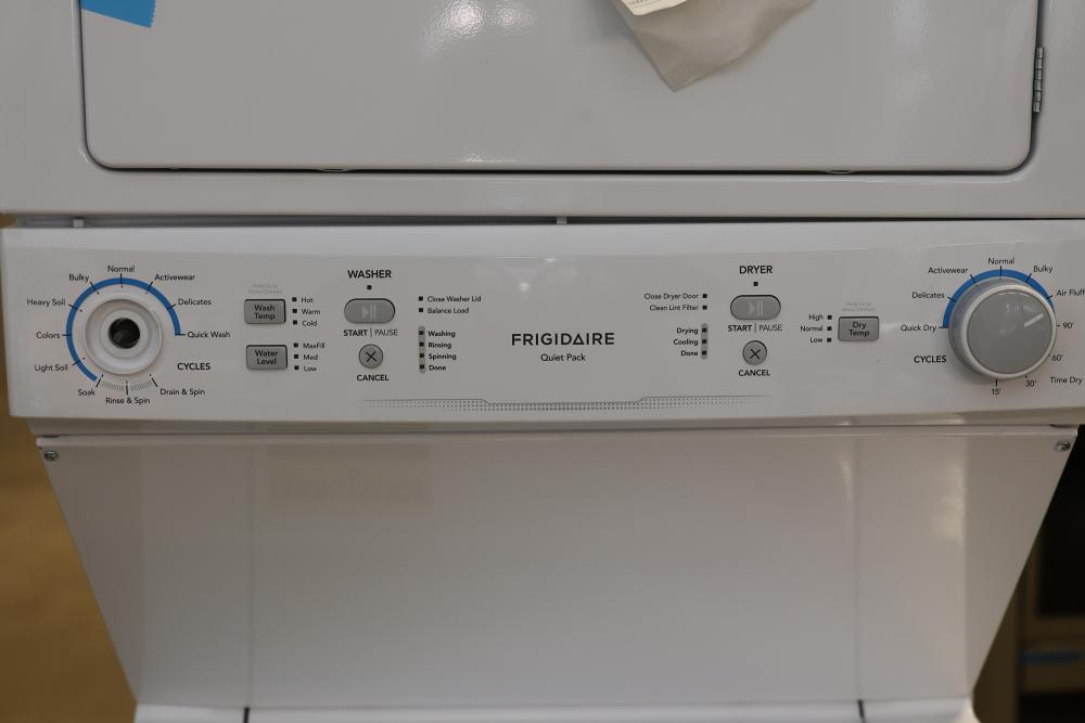 Frigidaire FLCE7522AW 27 Inch Electric Laundry Center Washer Dryer Combo with 3.9 Cubic Feet Washer Capacity and 5.5 Cubic Feet Electric Dryer Capacity. Features Quick Wash and Dry Cycle and MaxFill Wash Cycle. One knob is missing from the unit, see photos for further details and condition. Pickup only.