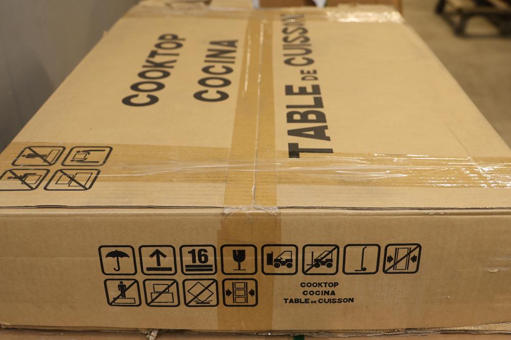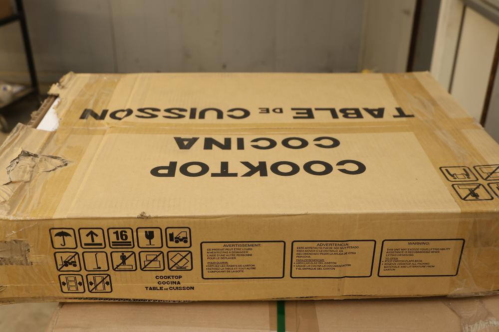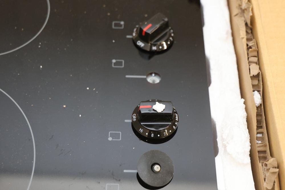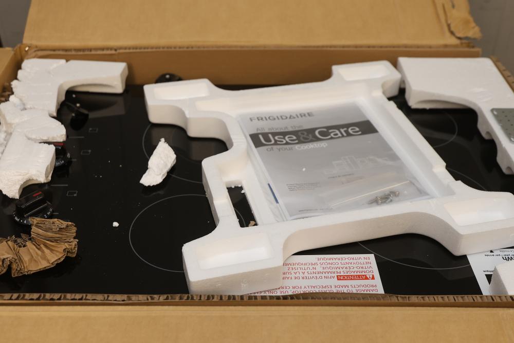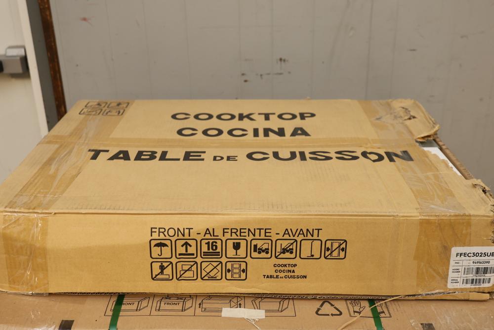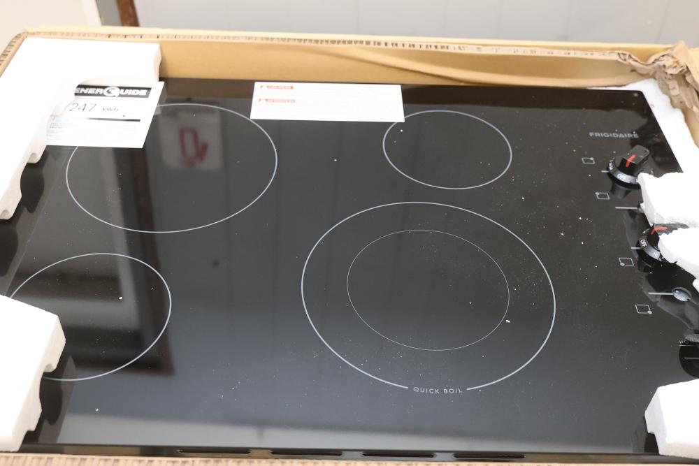 Frigidaire FFEC3025UB 30 Inch Electric Cooktop - Visible Damage Near Knobs. Box shows wear and damage. Cooktop includes visible damage near the knob area, please refer to photos for further details and condition. Pickup only.