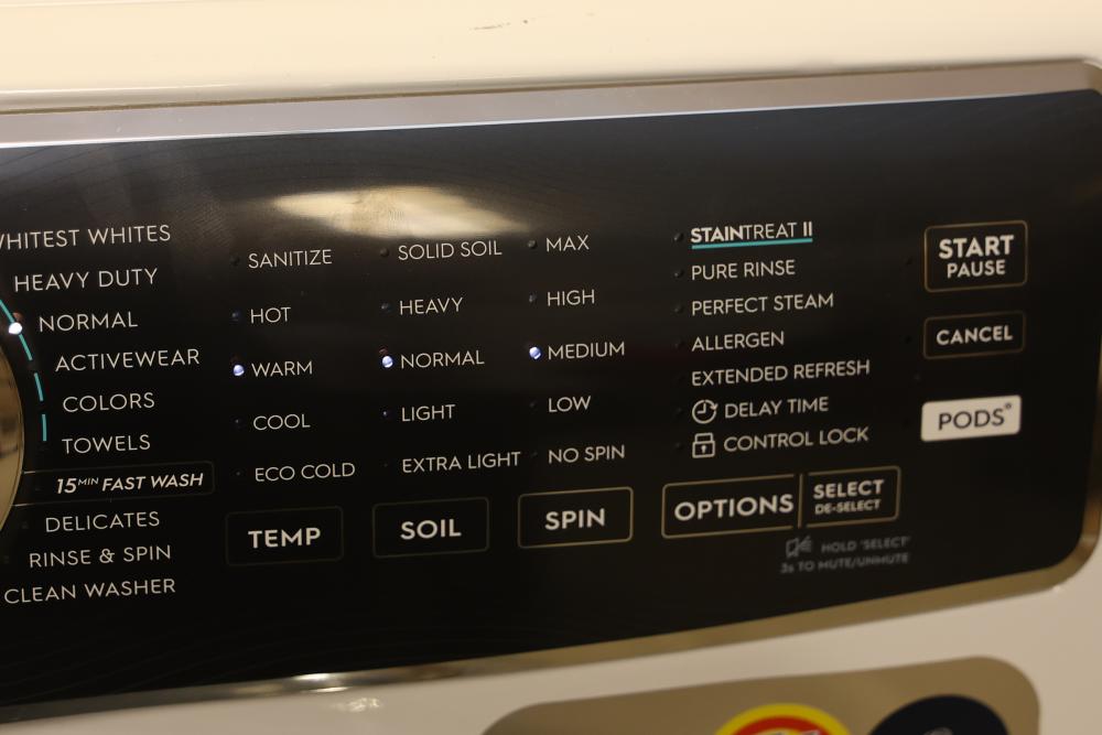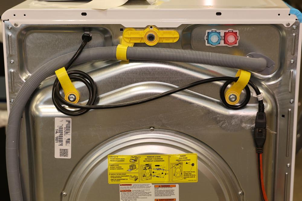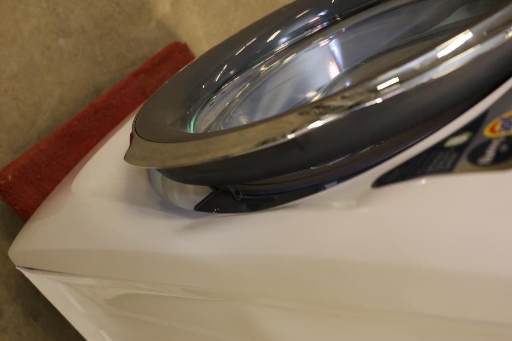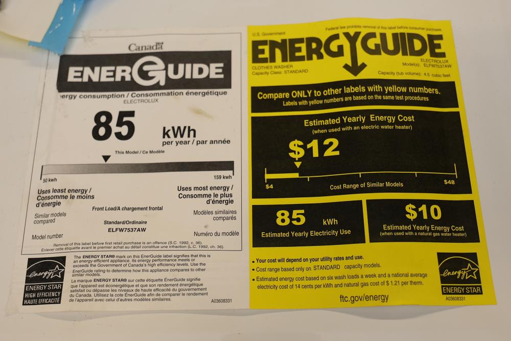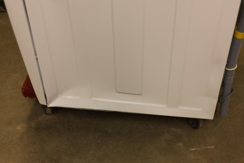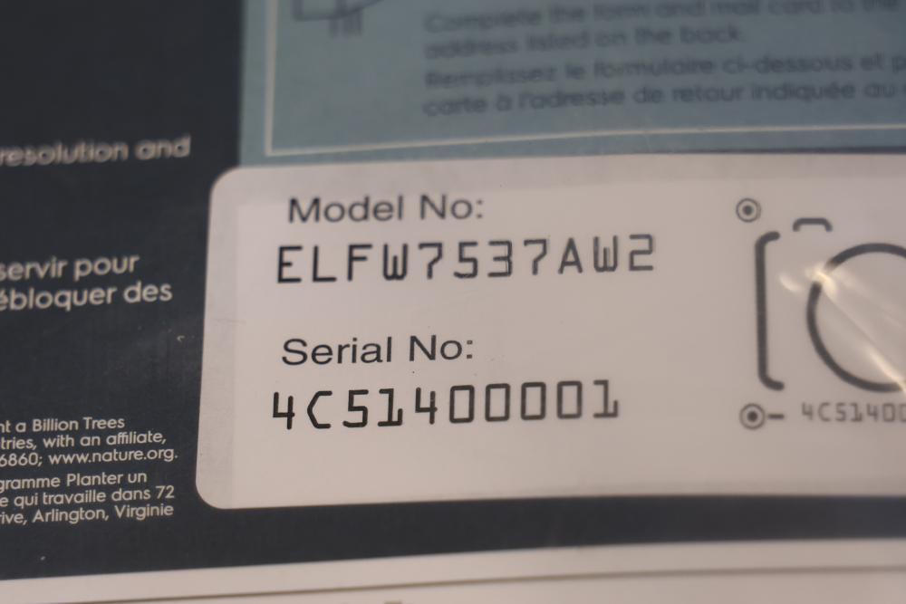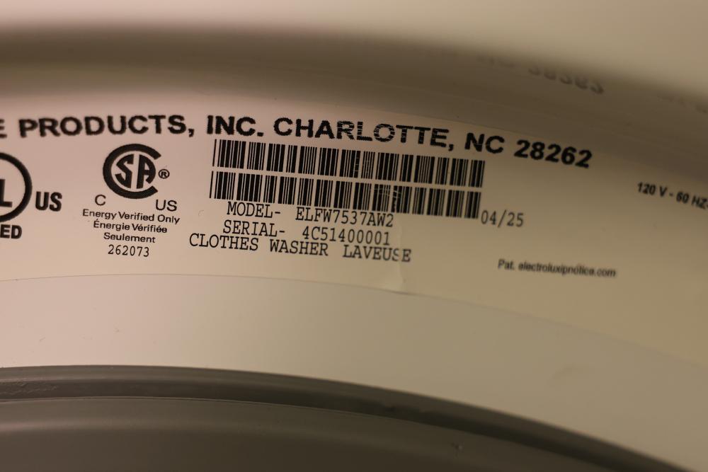 Electrolux front load washer, model ELFW7537AW2, featuring a 4.5 cubic feet capacity. Operates at 120V, 60Hz, and 12 amps. Designed for energy efficiency and equipped with advanced washing technology. The unit is functional but has a dent on the side preventing the door from closing, requiring repair. Identifiable serial number 4C51400001. Pickup only.