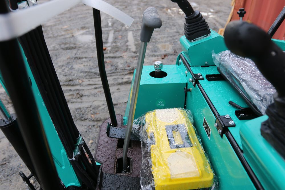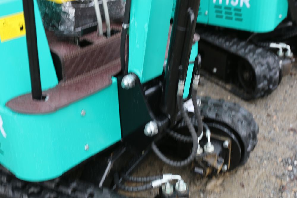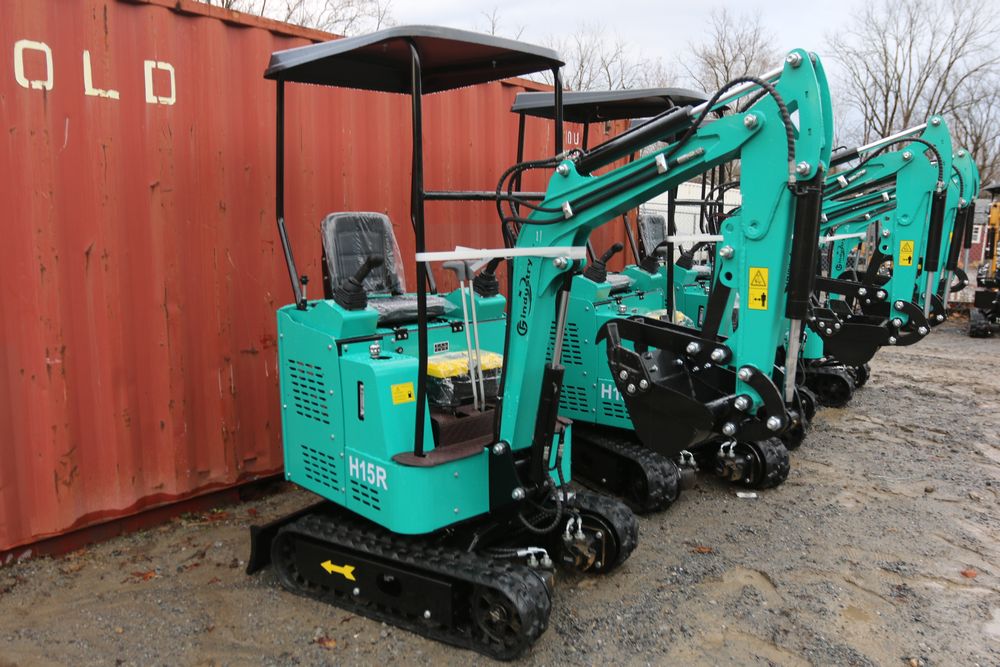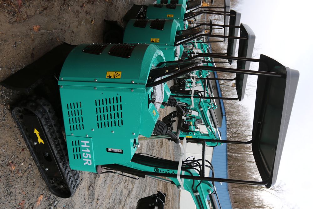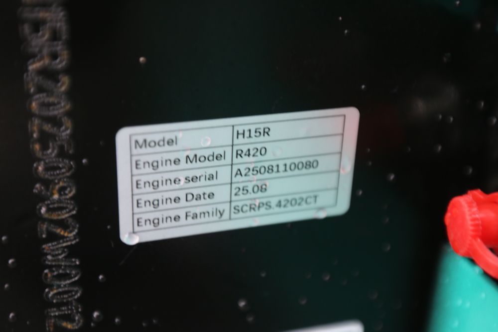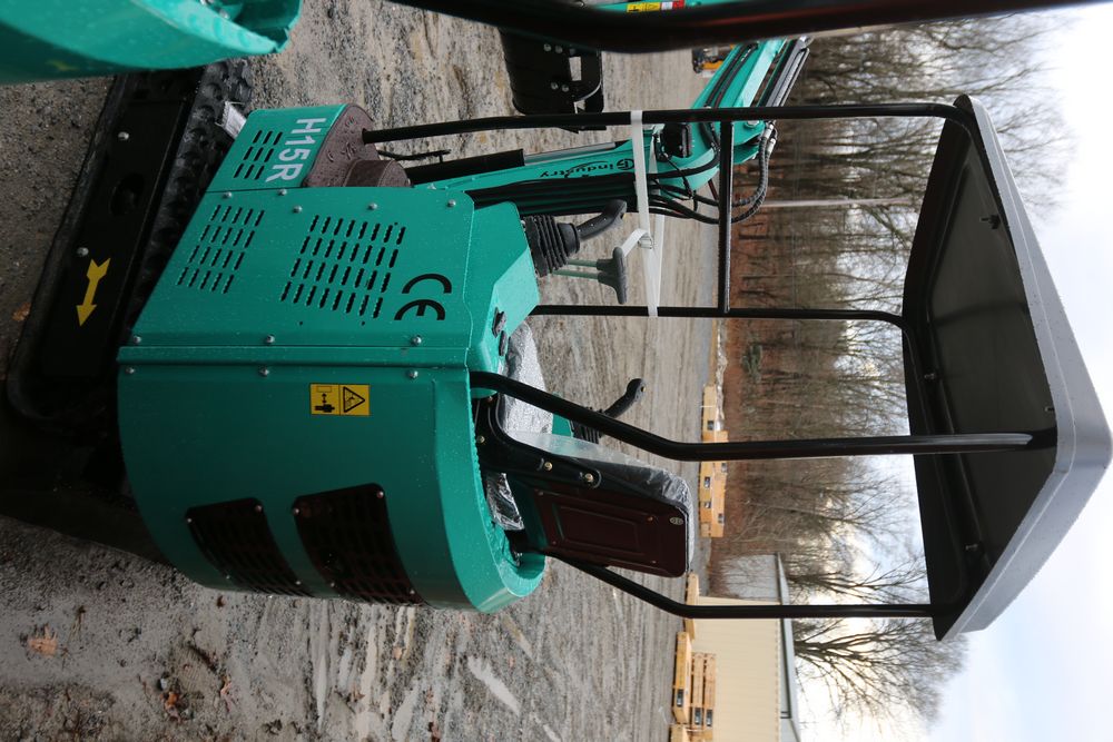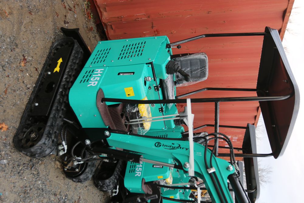 New 2025 CFG Industrial gas powered mini Excavator model H15R with 420cc gasoline engine, bucket, 4' long tracks, 38.5" wide base, 6" wide tracks, canopy, hydraulic boom & bucket controls, pilot system, thumb, dozer blade. Hours reading less than 1 hour.