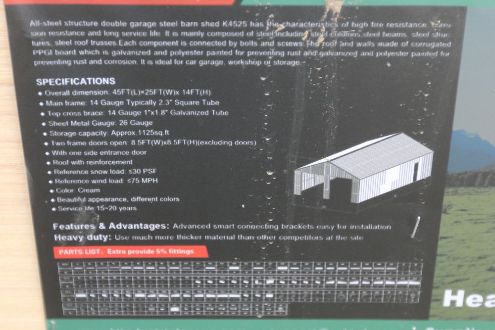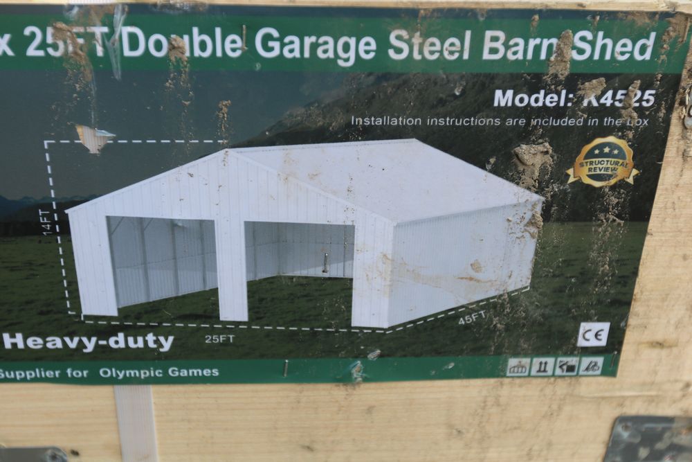 New KJ unused 45ft. x 25ft. double garage steel barn shed model K4525, in wood crate.