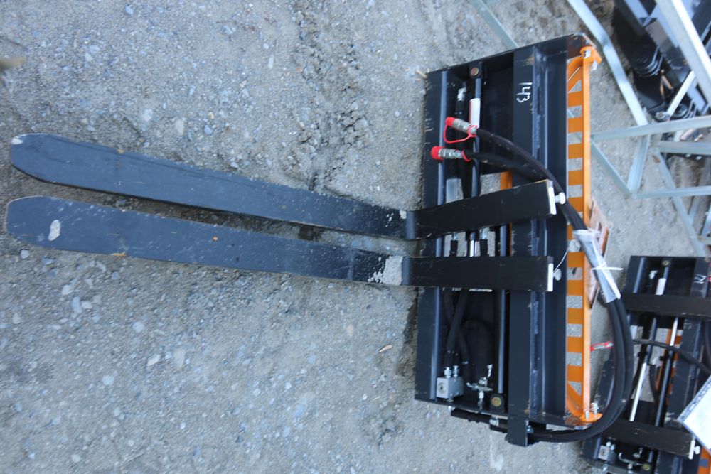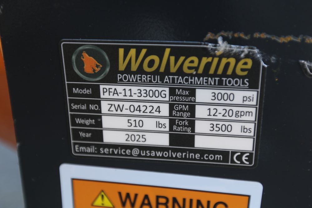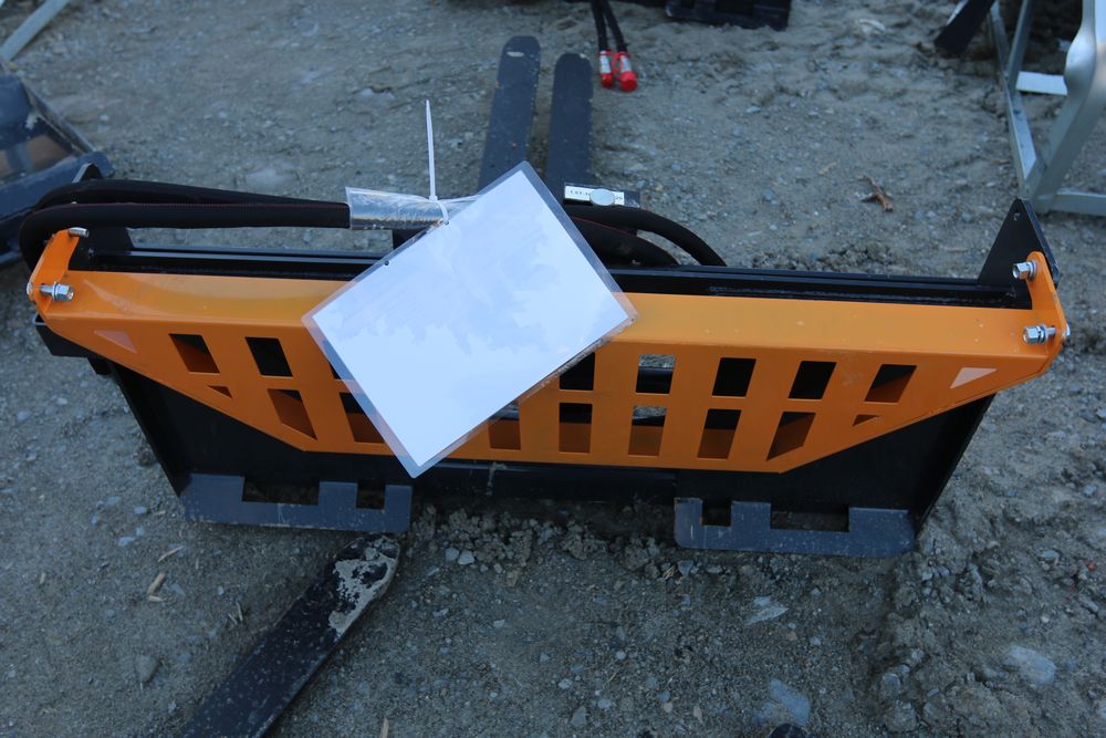 New 2025 Wolverine skid steer pallet fork attachment hydraulic adjustment, model PFA-11-3300G, 48" fork adjustment.