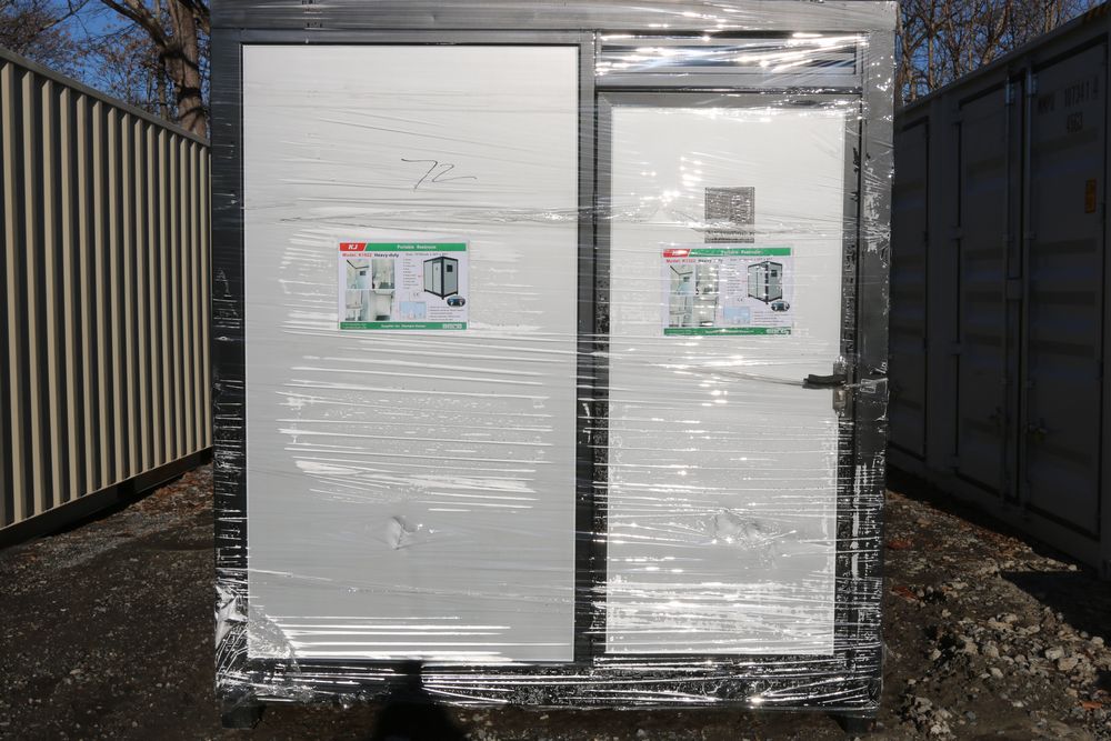 New 2025 KJ portable restroom 7'4" X 5' X 8', includes shower, toilet, toilet brush, sink, window, paper holder, exhaust fan, towel rack, shower curtain, light, model K1522.