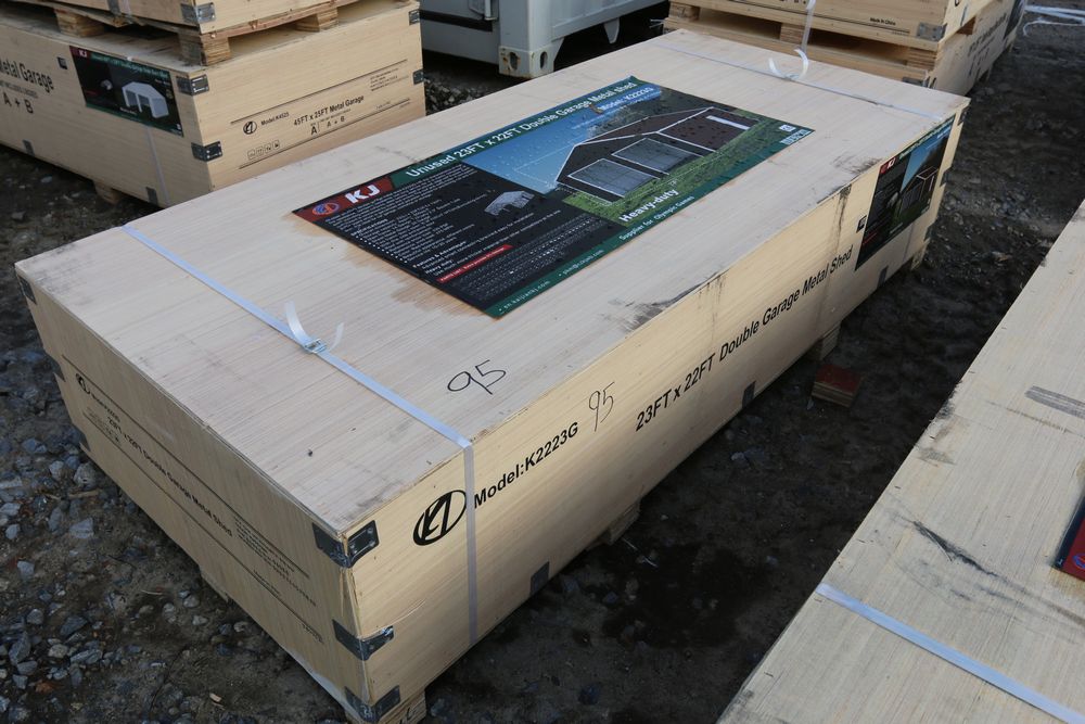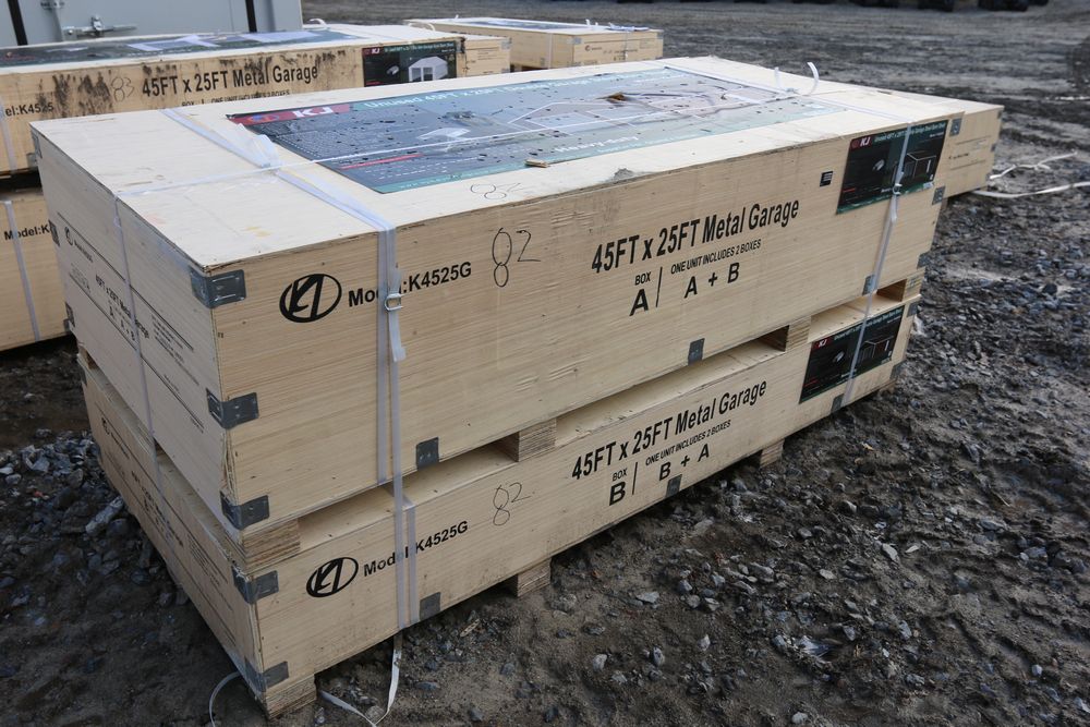 New KJ unused 45ft. x 25ft. double garage steel barn shed model K4525, in wood crate.