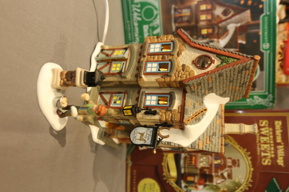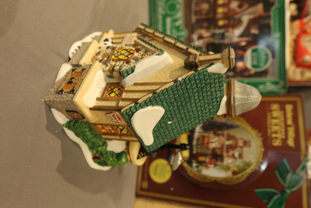 Items are Department 56 Dickens Village Series Buildings & Accessories from one collector. Items include "Stratford Holiday Pies and Tarts"; "Tegan's Toy Shoppe," "Burwickglen Golf Clubhouse," illuminated buildings: Brandon Mill, Devonshire Creamery," "Boar's Bacon & Candied Hams"; Porcelain Buildings & Accessories. Includes "A Christmas Carol" series: "M Fezziwig Warehouse," "Scrooge & Marley," Heritage Village Figurines & Accessories. Includes various figurines like "Not too Fast, Please," "Town Blacksmith," "To the Manor Born"; Village Series and Village Accessories Figurines. Includes "Buyer one for Prosperity," "Backyard Bird Houses,"; holiday decorations: snowmen figurines, holiday-themed trees, Christmas lights & more. Items are located in Pleasant Valley, NY.