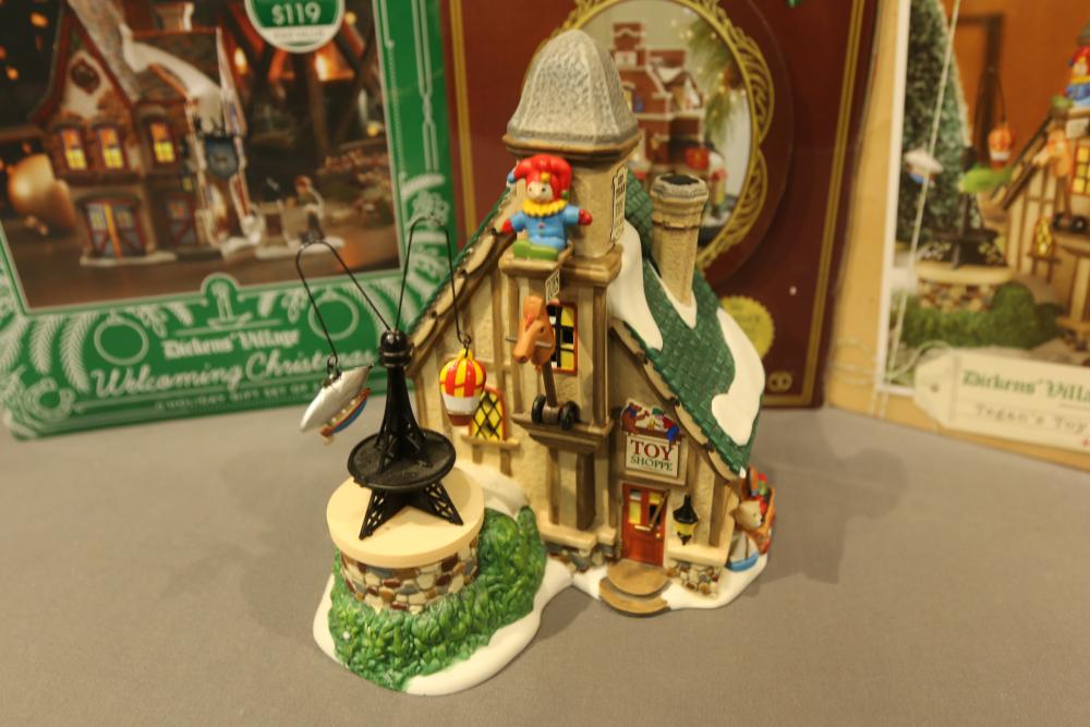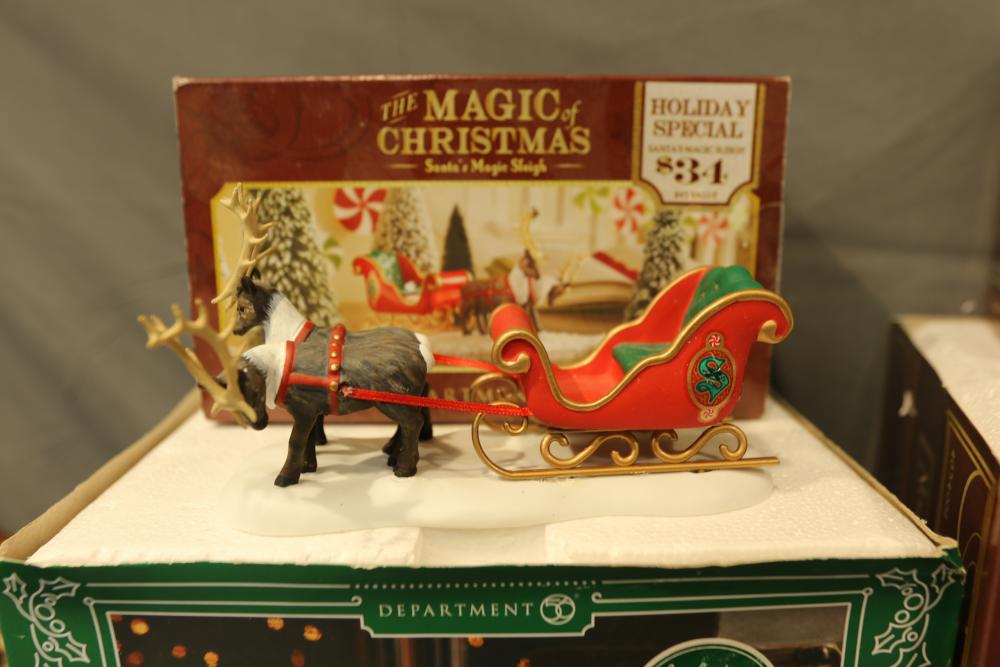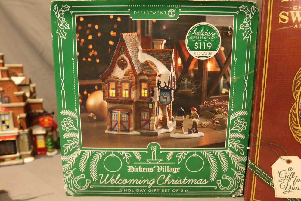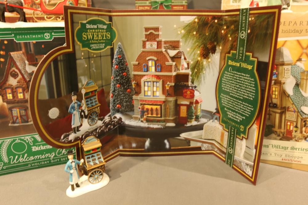 Department 56 Dickens Village Buildings and Accessories with Boxes. Includes "Dickens' Village, Welcoming Christmas," "Tegan's Toy Shoppe," "Tegan's Accessory Set," "The Magic of Christmas, Santa's Magic Sleight," "Sidewalk Sweets," in original boxes. Conditions may vary.