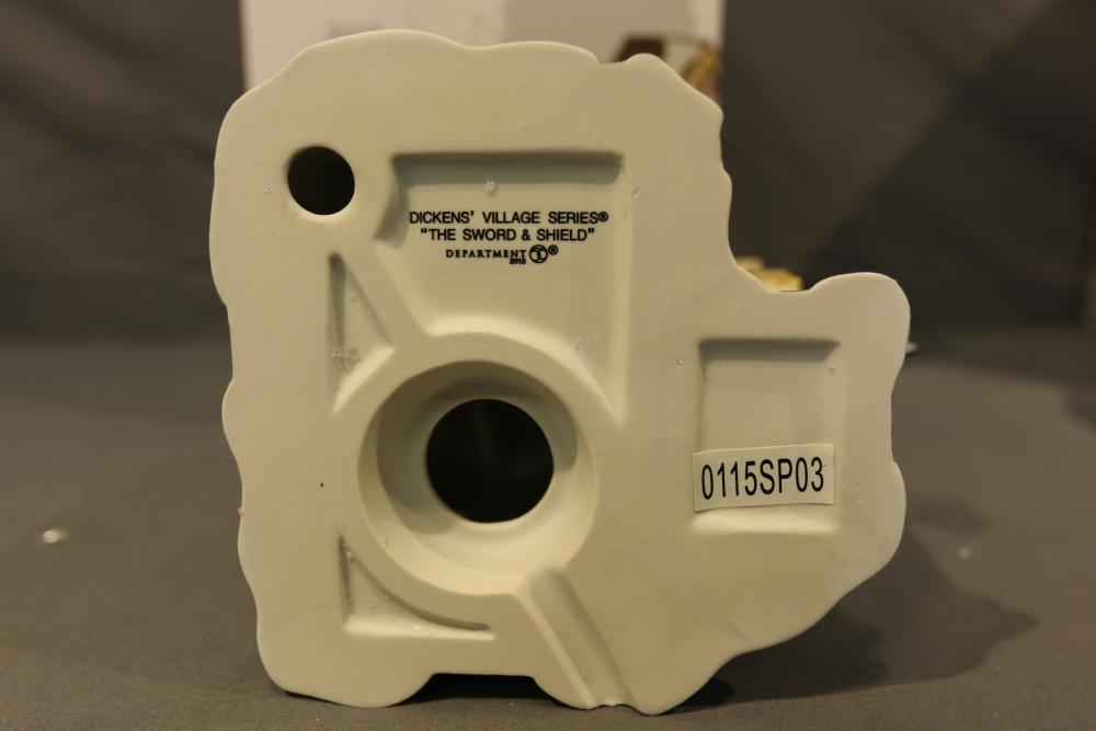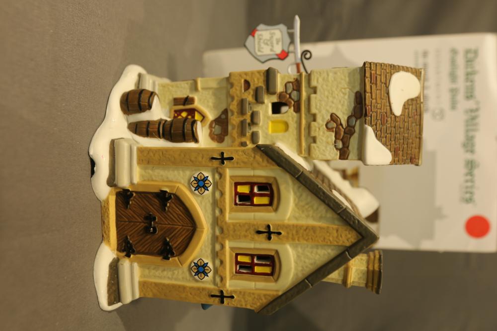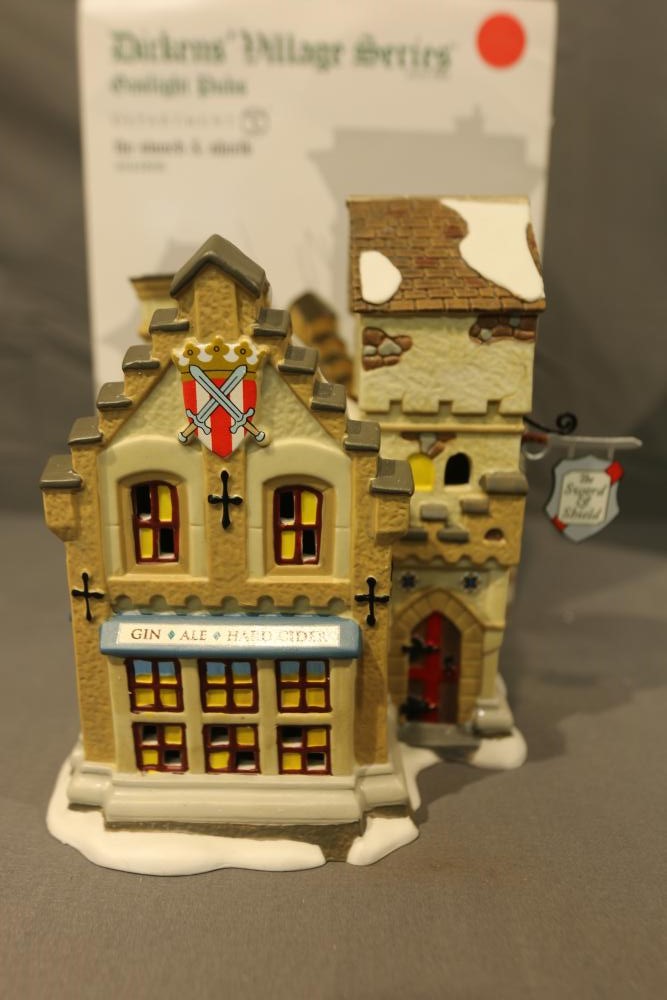 Department 56 Dickens Village Series Buildings and Accessories. Includes "The Sword and Shield" and "Chestnut Brewery" buildings, "Stocking up" and "Chiswick Brewboy" figures with original boxes. Chiswick Brewery figure has damage to roof.