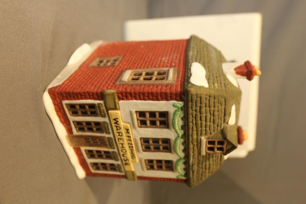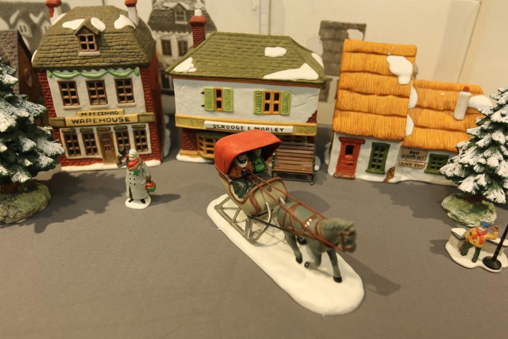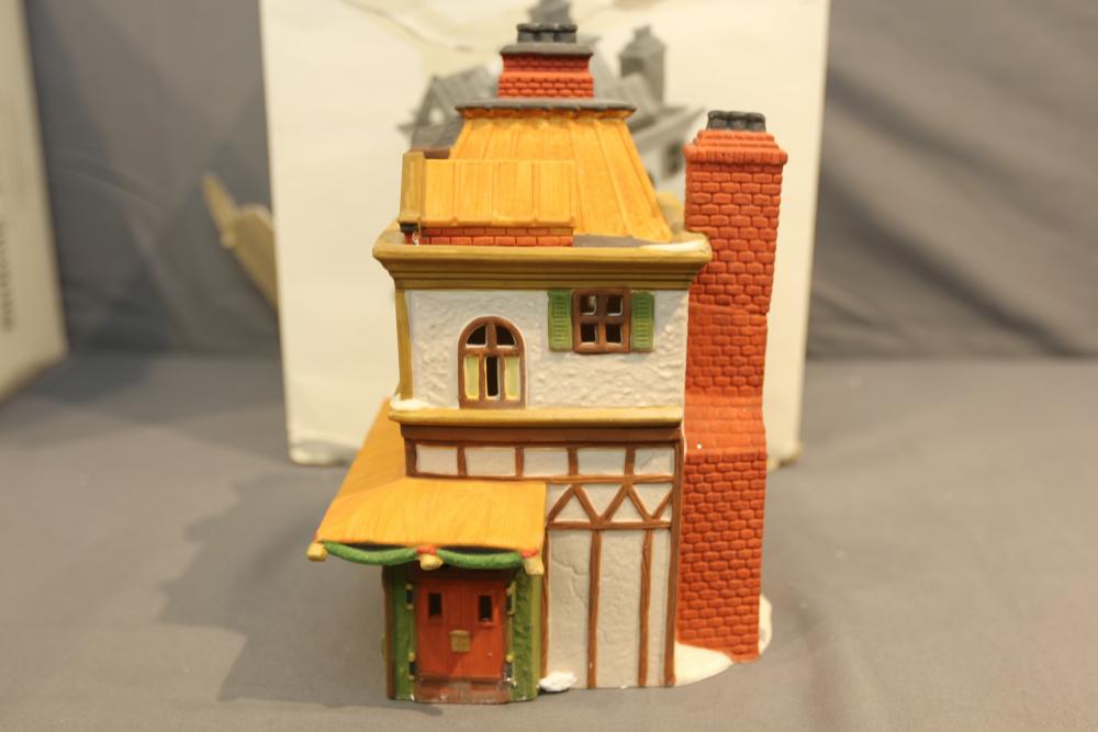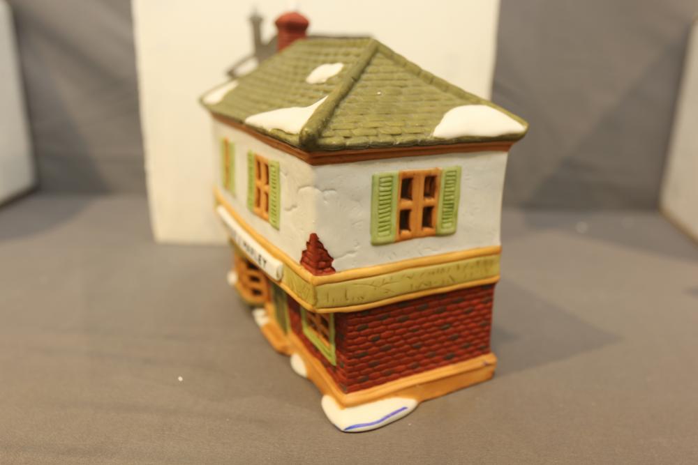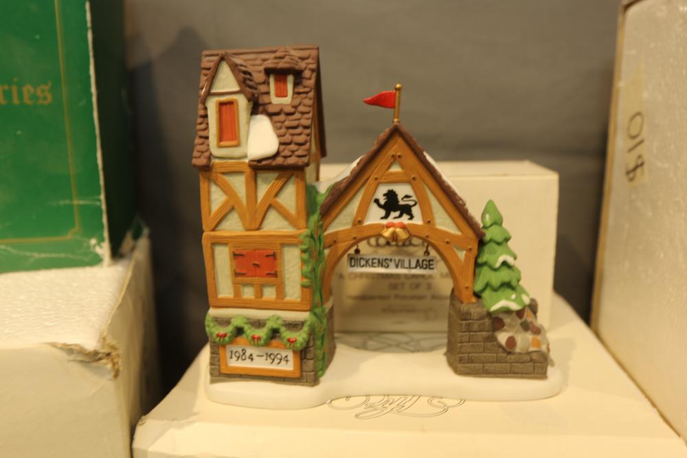 Items are Department 56 Dickens Village Series Buildings & Accessories from one collector. Items include "Stratford Holiday Pies and Tarts"; "Tegan's Toy Shoppe," "Burwickglen Golf Clubhouse," illuminated buildings: Brandon Mill, Devonshire Creamery," "Boar's Bacon & Candied Hams"; Porcelain Buildings & Accessories. Includes "A Christmas Carol" series: "M Fezziwig Warehouse," "Scrooge & Marley," Heritage Village Figurines & Accessories. Includes various figurines like "Not too Fast, Please," "Town Blacksmith," "To the Manor Born"; Village Series and Village Accessories Figurines. Includes "Buyer one for Prosperity," "Backyard Bird Houses,"; holiday decorations: snowmen figurines, holiday-themed trees, Christmas lights & more. Items are located in Pleasant Valley, NY.