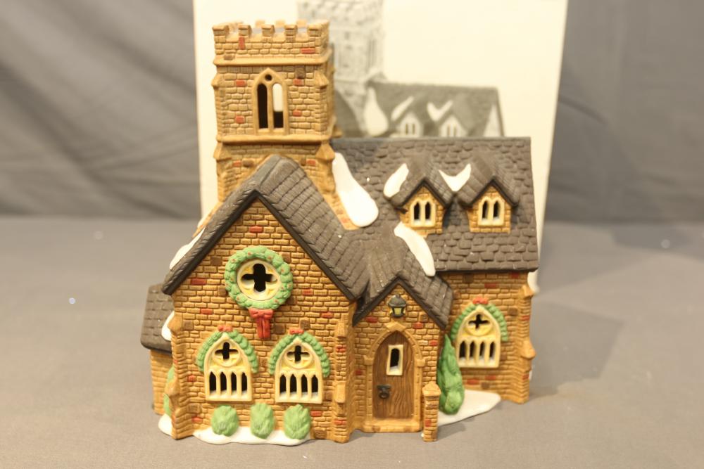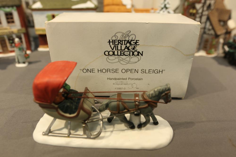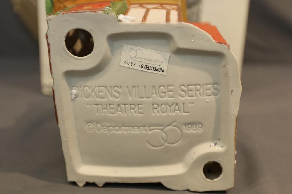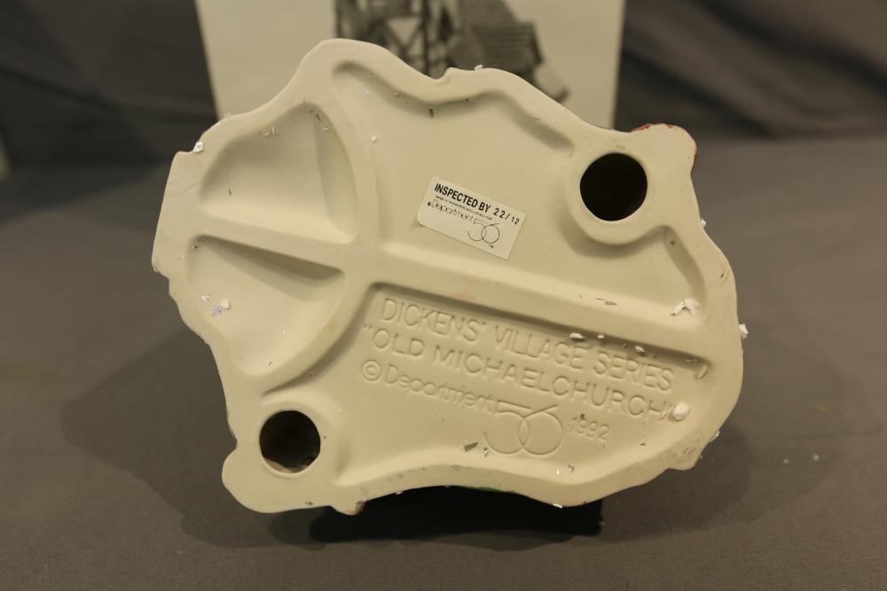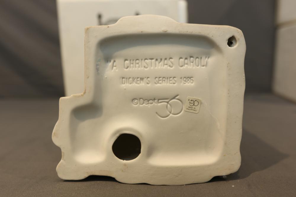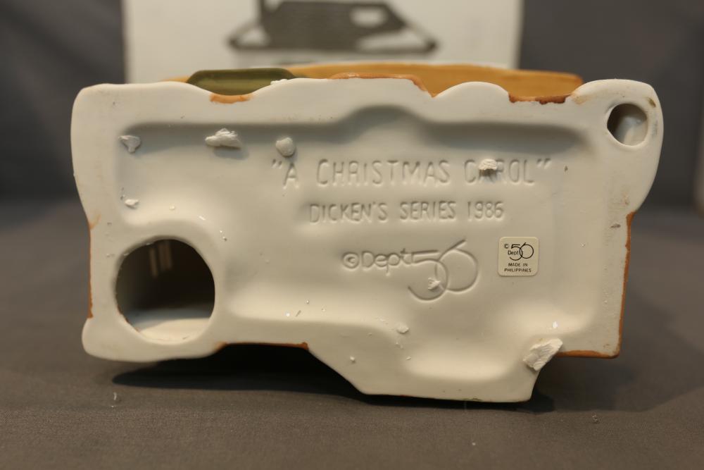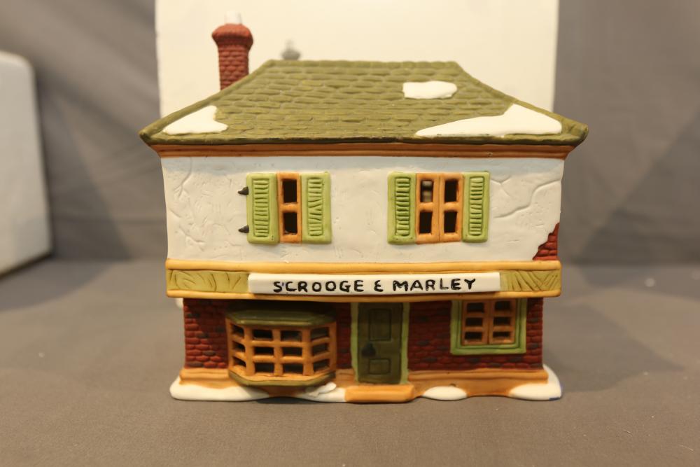 Department 56 Dickens Village Series Porcelain Buildings and Accessories. Includes "A Christmas Carol" series: "M Fezziwig Warehouse," "Scrooge & Marley," and "Bob Cratchit Tiny Tim"; "Theatre Royal," "Knottinghill Church," "Old Michael Church," "Chelsea Market Hat Monger and Cart," and "One Horse Open Sleigh". Original boxess. Conditions may vary.