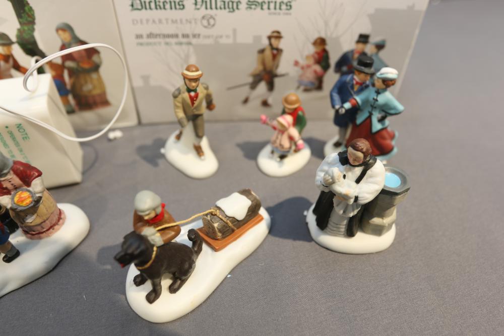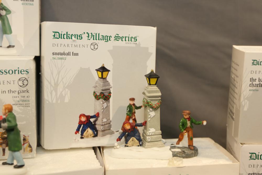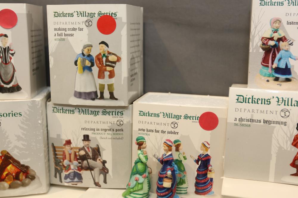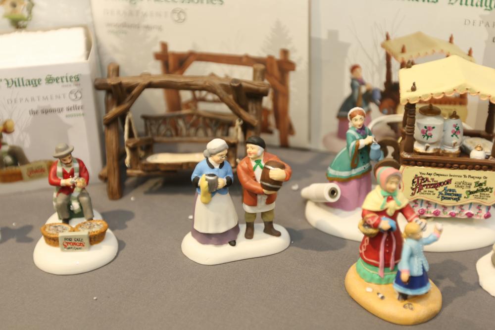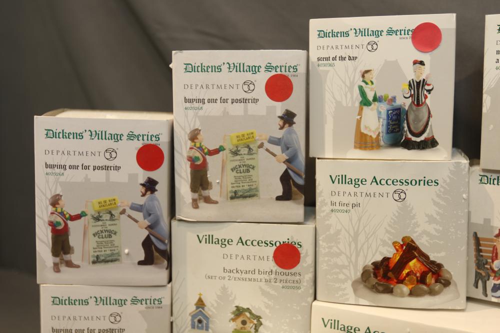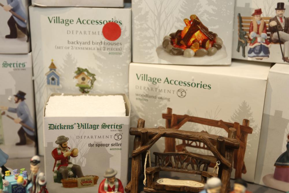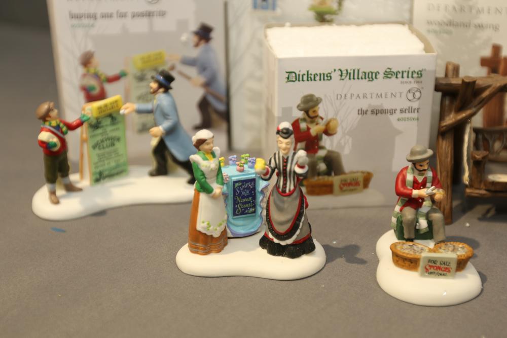 Department 56 Dickens' Village Series and Village Accessories Figurines. Includes "Buyer one for Prosperity," "Backyard Bird Houses," "The Spounge Seller," "Woodland Swing," "Making read for a full house," "New hats for the jubilee," "Relaxing in Regent's Park," etc. Multiples of some. Original boxes. Conditions may vary.