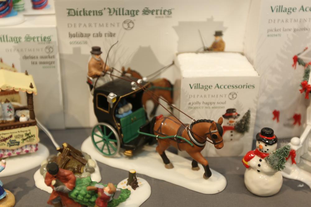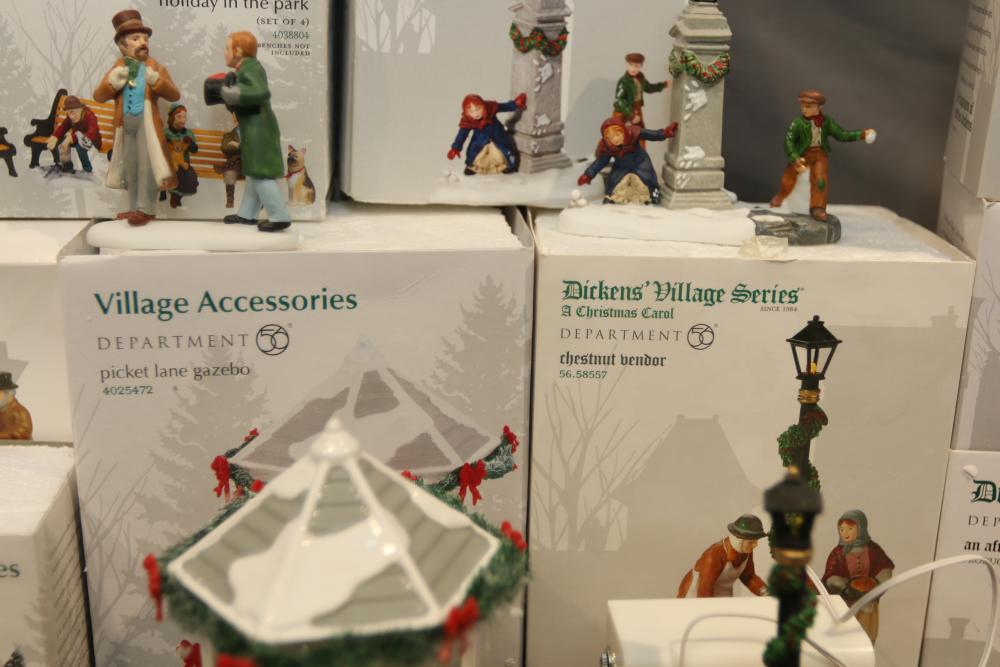 Items are Department 56 Dickens Village Series Buildings & Accessories from one collector. Items include "Stratford Holiday Pies and Tarts"; "Tegan's Toy Shoppe," "Burwickglen Golf Clubhouse," illuminated buildings: Brandon Mill, Devonshire Creamery," "Boar's Bacon & Candied Hams"; Porcelain Buildings & Accessories. Includes "A Christmas Carol" series: "M Fezziwig Warehouse," "Scrooge & Marley," Heritage Village Figurines & Accessories. Includes various figurines like "Not too Fast, Please," "Town Blacksmith," "To the Manor Born"; Village Series and Village Accessories Figurines. Includes "Buyer one for Prosperity," "Backyard Bird Houses,"; holiday decorations: snowmen figurines, holiday-themed trees, Christmas lights & more. Items are located in Pleasant Valley, NY.