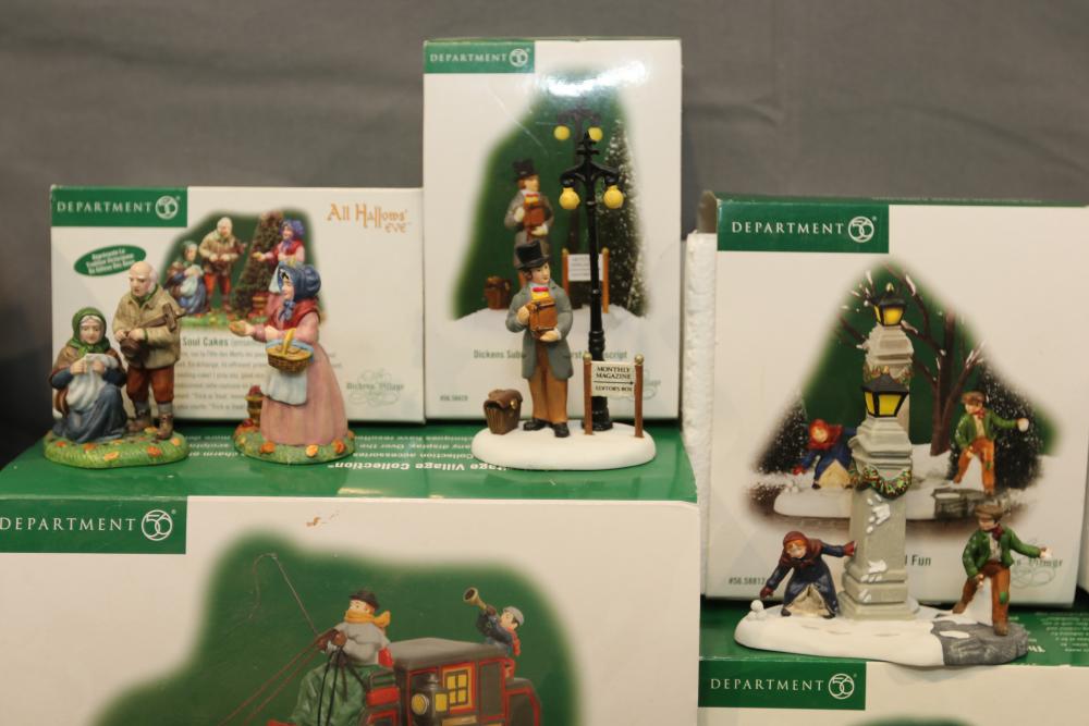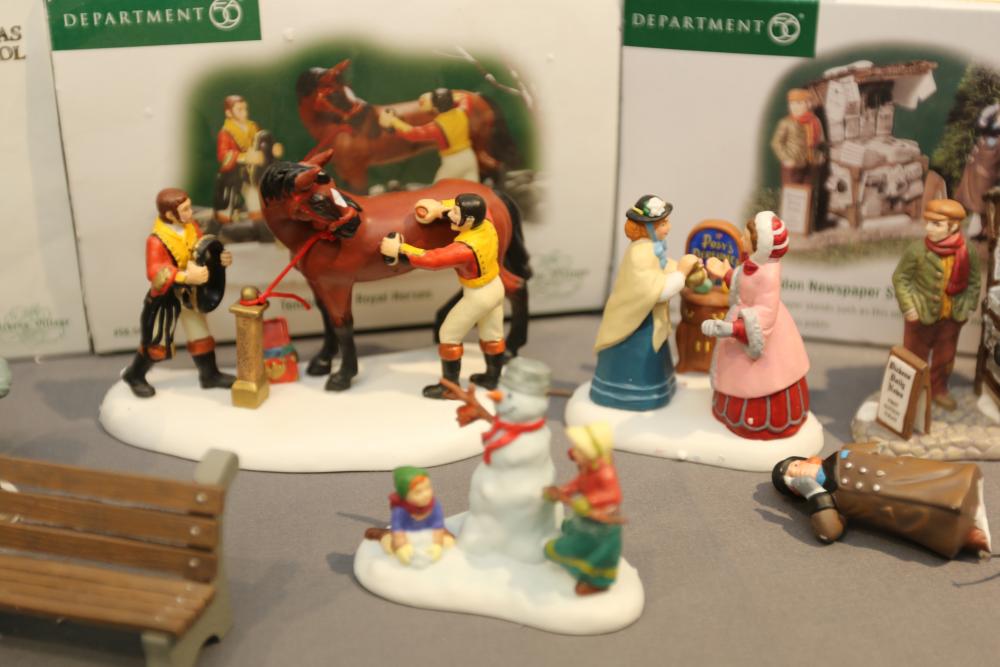 Items are Department 56 Dickens Village Series Buildings & Accessories from one collector. Items include "Stratford Holiday Pies and Tarts"; "Tegan's Toy Shoppe," "Burwickglen Golf Clubhouse," illuminated buildings: Brandon Mill, Devonshire Creamery," "Boar's Bacon & Candied Hams"; Porcelain Buildings & Accessories. Includes "A Christmas Carol" series: "M Fezziwig Warehouse," "Scrooge & Marley," Heritage Village Figurines & Accessories. Includes various figurines like "Not too Fast, Please," "Town Blacksmith," "To the Manor Born"; Village Series and Village Accessories Figurines. Includes "Buyer one for Prosperity," "Backyard Bird Houses,"; holiday decorations: snowmen figurines, holiday-themed trees, Christmas lights & more. Items are located in Pleasant Valley, NY.