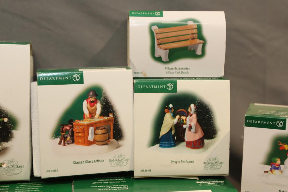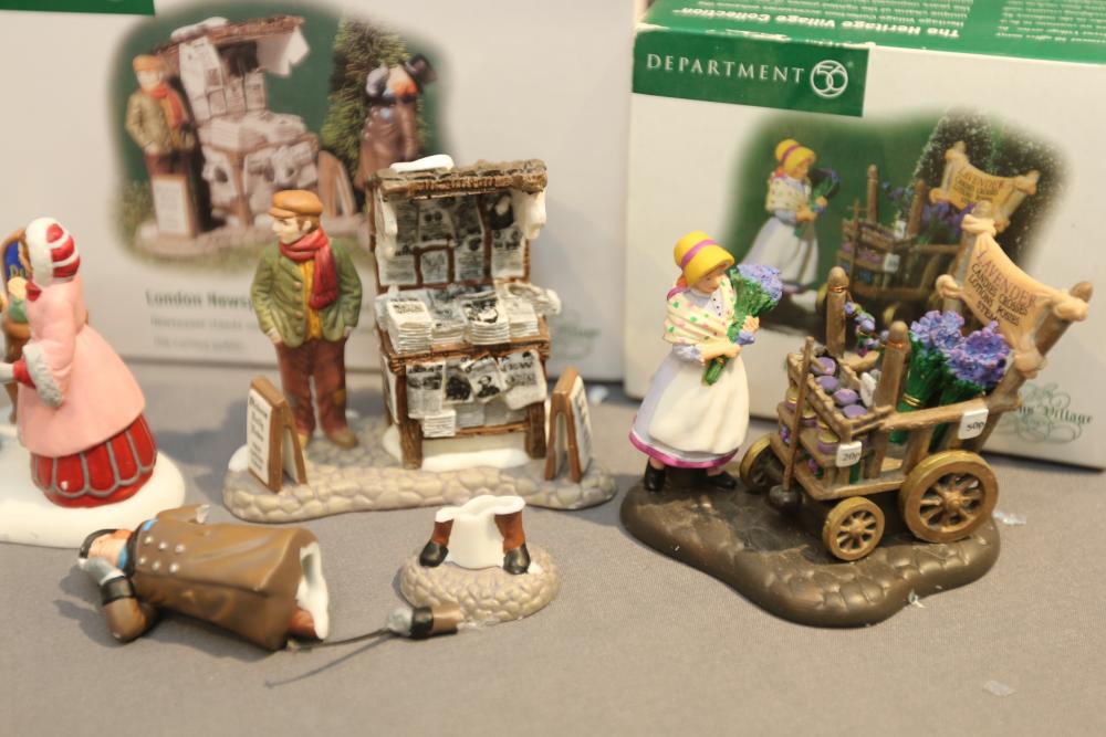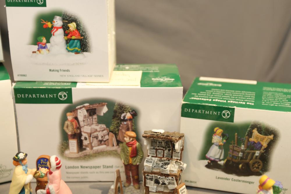 Department 56 Heritage Village Figurines and Accessories. Includes various figurines like "Not too Fast, Please," "Town Blacksmith," "To the Manor Born," "Stained Glass Artisan," "Posy Perfumes," "London Newspaper Stand," etc. Also includes village accessories. Original boxes. Conditions may vary.