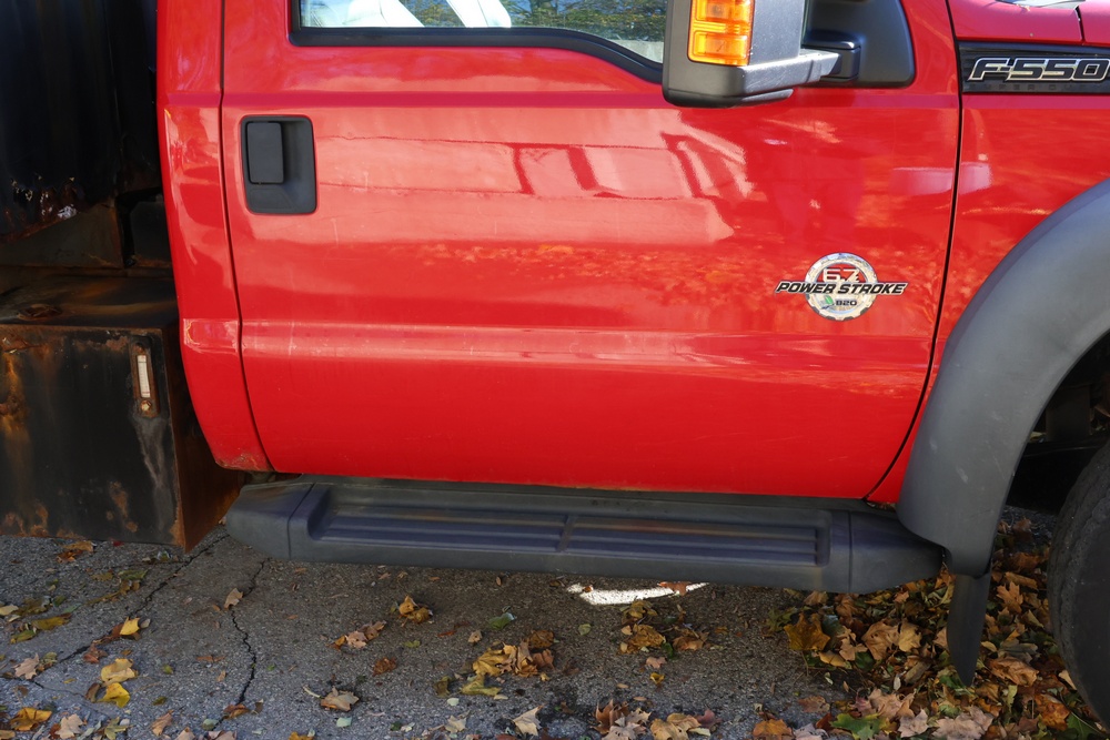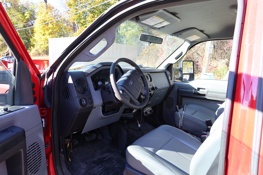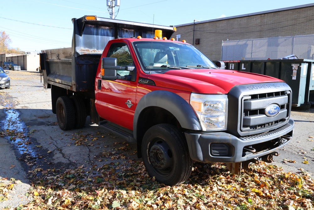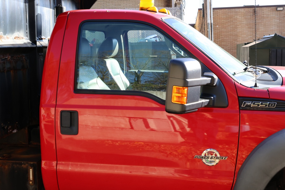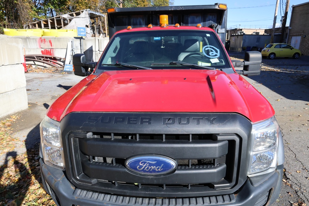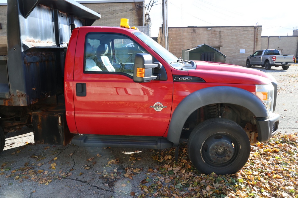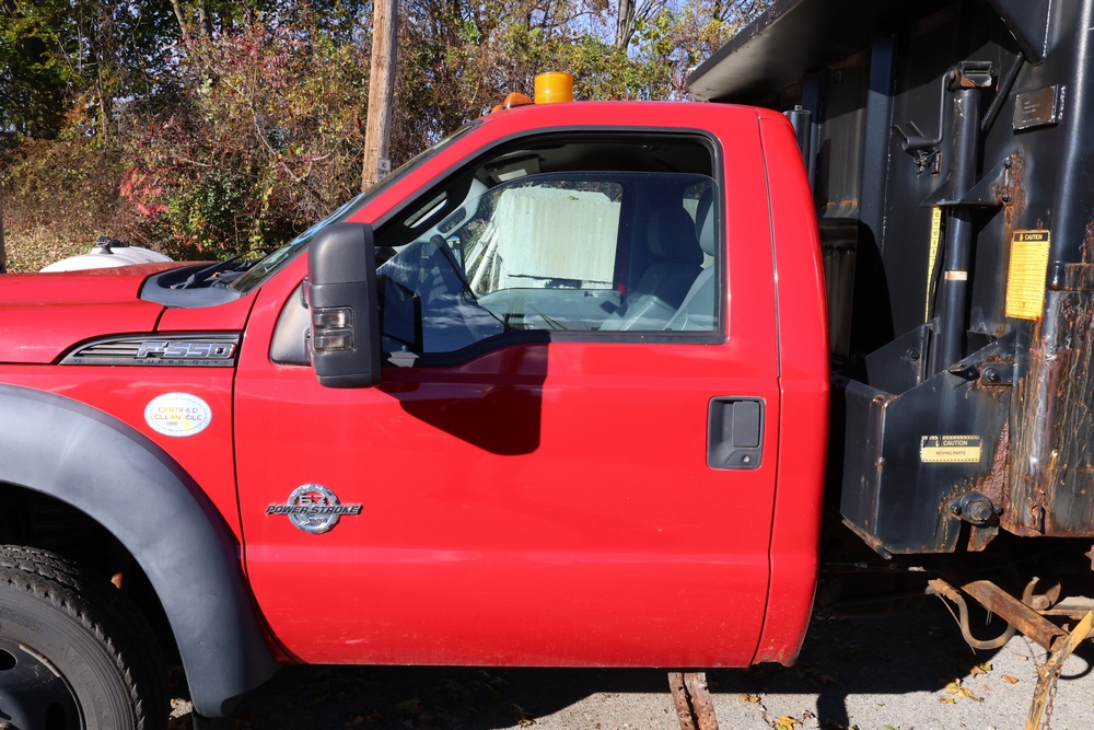 2011 Ford F-550 XL Super Duty dump truck with automatic transmission. VIN: 1FDUF5HT3BEA85817. Odometer reading: 41,788 miles. Exterior: Red cab with black dump body, dual rear wheels, front tow hooks, steel wheels, and amber roof light. Interior: Gray vinyl seat, black and gray dash trim, manual climate controls, factory radio, auxiliary switch panel, PTO and plow control levers, and column shifter. Tire configuration: Dual rear wheels with 225/70R19.5G tires. Additional equipment includes dump bed, PTO system (non-functional per seller), Certified Clean Idle engine badge, and side mirrors with integrated spot mirrors. Title and key available. Seller reports: Runs and drives.