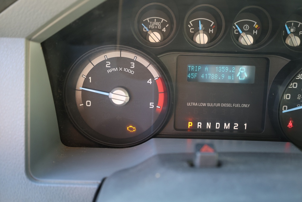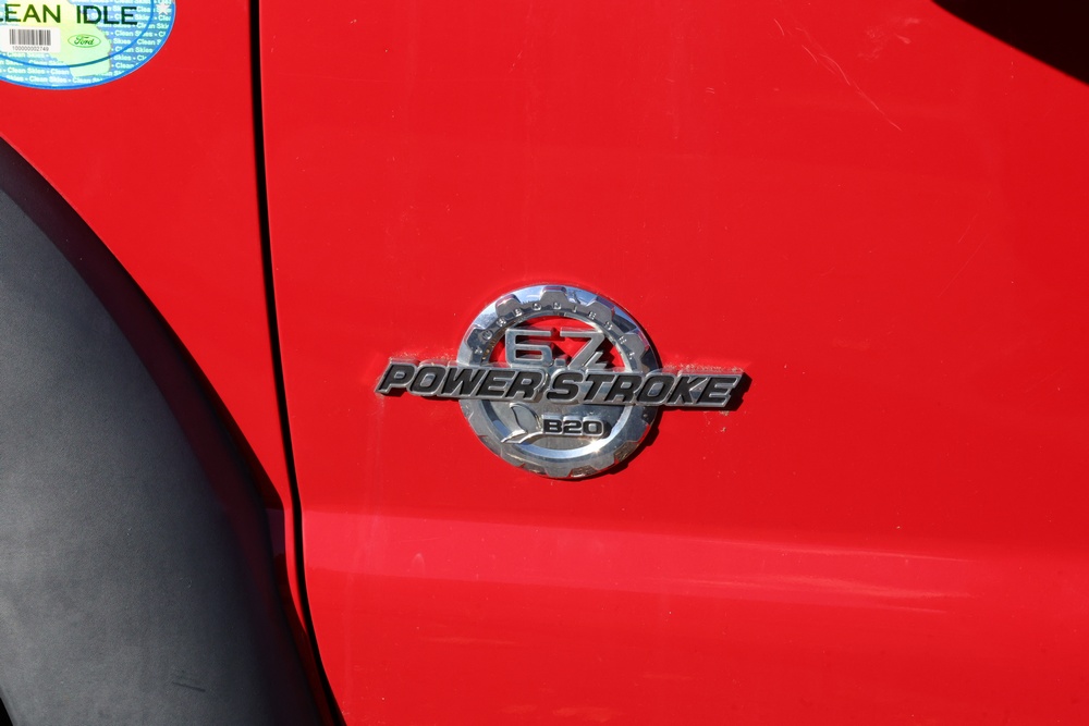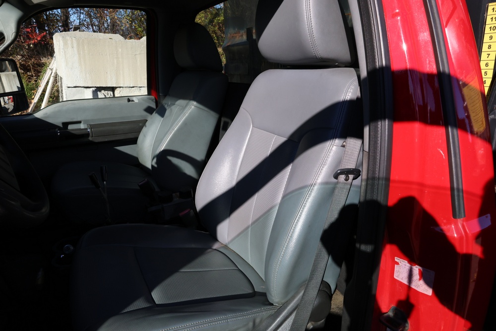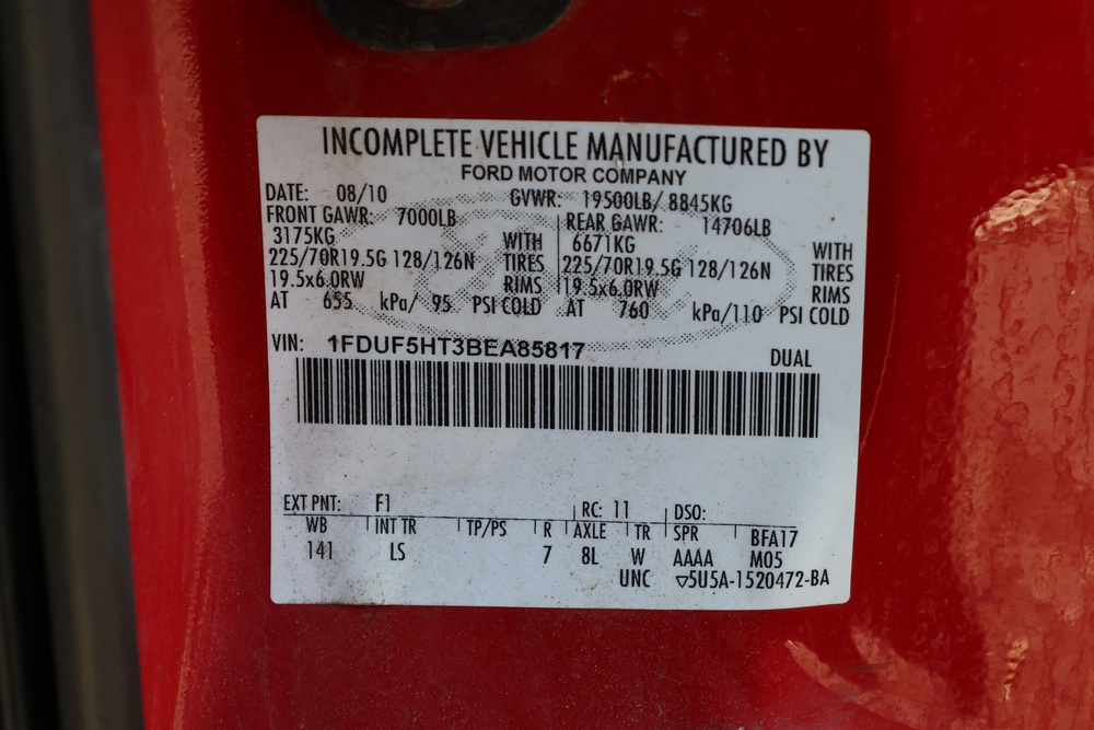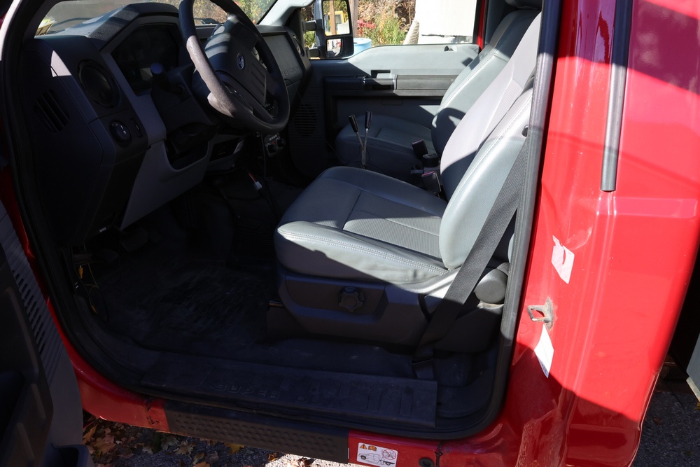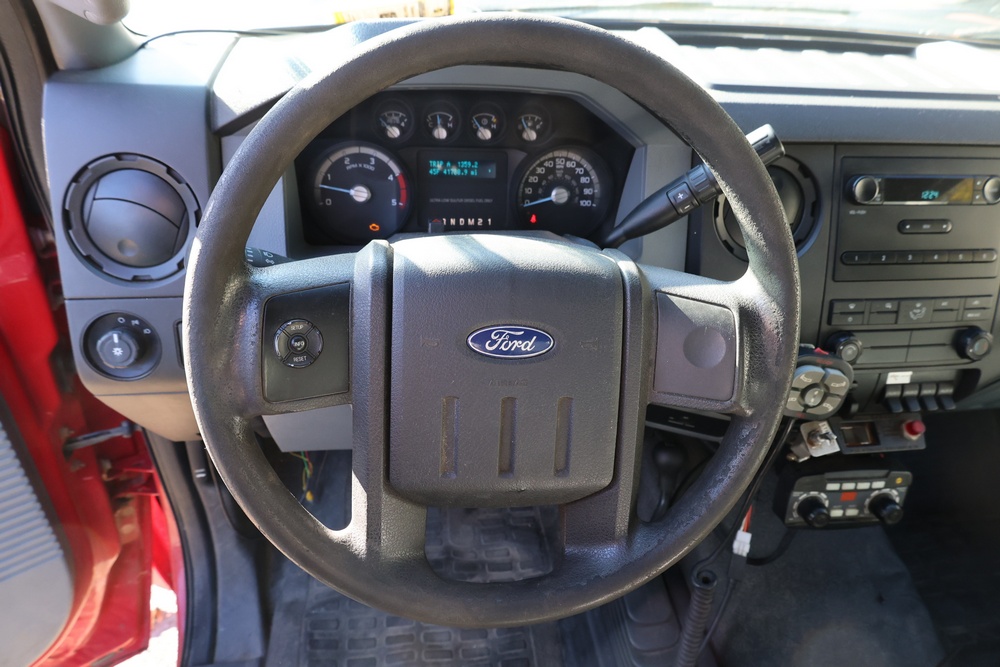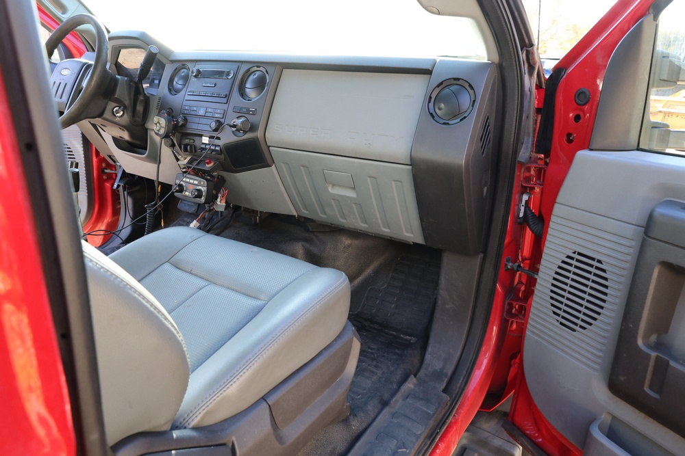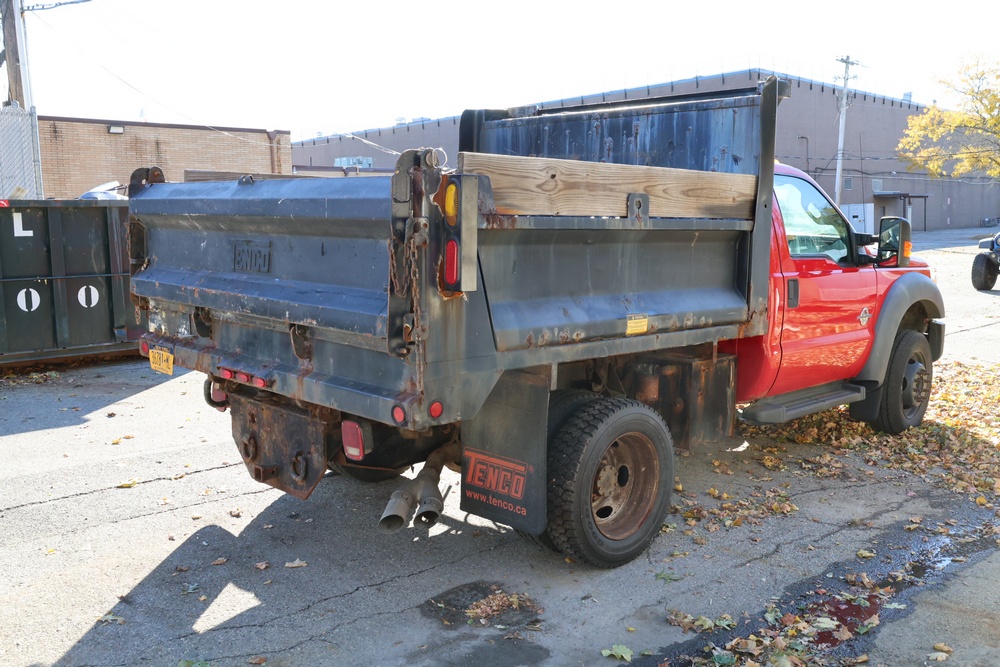 2011 Ford F-550 XL Super Duty dump truck with automatic transmission. VIN: 1FDUF5HT3BEA85817. Odometer reading: 41,788 miles. Exterior: Red cab with black dump body, dual rear wheels, front tow hooks, steel wheels, and amber roof light. Interior: Gray vinyl seat, black and gray dash trim, manual climate controls, factory radio, auxiliary switch panel, PTO and plow control levers, and column shifter. Tire configuration: Dual rear wheels with 225/70R19.5G tires. Additional equipment includes dump bed, PTO system (non-functional per seller), Certified Clean Idle engine badge, and side mirrors with integrated spot mirrors. Title and key available. Seller reports: Runs and drives.