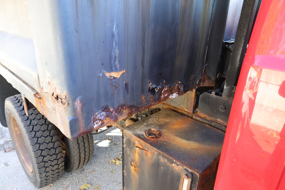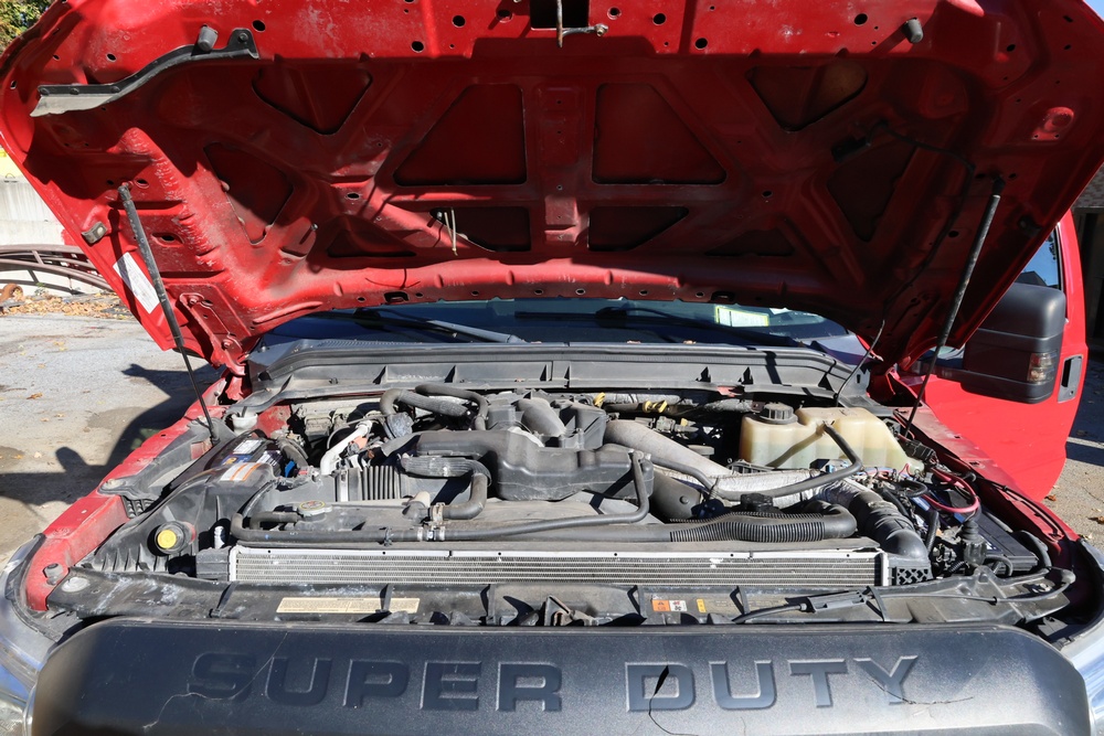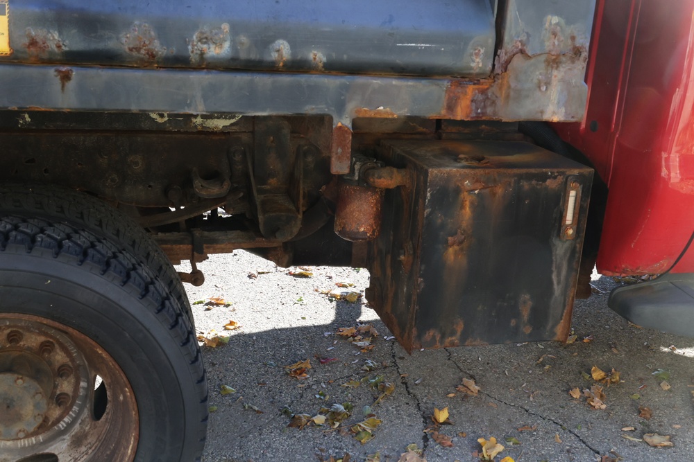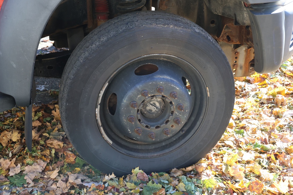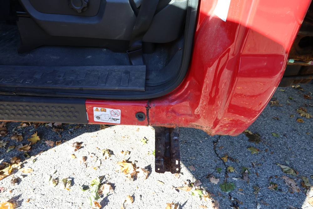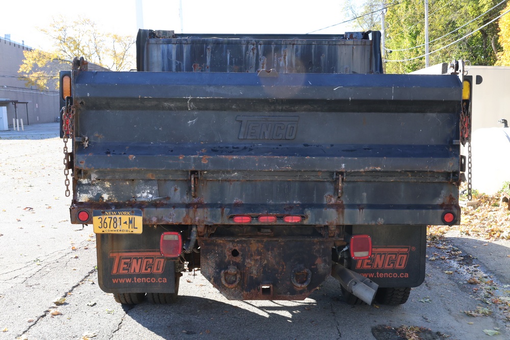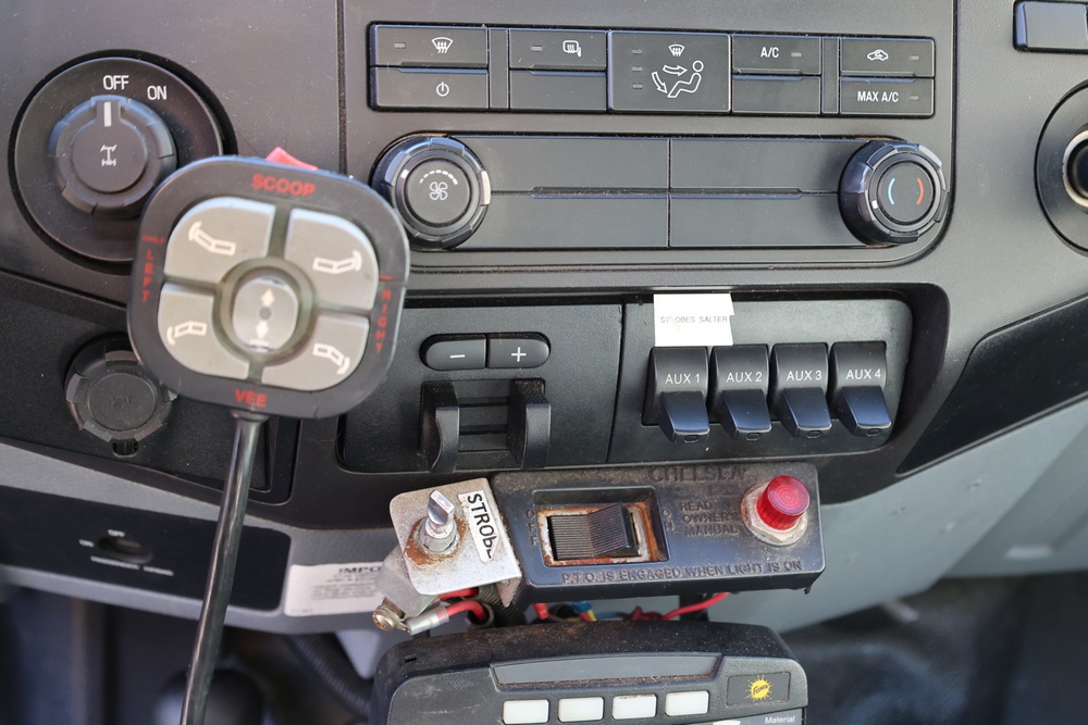 2011 Ford F-550 XL Super Duty dump truck with automatic transmission. VIN: 1FDUF5HT3BEA85817. Odometer reading: 41,788 miles. Exterior: Red cab with black dump body, dual rear wheels, front tow hooks, steel wheels, and amber roof light. Interior: Gray vinyl seat, black and gray dash trim, manual climate controls, factory radio, auxiliary switch panel, PTO and plow control levers, and column shifter. Tire configuration: Dual rear wheels with 225/70R19.5G tires. Additional equipment includes dump bed, PTO system (non-functional per seller), Certified Clean Idle engine badge, and side mirrors with integrated spot mirrors. Title and key available. Seller reports: Runs and drives.