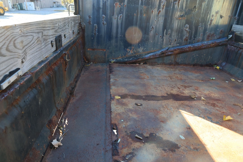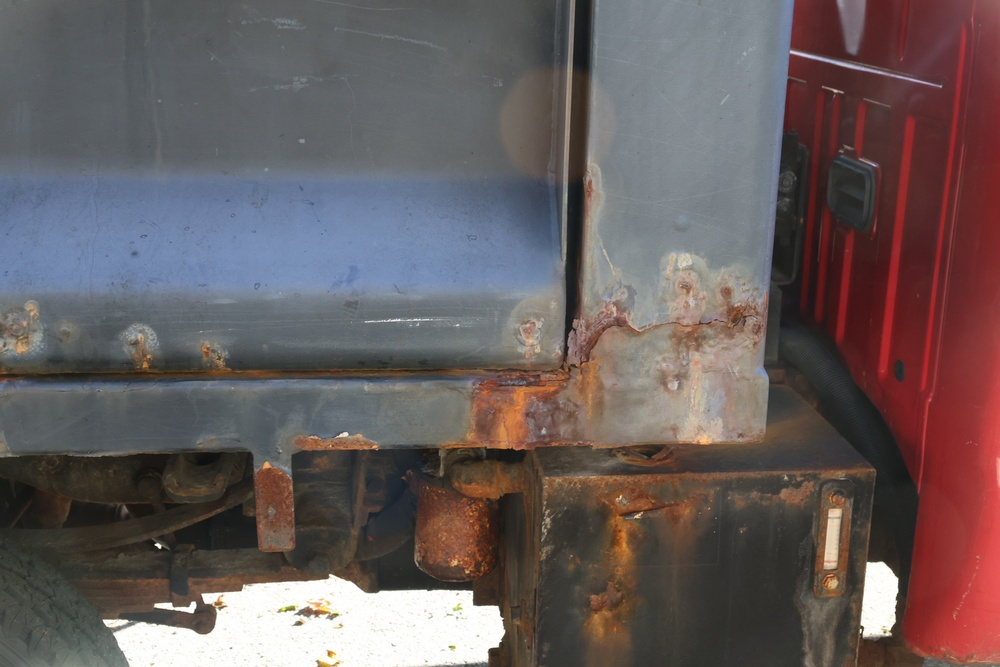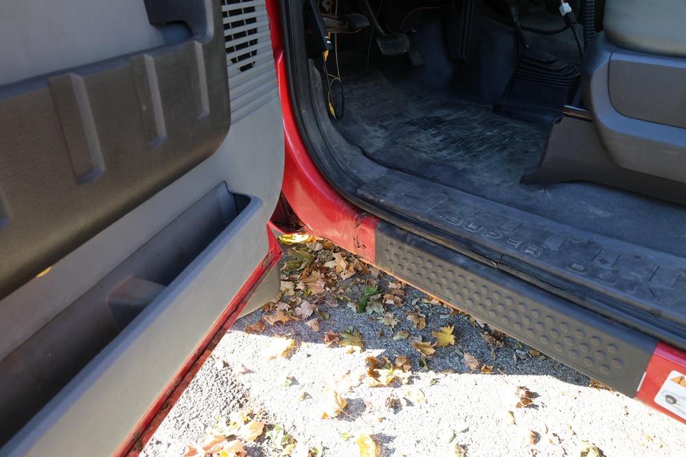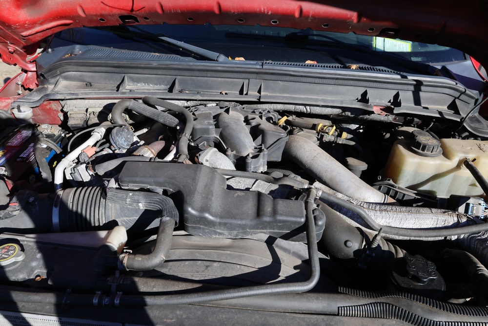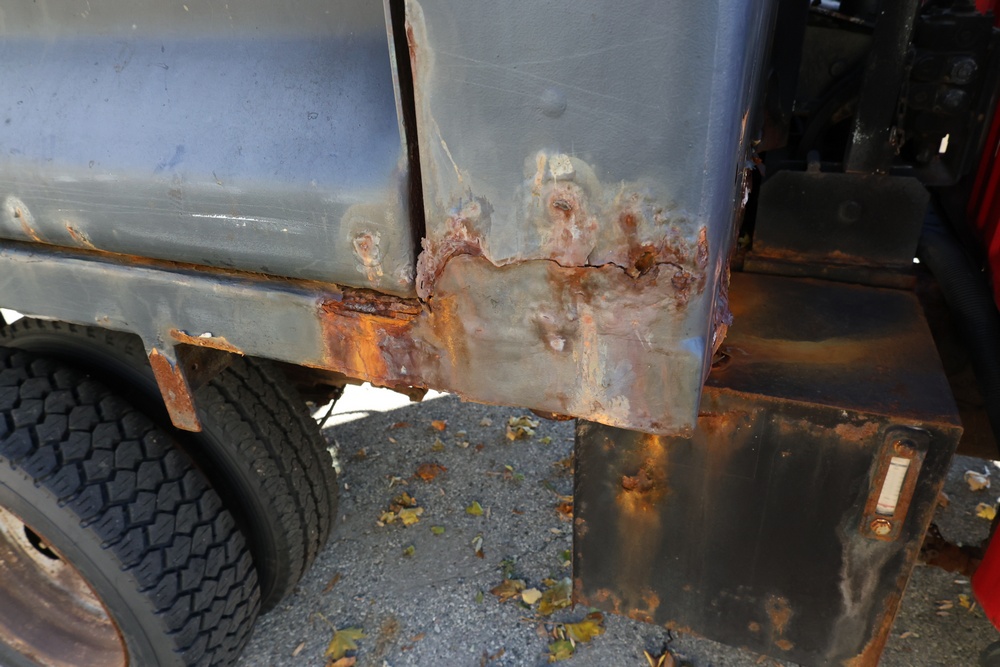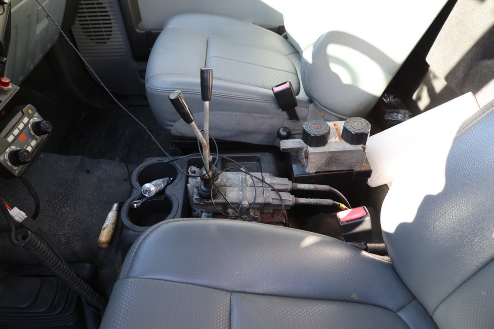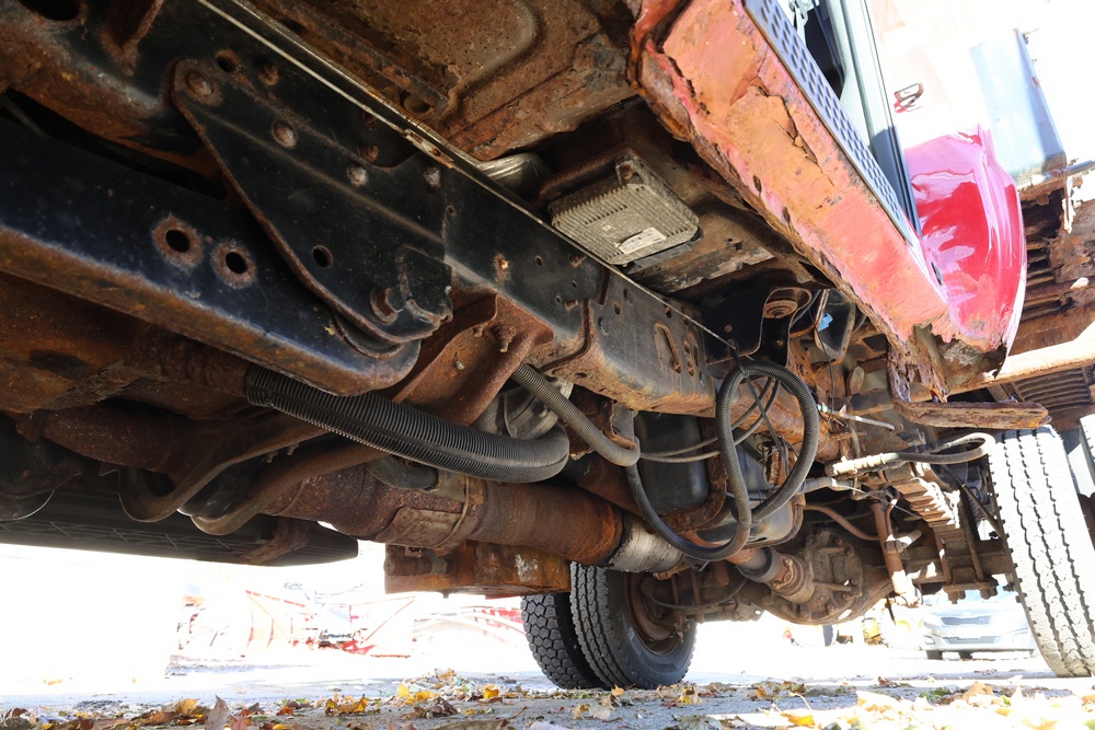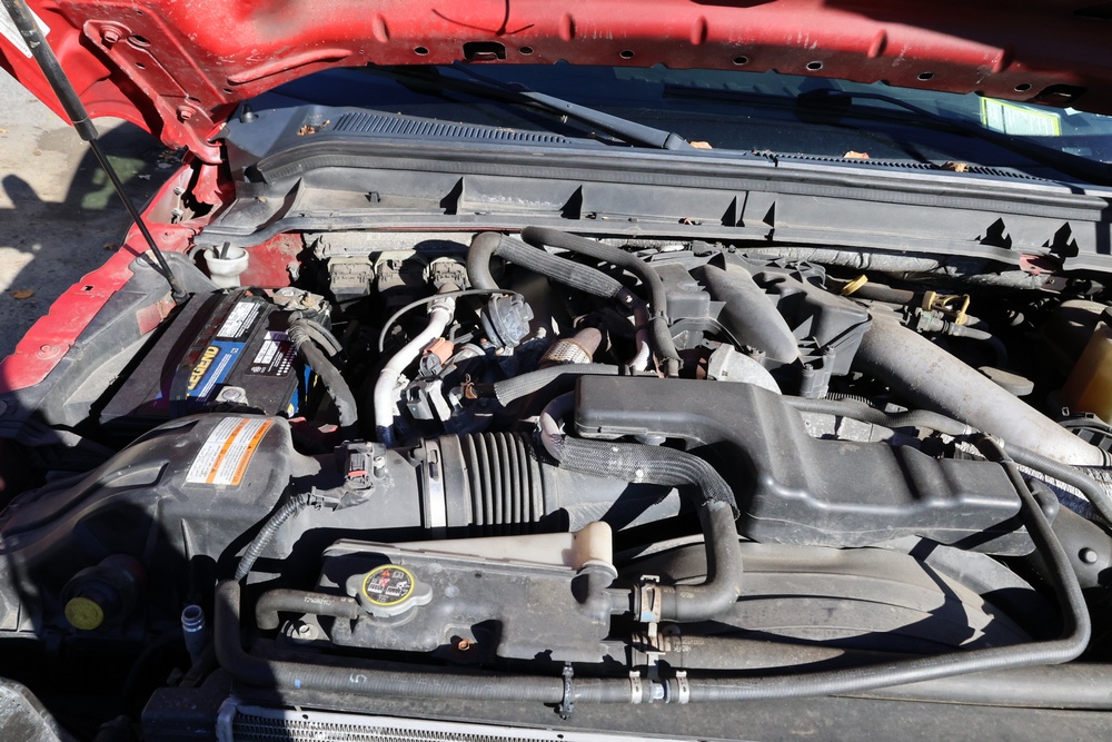 2011 Ford F-550 XL Super Duty dump truck with automatic transmission. VIN: 1FDUF5HT3BEA85817. Odometer reading: 41,788 miles. Exterior: Red cab with black dump body, dual rear wheels, front tow hooks, steel wheels, and amber roof light. Interior: Gray vinyl seat, black and gray dash trim, manual climate controls, factory radio, auxiliary switch panel, PTO and plow control levers, and column shifter. Tire configuration: Dual rear wheels with 225/70R19.5G tires. Additional equipment includes dump bed, PTO system (non-functional per seller), Certified Clean Idle engine badge, and side mirrors with integrated spot mirrors. Title and key available. Seller reports: Runs and drives.