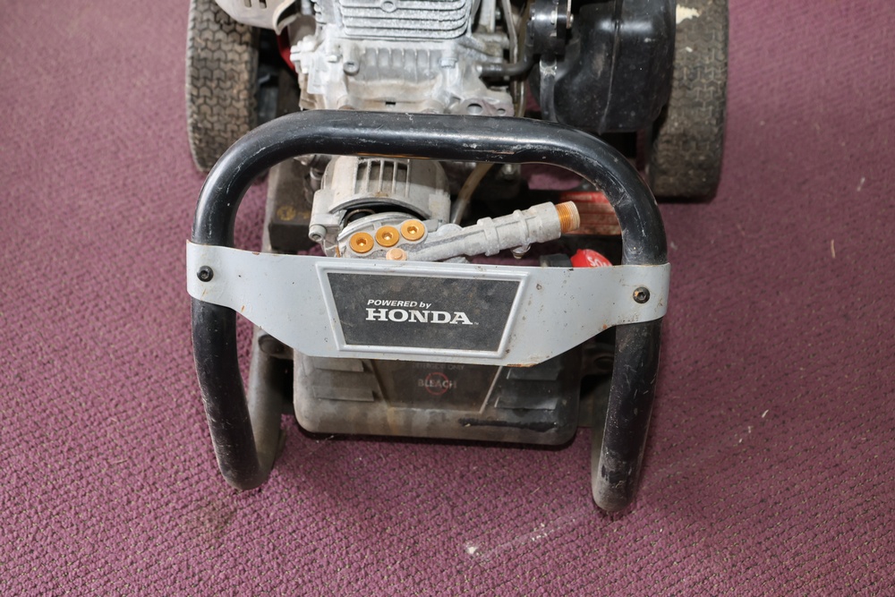 Simpson Premium Pressure Washer rated at 3200 PSI and 2.5 GPM, powered by a Honda GC190 engine (model GC190LA QHGF R280, serial GCAAA-3254021). The unit includes multiple quick-connect spray nozzles. Motor tuns, pump blown.
