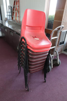 Plastic stacking chairs with metal frames including seven dark red, and two light red.