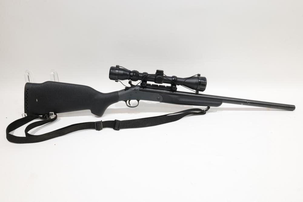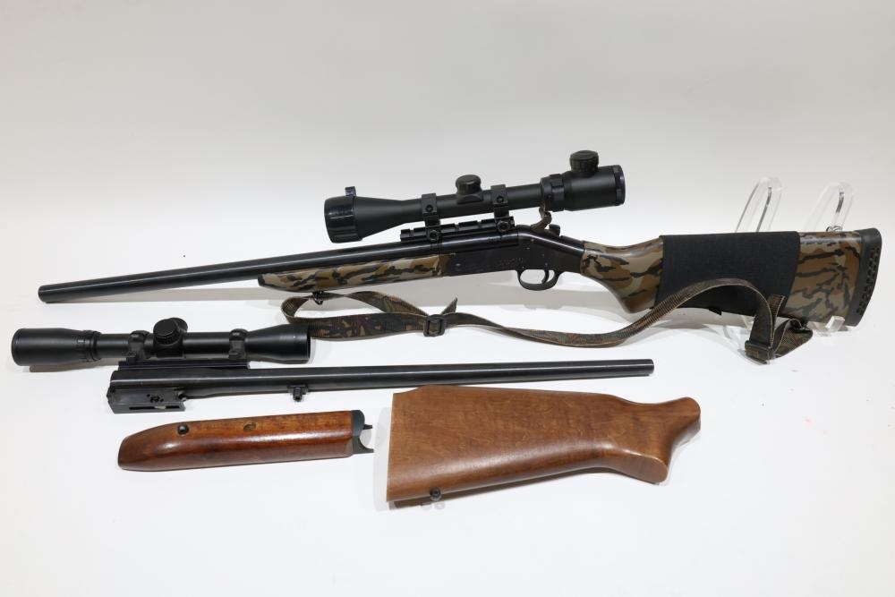 Items include Rossi single-shot rifle chambered in .243 WIN, WesternField M550ABD pump-action shotgun chambered in 12 GA, New Englander Thompson/Center Arms black powder rifle chambered in .50 CAL, Stevens Model 67 Series E Savage Arms pump-action shotgun chambered in 20 GA, Harrington & Richardson Topper Model 158 break-action (single-shot) shotgun chambered in 410 GA, Marlin Model 25MN bolt-action rifle chambered in .22 W.M.R., Winchester Model 190 semi-automatic rifle chambered in .22 L or L.R., Sears & Roebuck J.C. Higgins Model 583.14 bolt-action shotgun chambered in 16 GA, etc. Items are located in Pleasant Valley, NY.