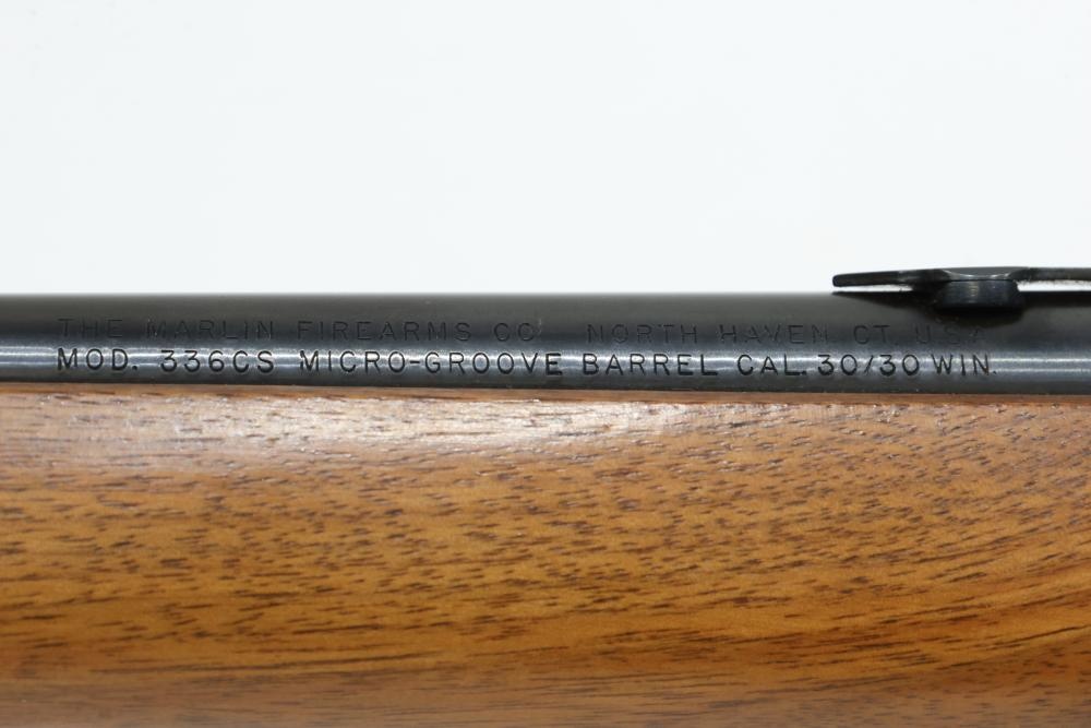 Marlin Model 336CS lever-action rifle chambered in .30-30 WIN, featuring a Micro-Groove barrel, with wooden stock. Serial Number 17055182. All lots are subject to all applicable laws at the time of transfer. NOTE: Semi automatic rifles and all handguns require a license in NYS. There is a $35 transfer fee per long gun. There is a $40 transfer fee per hand gun. There is a $20 transfer fee per ammunition lot. If you fail the background check, the transfer fee still applies, and you are still required to make payment and then reconsign the lot to auction. FFL dealers are not exempt from these fees. A background check will be required for all buyers purchasing a firearm and/or ammunition. NYS charges a background check fee for all firearms and ammunition. The fee is $9 for firearms and $2.50 for ammunition. The NYS fee is per background check NOT per lot, will be collected directly by Civil Armory, and is in addition to any transfer All lots are subject to all applicable laws at the time of transfer. NOTE: Semi automatic rifles and all handguns require a license in NYS. There is a $35 transfer fee per long gun. There is a $40 transfer fee per hand gun. There is a $20 transfer fee per ammunition lot. If you fail the background check, the transfer fee still applies, and you are still required to make payment and then reconsign the lot to auction. FFL dealers are not exempt from these fees. A background check will be required for all buyers purchasing a firearm and/or ammunition. NYS charges a background check fee for all firearms and ammunition. The fee is $9 for firearms and $2.50 for ammunition. The NYS fee is per background check NOT per lot, will be collected directly by Civil Armory, and is in addition to any transfer