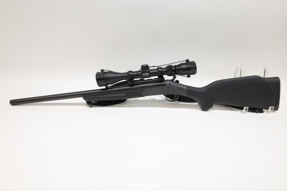 New England Firearms Sportster break-action rifle chambered in .17 HMR, featuring a black synthetic stock with rubber recoil pad and a mounted Weaver optic. Serial Number NS245896. All lots are subject to all applicable laws at the time of transfer. NOTE: Semi automatic rifles and all handguns require a license in NYS. There is a $35 transfer fee per long gun. There is a $40 transfer fee per hand gun. There is a $20 transfer fee per ammunition lot. If you fail the background check, the transfer fee still applies, and you are still required to make payment and then reconsign the lot to auction. FFL dealers are not exempt from these fees. A background check will be required for all buyers purchasing a firearm and/or ammunition. NYS charges a background check fee for all firearms and ammunition. The fee is $9 for firearms and $2.50 for ammunition. The NYS fee is per background check NOT per lot, will be collected directly by Civil Armory, and is in addition to transfer fees. All lots are subject to all applicable laws at the time of transfer. NOTE: Semi automatic rifles and all handguns require a license in NYS. There is a $35 transfer fee per long gun. There is a $40 transfer fee per hand gun. There is a $20 transfer fee per ammunition lot. If you fail the background check, the transfer fee still applies, and you are still required to make payment and then reconsign the lot to auction. FFL dealers are not exempt from these fees. A background check will be required for all buyers purchasing a firearm and/or ammunition. NYS charges a background check fee for all firearms and ammunition. The fee is $9 for firearms and $2.50 for ammunition. The NYS fee is per background check NOT per lot, will be collected directly by Civil Armory, and is in addition to transfer fees.