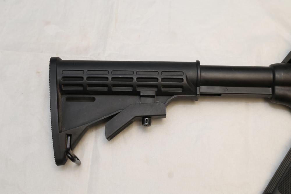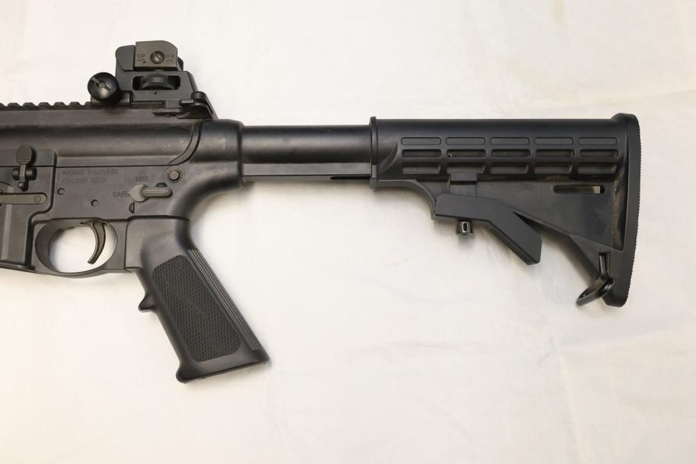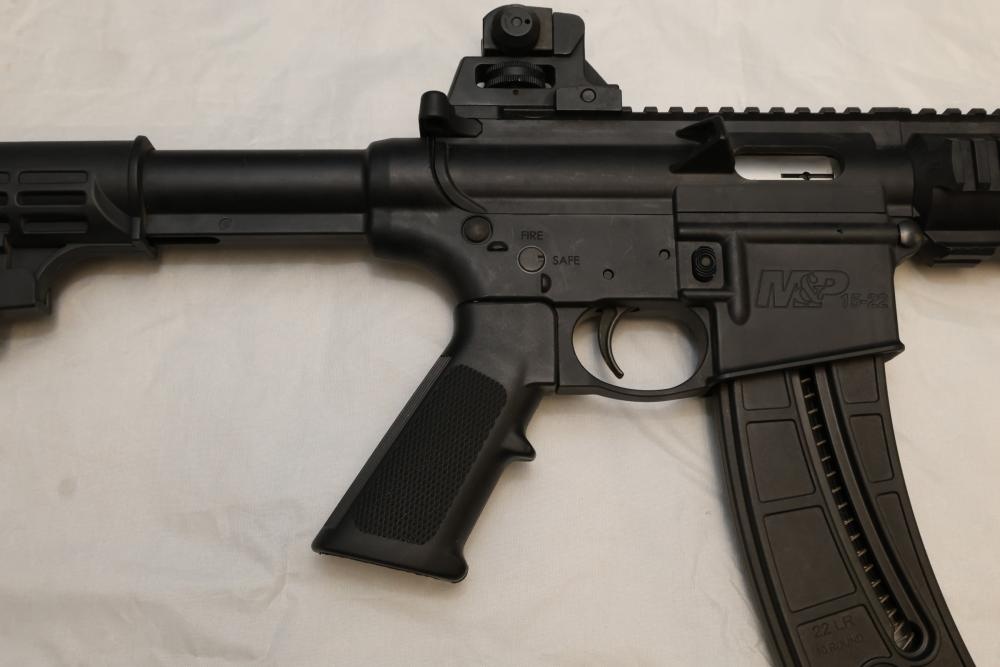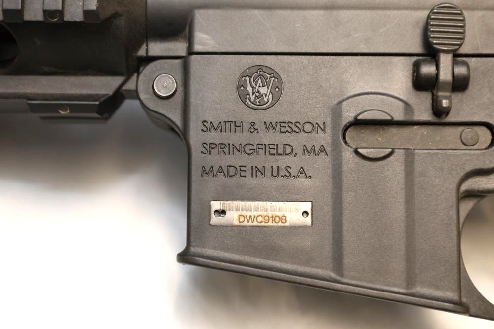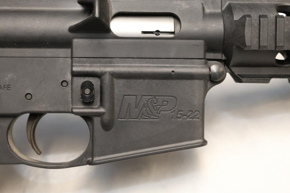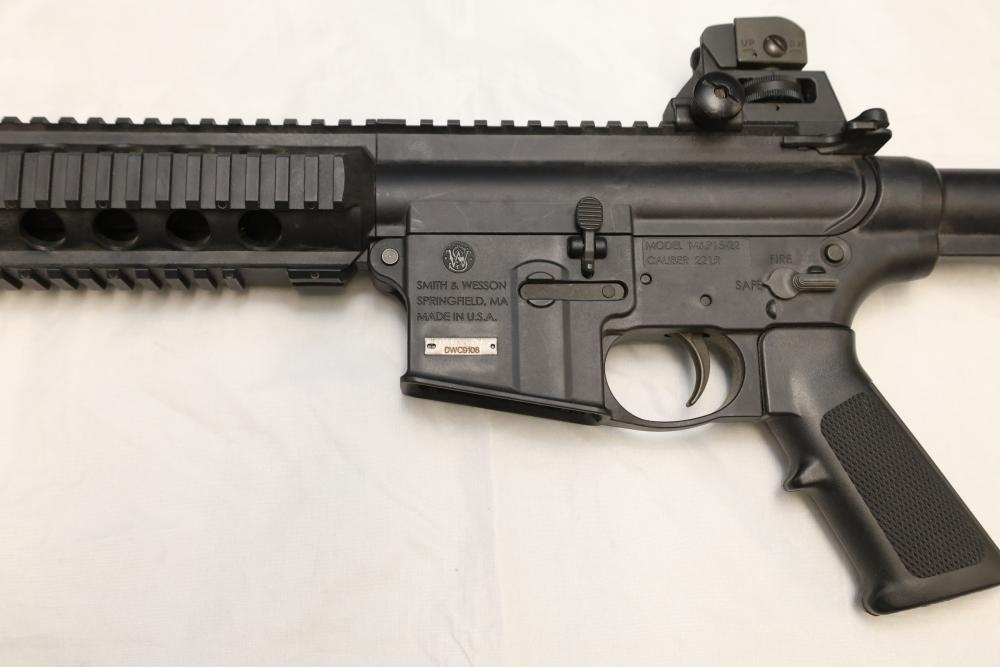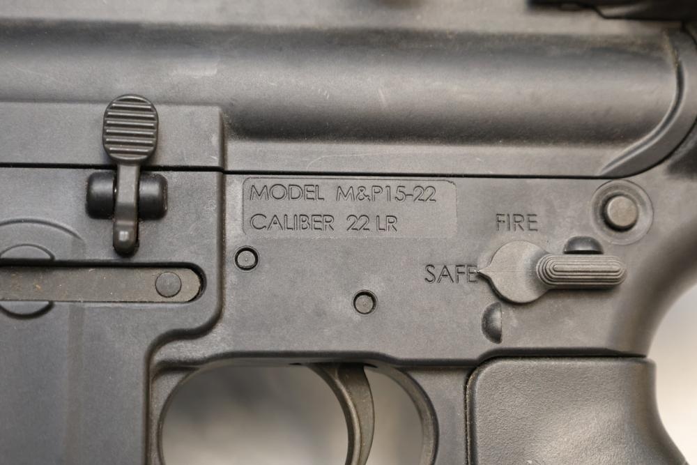 Smith & Wesson M&P15-22 semi-automatic rifle chambered in .22 LR, with a synthetic collapsible stock, synthetic forend, and rail-mounted rear sight; Serial Number DWC9108. Not for transfer in NYS unless FFL & NYS dealer or Law Enforcement. All lots are subject to all applicable laws at the time of transfer. NOTE: Semi automatic rifles and all handguns require a license in NYS. There is a $35 transfer fee per long gun. There is a $40 transfer fee per hand gun. There is a $20 transfer fee per ammunition lot. If you fail the background check, the transfer fee still applies, and you are still required to make payment and then reconsign the lot to auction. FFL dealers are not exempt from these fees. A background check will be required for all buyers purchasing a firearm and/or ammunition. NYS charges a background check fee for all firearms and ammunition. The fee is $9 for firearms and $2.50 for ammunition. The NYS fee is per background check NOT per lot, will be collected directly by Civil Armory, and is in addition to transfer fees. All lots are subject to all applicable laws at the time of transfer. NOTE: Semi automatic rifles and all handguns require a license in NYS. There is a $35 transfer fee per long gun. There is a $40 transfer fee per hand gun. There is a $20 transfer fee per ammunition lot. If you fail the background check, the transfer fee still applies, and you are still required to make payment and then reconsign the lot to auction. FFL dealers are not exempt from these fees. A background check will be required for all buyers purchasing a firearm and/or ammunition. NYS charges a background check fee for all firearms and ammunition. The fee is $9 for firearms and $2.50 for ammunition. The NYS fee is per background check NOT per lot, will be collected directly by Civil Armory, and is in addition to transfer fees.