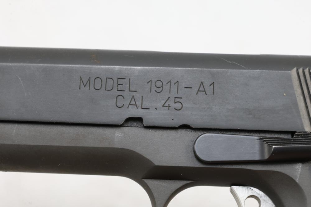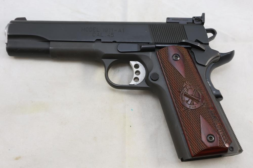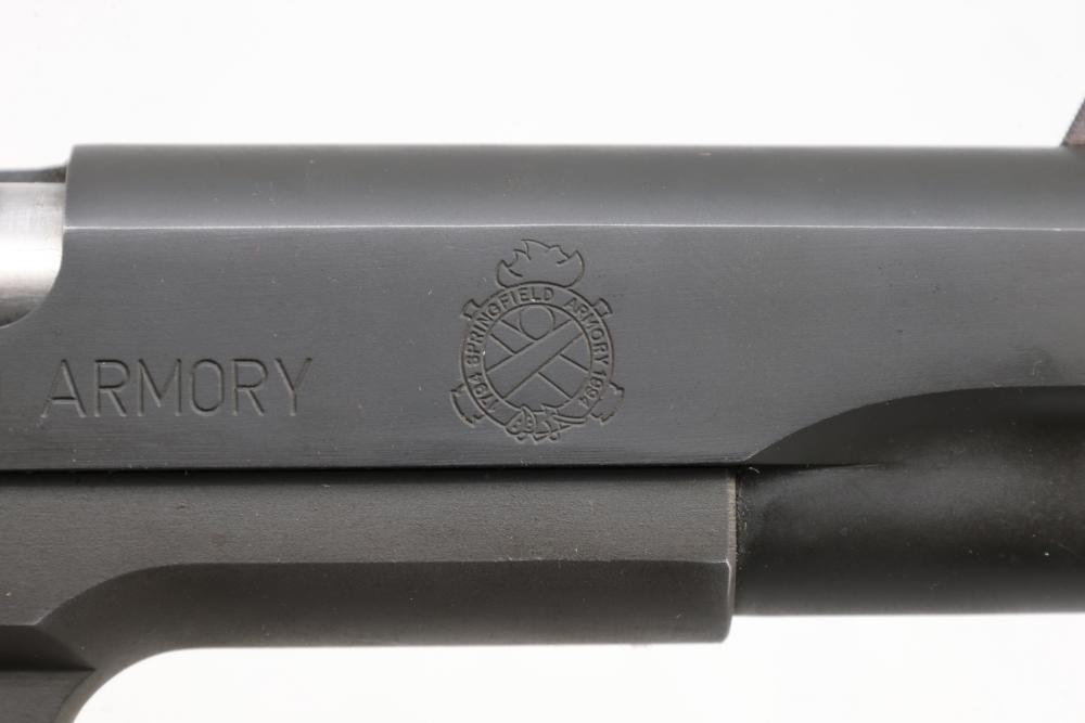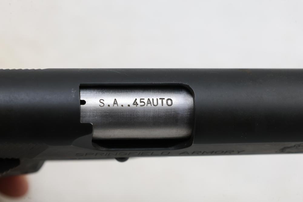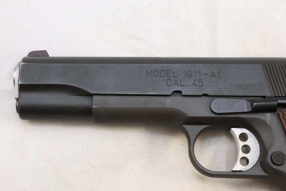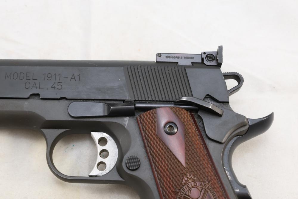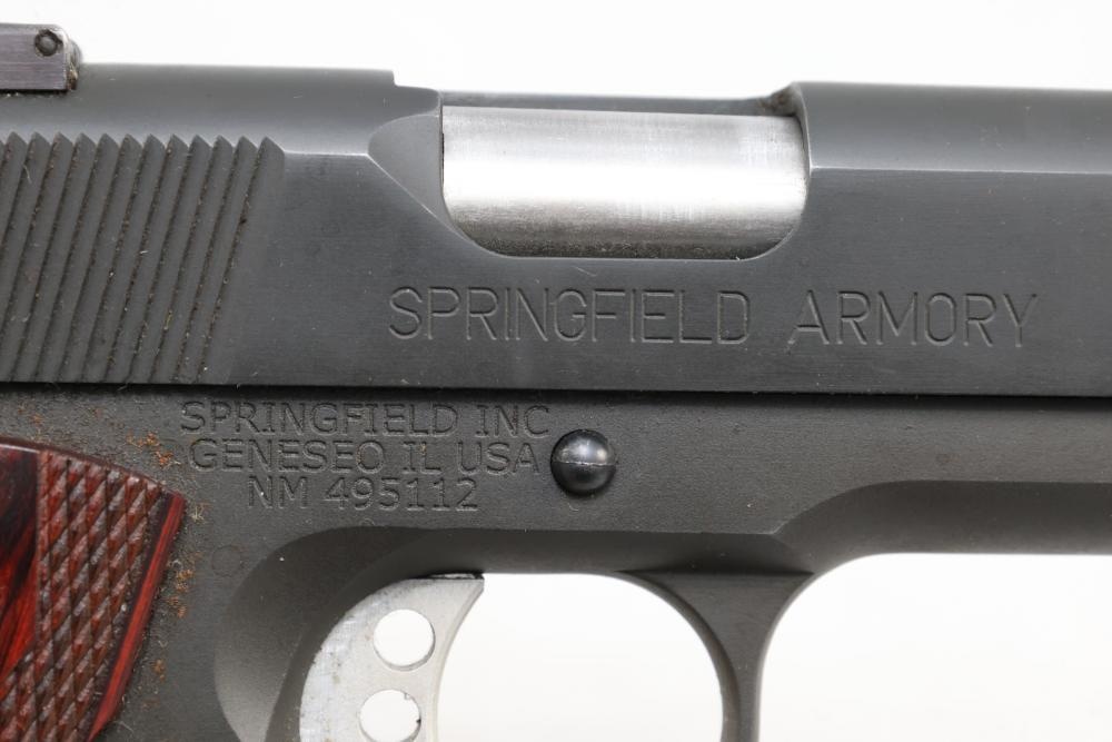 Springfield Armory Model 1911-A1 semi-automatic pistol chambered in .45 Auto, with checkered wood grips and adjustable rear sights; serial number NM 495112. All lots are subject to all applicable laws at the time of transfer. NOTE: Semi automatic rifles and all handguns require a license in NYS. There is a $35 transfer fee per long gun. There is a $40 transfer fee per hand gun. There is a $20 transfer fee per ammunition lot. If you fail the background check, the transfer fee still applies, and you are still required to make payment and then reconsign the lot to auction. FFL dealers are not exempt from these fees. A background check will be required for all buyers purchasing a firearm and/or ammunition. NYS charges a background check fee for all firearms and ammunition. The fee is $9 for firearms and $2.50 for ammunition. The NYS fee is per background check NOT per lot, will be collected directly by Civil Armory, and is in addition to transfer fees. All lots are subject to all applicable laws at the time of transfer. NOTE: Semi automatic rifles and all handguns require a license in NYS. There is a $35 transfer fee per long gun. There is a $40 transfer fee per hand gun. There is a $20 transfer fee per ammunition lot. If you fail the background check, the transfer fee still applies, and you are still required to make payment and then reconsign the lot to auction. FFL dealers are not exempt from these fees. A background check will be required for all buyers purchasing a firearm and/or ammunition. NYS charges a background check fee for all firearms and ammunition. The fee is $9 for firearms and $2.50 for ammunition. The NYS fee is per background check NOT per lot, will be collected directly by Civil Armory, and is in addition to transfer fees.