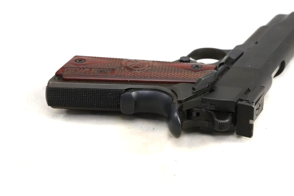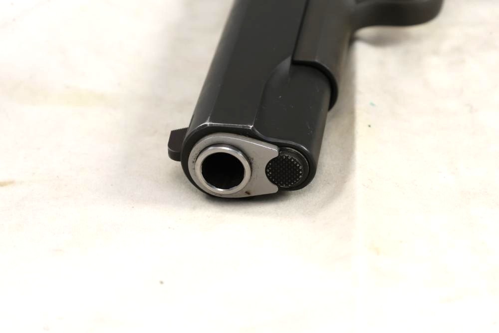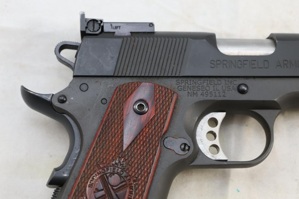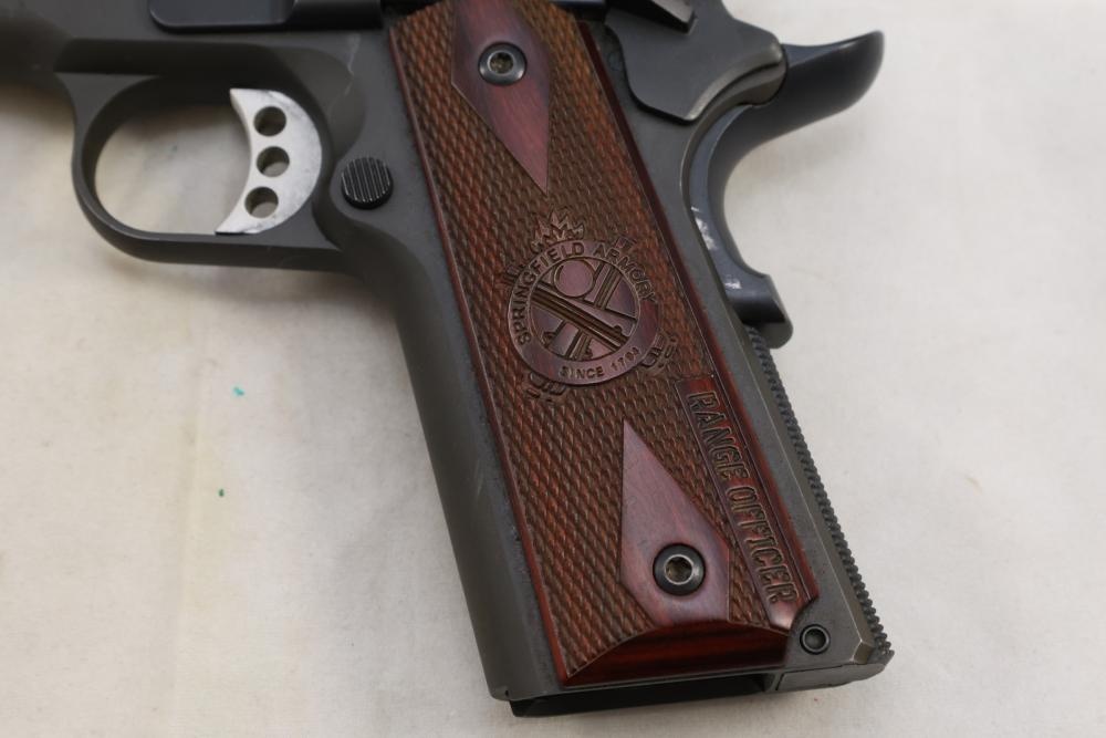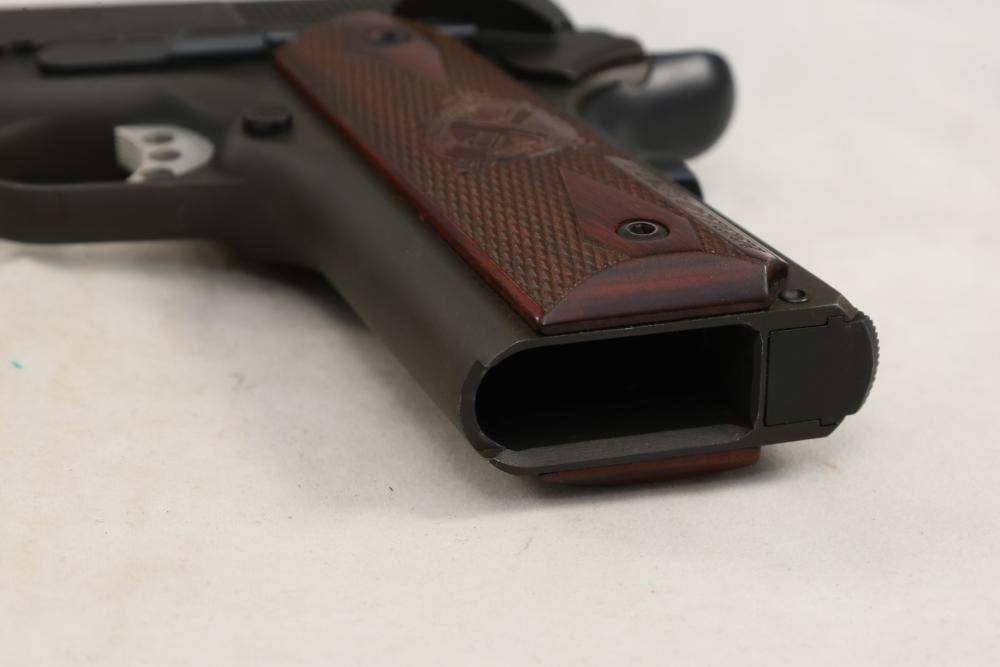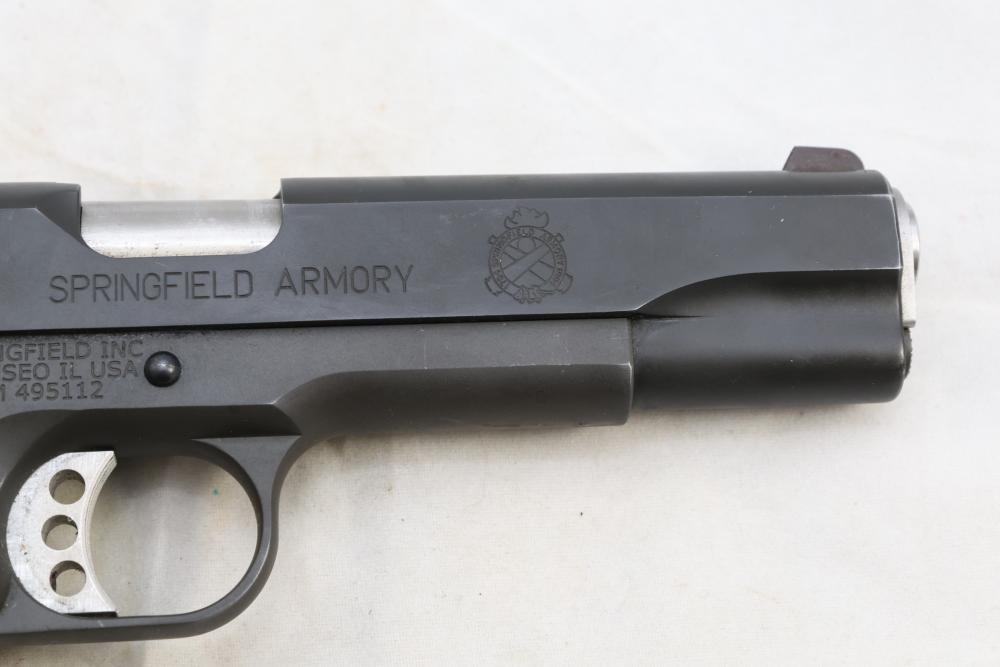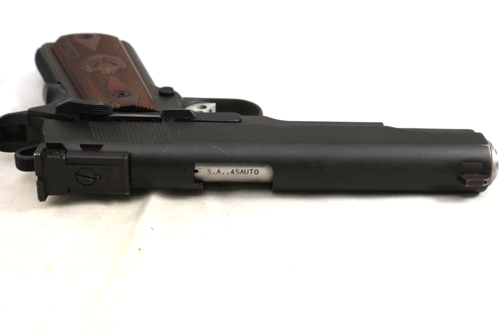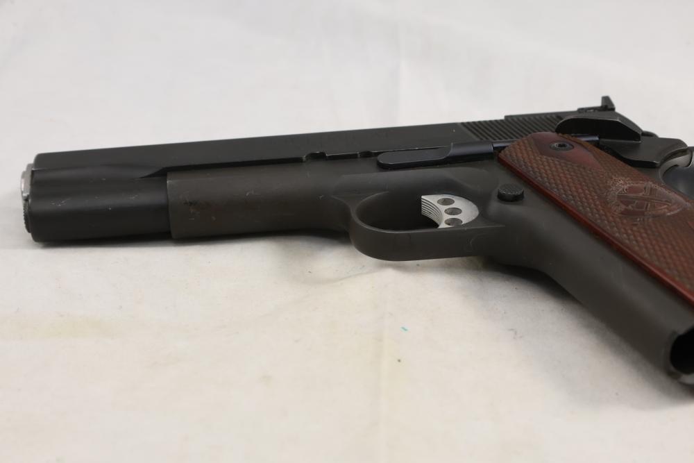 Springfield Armory Model 1911-A1 semi-automatic pistol chambered in .45 Auto, with checkered wood grips and adjustable rear sights; serial number NM 495112. All lots are subject to all applicable laws at the time of transfer. NOTE: Semi automatic rifles and all handguns require a license in NYS. There is a $35 transfer fee per long gun. There is a $40 transfer fee per hand gun. There is a $20 transfer fee per ammunition lot. If you fail the background check, the transfer fee still applies, and you are still required to make payment and then reconsign the lot to auction. FFL dealers are not exempt from these fees. A background check will be required for all buyers purchasing a firearm and/or ammunition. NYS charges a background check fee for all firearms and ammunition. The fee is $9 for firearms and $2.50 for ammunition. The NYS fee is per background check NOT per lot, will be collected directly by Civil Armory, and is in addition to transfer fees. All lots are subject to all applicable laws at the time of transfer. NOTE: Semi automatic rifles and all handguns require a license in NYS. There is a $35 transfer fee per long gun. There is a $40 transfer fee per hand gun. There is a $20 transfer fee per ammunition lot. If you fail the background check, the transfer fee still applies, and you are still required to make payment and then reconsign the lot to auction. FFL dealers are not exempt from these fees. A background check will be required for all buyers purchasing a firearm and/or ammunition. NYS charges a background check fee for all firearms and ammunition. The fee is $9 for firearms and $2.50 for ammunition. The NYS fee is per background check NOT per lot, will be collected directly by Civil Armory, and is in addition to transfer fees.