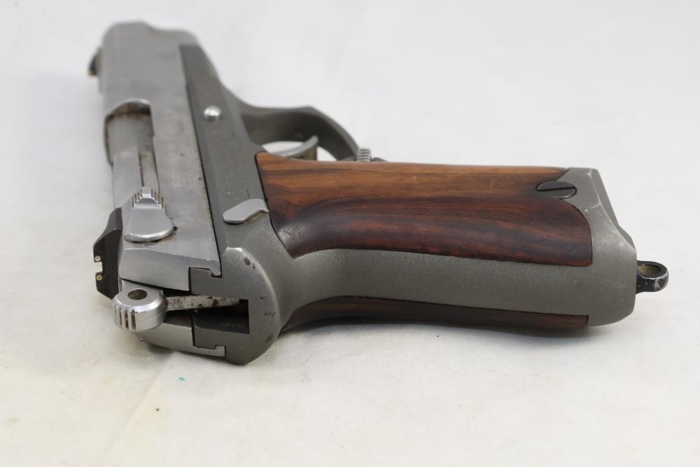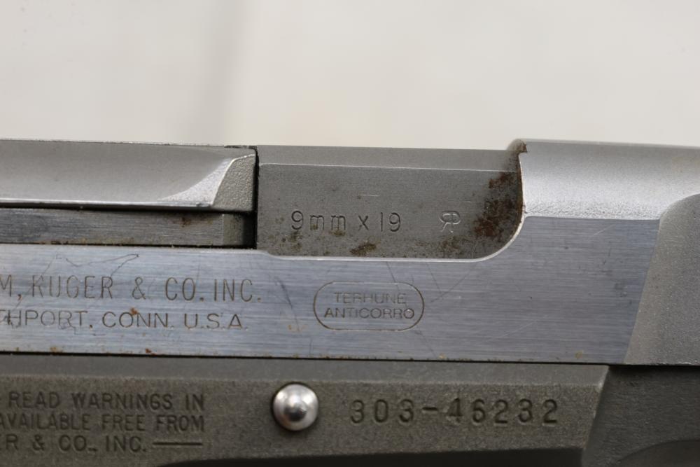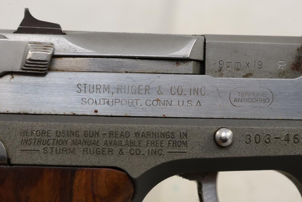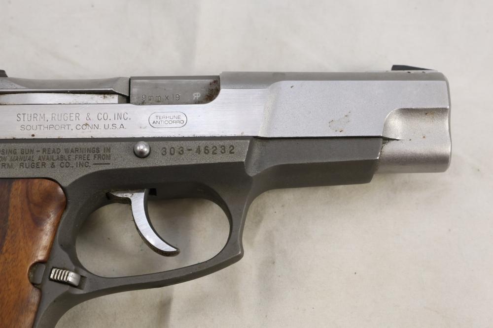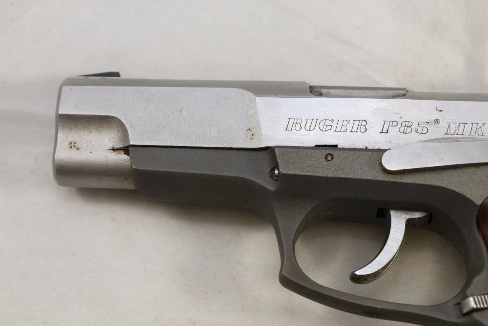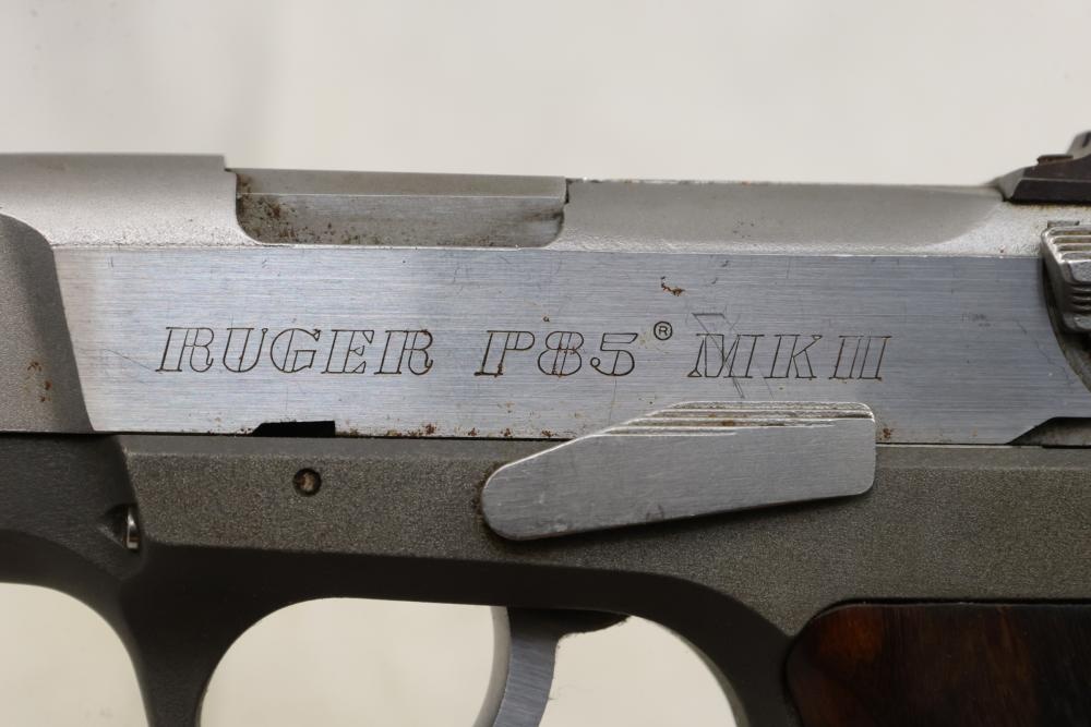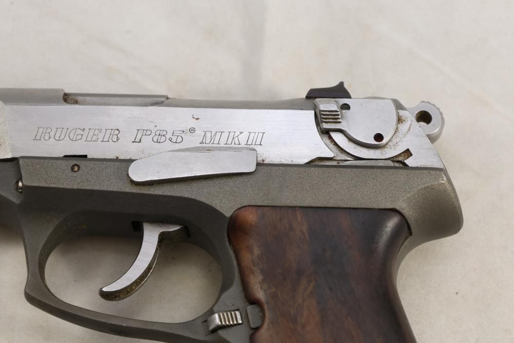 Ruger P85 MKII semi-automatic pistol chambered in 9mm x 19, with wood grips and fixed sights; serial number 303-46232. All lots are subject to all applicable laws at the time of transfer. NOTE: Semi automatic rifles and all handguns require a license in NYS. There is a $35 transfer fee per long gun. There is a $40 transfer fee per hand gun. There is a $20 transfer fee per ammunition lot. If you fail the background check, the transfer fee still applies, and you are still required to make payment and then reconsign the lot to auction. FFL dealers are not exempt from these fees. A background check will be required for all buyers purchasing a firearm and/or ammunition. NYS charges a background check fee for all firearms and ammunition. The fee is $9 for firearms and $2.50 for ammunition. The NYS fee is per background check NOT per lot, will be collected directly by Civil Armory, and is in addition to any transfer All lots are subject to all applicable laws at the time of transfer. NOTE: Semi automatic rifles and all handguns require a license in NYS. There is a $35 transfer fee per long gun. There is a $40 transfer fee per hand gun. There is a $20 transfer fee per ammunition lot. If you fail the background check, the transfer fee still applies, and you are still required to make payment and then reconsign the lot to auction. FFL dealers are not exempt from these fees. A background check will be required for all buyers purchasing a firearm and/or ammunition. NYS charges a background check fee for all firearms and ammunition. The fee is $9 for firearms and $2.50 for ammunition. The NYS fee is per background check NOT per lot, will be collected directly by Civil Armory, and is in addition to any transfer