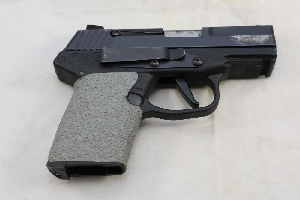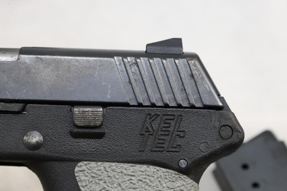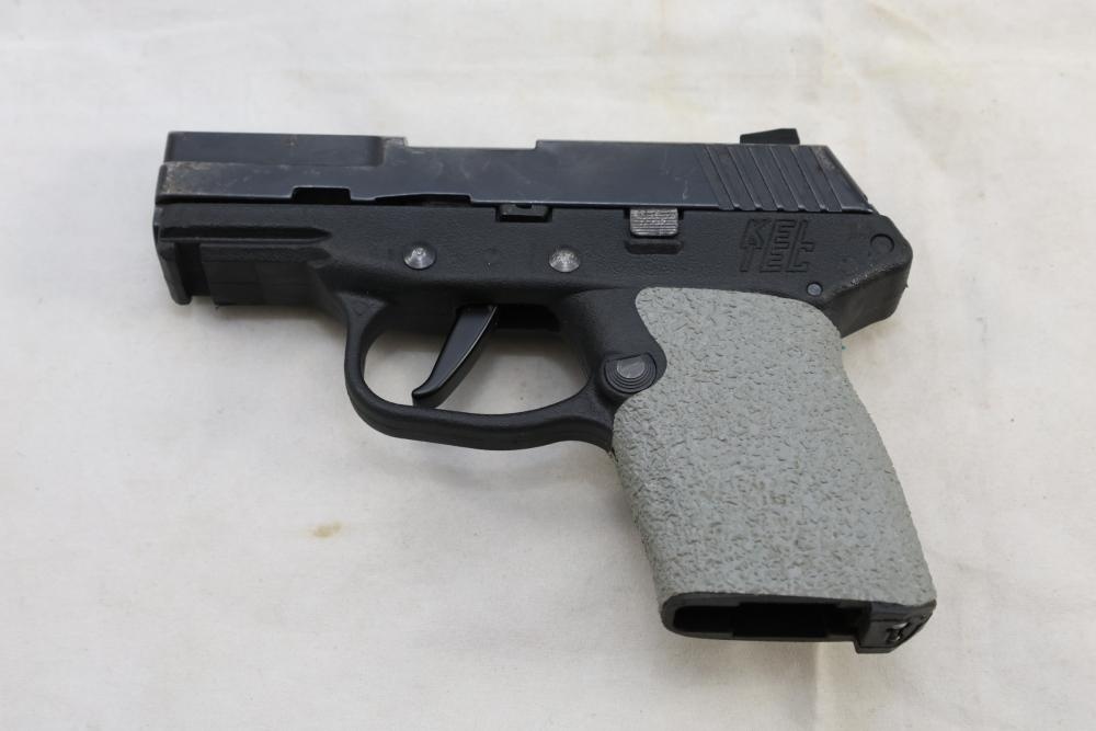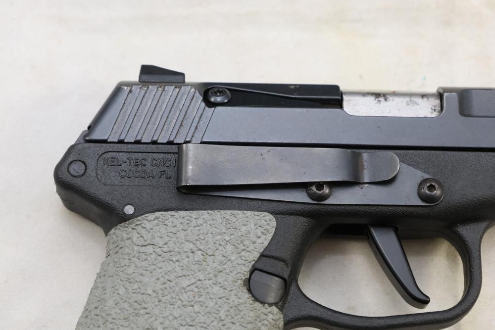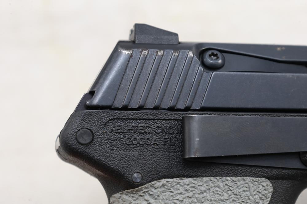 Kel-Tec PF-9 semi-automatic pistol chambered in 9mm, with textured grip wrap and an installed belt clip; serial number SQ654; includes hard case, manuals, lock, spare spring, and four magazines. All lots are subject to all applicable laws at the time of transfer. NOTE: Semi automatic rifles and all handguns require a license in NYS. There is a $35 transfer fee per long gun. There is a $40 transfer fee per hand gun. There is a $20 transfer fee per ammunition lot. If you fail the background check, the transfer fee still applies, and you are still required to make payment and then reconsign the lot to auction. FFL dealers are not exempt from these fees. A background check will be required for all buyers purchasing a firearm and/or ammunition. NYS charges a background check fee for all firearms and ammunition. The fee is $9 for firearms and $2.50 for ammunition. The NYS fee is per background check NOT per lot, will be collected directly by Civil Armory, and is in addition to any transfer All lots are subject to all applicable laws at the time of transfer. NOTE: Semi automatic rifles and all handguns require a license in NYS. There is a $35 transfer fee per long gun. There is a $40 transfer fee per hand gun. There is a $20 transfer fee per ammunition lot. If you fail the background check, the transfer fee still applies, and you are still required to make payment and then reconsign the lot to auction. FFL dealers are not exempt from these fees. A background check will be required for all buyers purchasing a firearm and/or ammunition. NYS charges a background check fee for all firearms and ammunition. The fee is $9 for firearms and $2.50 for ammunition. The NYS fee is per background check NOT per lot, will be collected directly by Civil Armory, and is in addition to any transfer