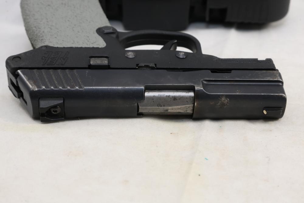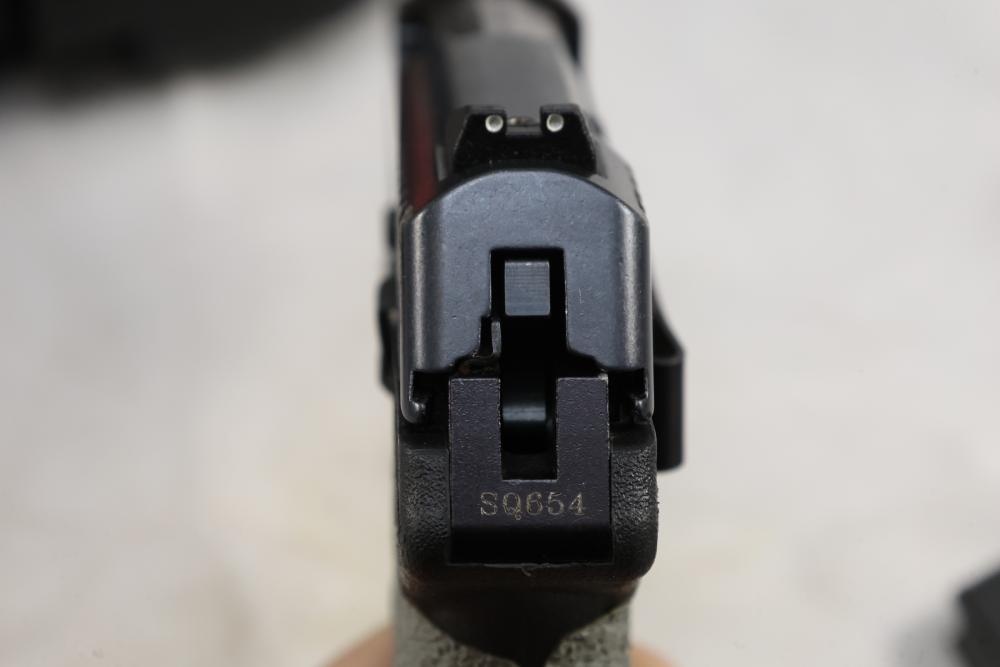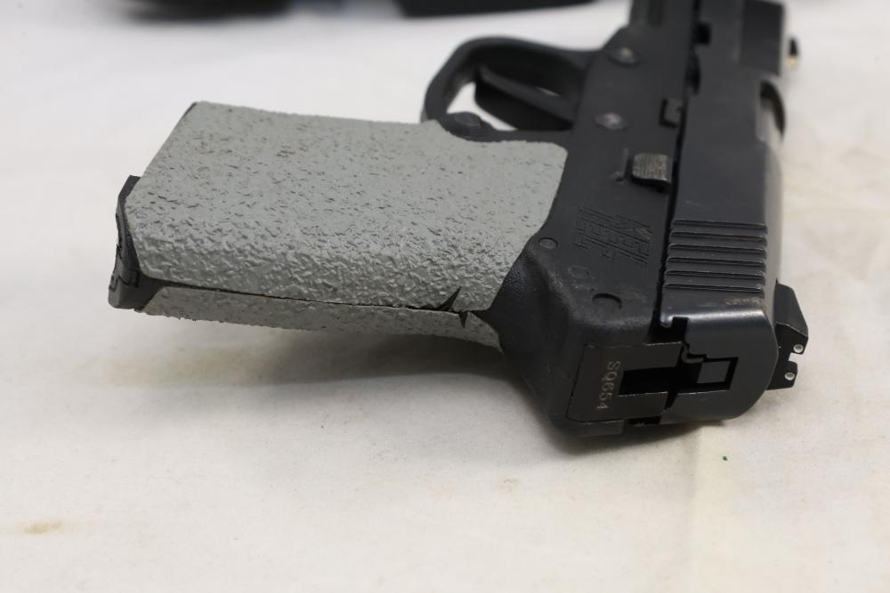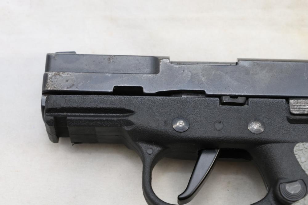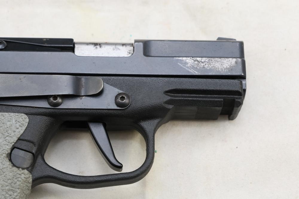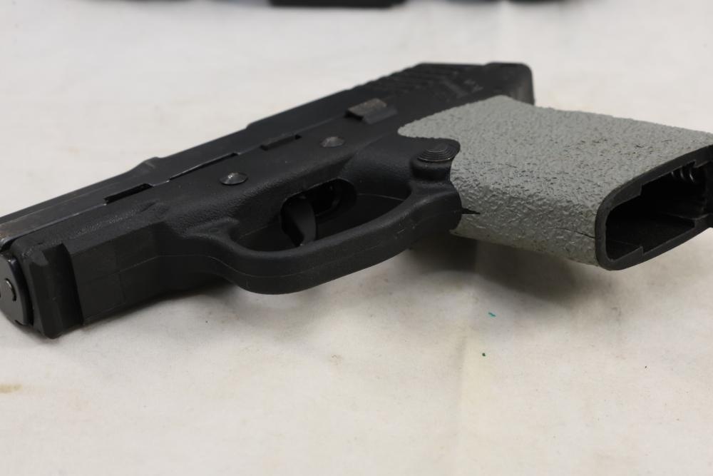 Kel-Tec PF-9 semi-automatic pistol chambered in 9mm, with textured grip wrap and an installed belt clip; serial number SQ654; includes hard case, manuals, lock, spare spring, and four magazines. All lots are subject to all applicable laws at the time of transfer. NOTE: Semi automatic rifles and all handguns require a license in NYS. There is a $35 transfer fee per long gun. There is a $40 transfer fee per hand gun. There is a $20 transfer fee per ammunition lot. If you fail the background check, the transfer fee still applies, and you are still required to make payment and then reconsign the lot to auction. FFL dealers are not exempt from these fees. A background check will be required for all buyers purchasing a firearm and/or ammunition. NYS charges a background check fee for all firearms and ammunition. The fee is $9 for firearms and $2.50 for ammunition. The NYS fee is per background check NOT per lot, will be collected directly by Civil Armory, and is in addition to any transfer All lots are subject to all applicable laws at the time of transfer. NOTE: Semi automatic rifles and all handguns require a license in NYS. There is a $35 transfer fee per long gun. There is a $40 transfer fee per hand gun. There is a $20 transfer fee per ammunition lot. If you fail the background check, the transfer fee still applies, and you are still required to make payment and then reconsign the lot to auction. FFL dealers are not exempt from these fees. A background check will be required for all buyers purchasing a firearm and/or ammunition. NYS charges a background check fee for all firearms and ammunition. The fee is $9 for firearms and $2.50 for ammunition. The NYS fee is per background check NOT per lot, will be collected directly by Civil Armory, and is in addition to any transfer