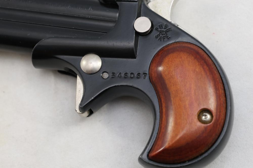 Davis Industries Model DM-22 over/under derringer chambered in .22 Magnum, with smooth wood grips and fixed sights. Serial Number 546067. All lots are subject to all applicable laws at the time of transfer. NOTE: Semi automatic rifles and all handguns require a license in NYS. There is a $35 transfer fee per long gun. There is a $40 transfer fee per hand gun. There is a $20 transfer fee per ammunition lot. If you fail the background check, the transfer fee still applies, and you are still required to make payment and then reconsign the lot to auction. FFL dealers are not exempt from these fees. A background check will be required for all buyers purchasing a firearm and/or ammunition. NYS charges a background check fee for all firearms and ammunition. The fee is $9 for firearms and $2.50 for ammunition. The NYS fee is per background check NOT per lot, will be collected directly by Civil Armory, and is in addition to any transfer All lots are subject to all applicable laws at the time of transfer. NOTE: Semi automatic rifles and all handguns require a license in NYS. There is a $35 transfer fee per long gun. There is a $40 transfer fee per hand gun. There is a $20 transfer fee per ammunition lot. If you fail the background check, the transfer fee still applies, and you are still required to make payment and then reconsign the lot to auction. FFL dealers are not exempt from these fees. A background check will be required for all buyers purchasing a firearm and/or ammunition. NYS charges a background check fee for all firearms and ammunition. The fee is $9 for firearms and $2.50 for ammunition. The NYS fee is per background check NOT per lot, will be collected directly by Civil Armory, and is in addition to any transfer