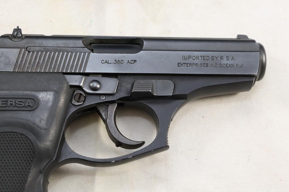 Bersa Thunder 380 semi-automatic pistol chambered in .380 ACP, with a black synthetic grip, and standard fixed sights; Serial Number D06936, and comes with two magazines, an extra wood grip set, a soft case, and a manual. All lots are subject to all applicable laws at the time of transfer. NOTE: Semi automatic rifles and all handguns require a license in NYS. There is a $35 transfer fee per long gun. There is a $40 transfer fee per hand gun. There is a $20 transfer fee per ammunition lot. If you fail the background check, the transfer fee still applies, and you are still required to make payment and then reconsign the lot to auction. FFL dealers are not exempt from these fees. A background check will be required for all buyers purchasing a firearm and/or ammunition. NYS charges a background check fee for all firearms and ammunition. The fee is $9 for firearms and $2.50 for ammunition. The NYS fee is per background check NOT per lot, will be collected directly by Civil Armory, and is in addition to any transfer All lots are subject to all applicable laws at the time of transfer. NOTE: Semi automatic rifles and all handguns require a license in NYS. There is a $35 transfer fee per long gun. There is a $40 transfer fee per hand gun. There is a $20 transfer fee per ammunition lot. If you fail the background check, the transfer fee still applies, and you are still required to make payment and then reconsign the lot to auction. FFL dealers are not exempt from these fees. A background check will be required for all buyers purchasing a firearm and/or ammunition. NYS charges a background check fee for all firearms and ammunition. The fee is $9 for firearms and $2.50 for ammunition. The NYS fee is per background check NOT per lot, will be collected directly by Civil Armory, and is in addition to any transfer