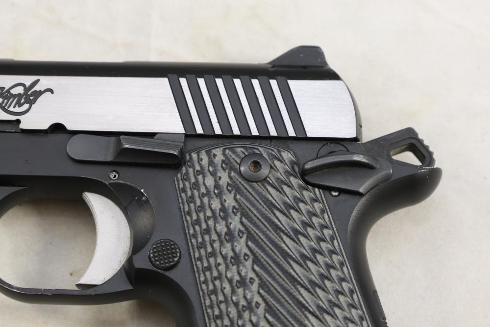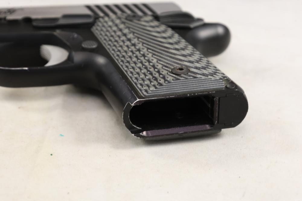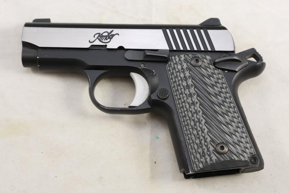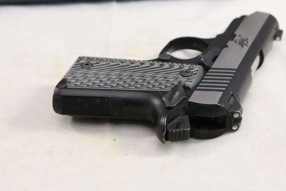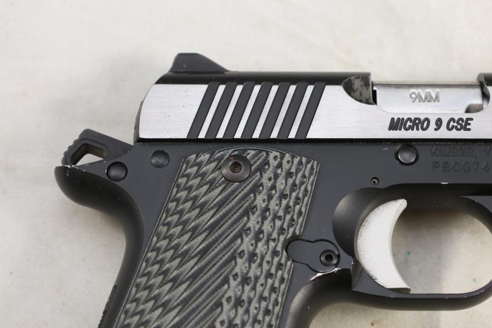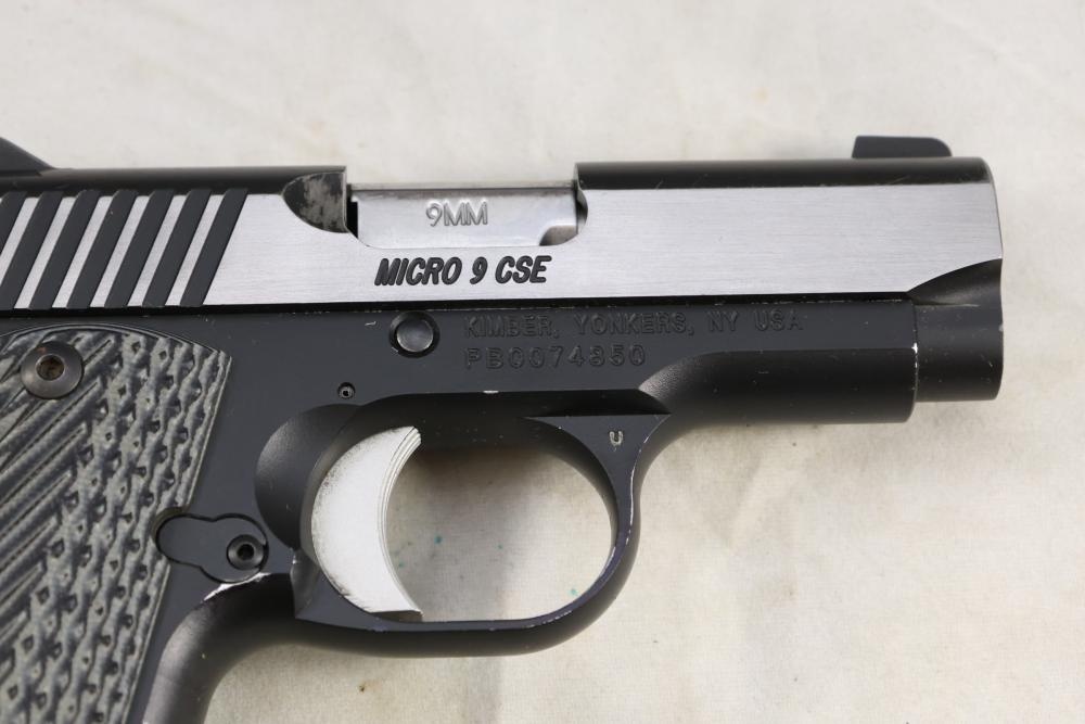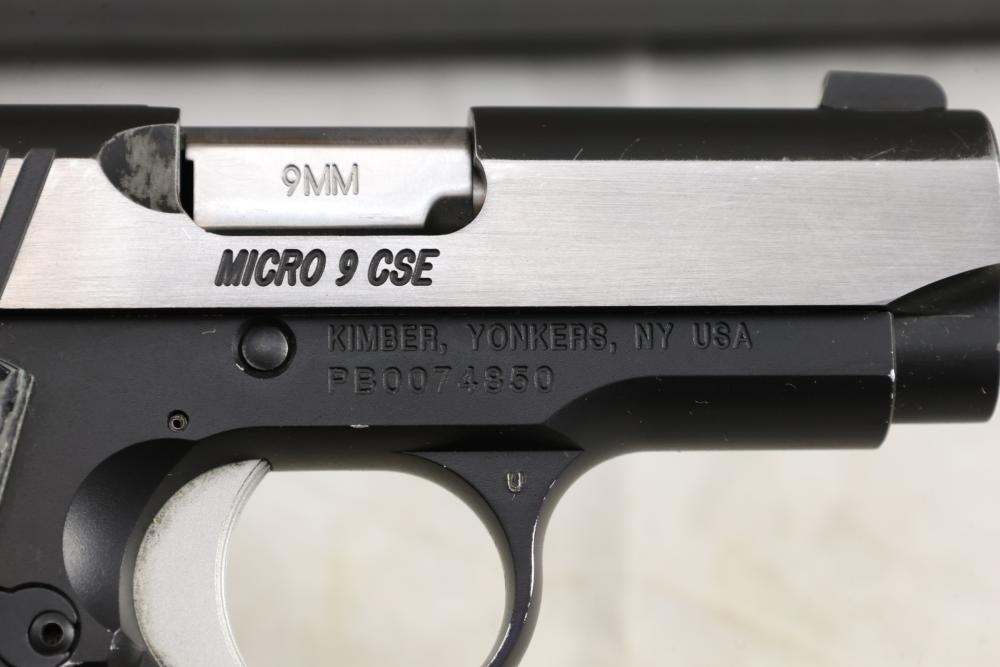 Kimber Micro 9 CSE semi-automatic pistol chambered in 9MM, with gray and black textured grips. Serial Number PB0074850. Accessories include a soft case, cardboard box, paperwork, and one stainless finish magazine. All lots are subject to all applicable laws at the time of transfer. NOTE: Semi automatic rifles and all handguns require a license in NYS. There is a $35 transfer fee per long gun. There is a $40 transfer fee per hand gun. There is a $20 transfer fee per ammunition lot. If you fail the background check, the transfer fee still applies, and you are still required to make payment and then reconsign the lot to auction. FFL dealers are not exempt from these fees. A background check will be required for all buyers purchasing a firearm and/or ammunition. NYS charges a background check fee for all firearms and ammunition. The fee is $9 for firearms and $2.50 for ammunition. The NYS fee is per background check NOT per lot, will be collected directly by Civil Armory, and is in addition to transfer fees. All lots are subject to all applicable laws at the time of transfer. NOTE: Semi automatic rifles and all handguns require a license in NYS. There is a $35 transfer fee per long gun. There is a $40 transfer fee per hand gun. There is a $20 transfer fee per ammunition lot. If you fail the background check, the transfer fee still applies, and you are still required to make payment and then reconsign the lot to auction. FFL dealers are not exempt from these fees. A background check will be required for all buyers purchasing a firearm and/or ammunition. NYS charges a background check fee for all firearms and ammunition. The fee is $9 for firearms and $2.50 for ammunition. The NYS fee is per background check NOT per lot, will be collected directly by Civil Armory, and is in addition to transfer fees.