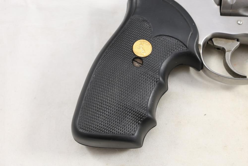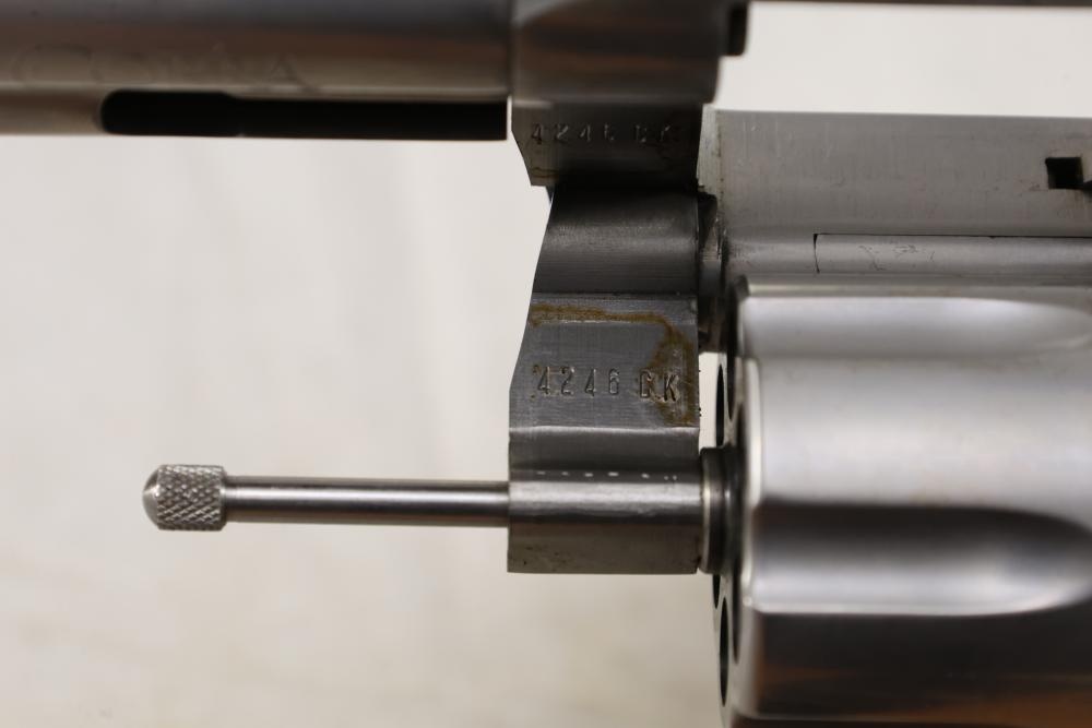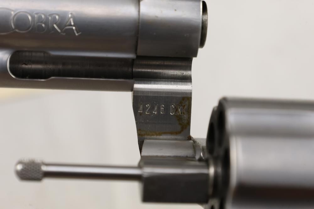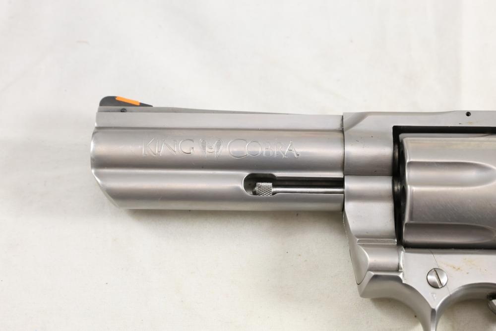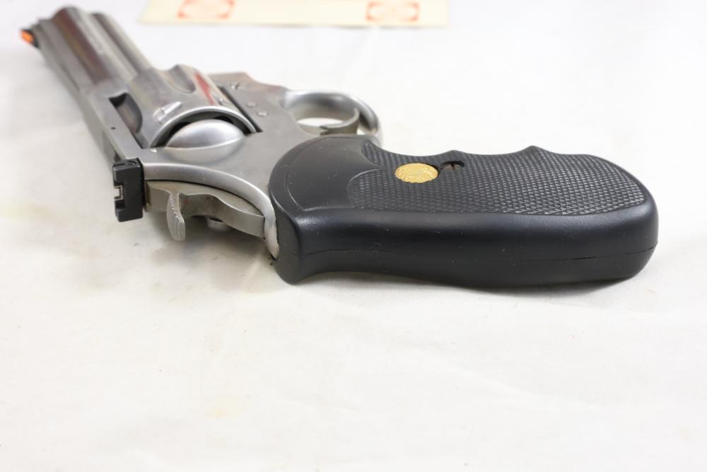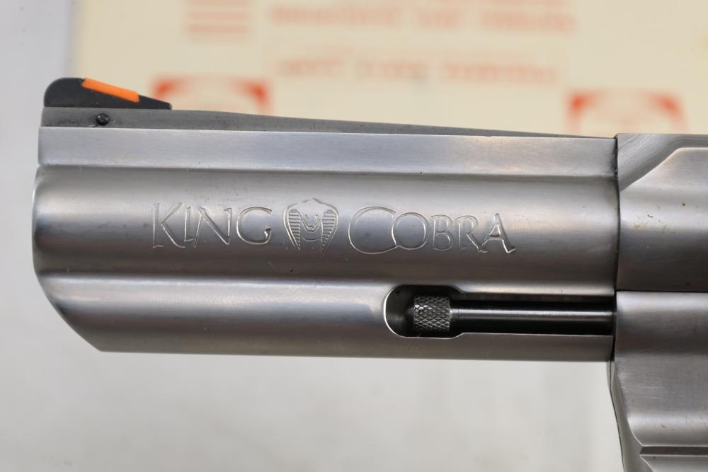 King Cobra Colt double-action revolver chambered in .357 Magnum, with black rubber grips, and including the factory Colt box and assorted paperwork. Serial Number 4246CK. All lots are subject to all applicable laws at the time of transfer. NOTE: Semi automatic rifles and all handguns require a license in NYS. There is a $35 transfer fee per long gun. There is a $40 transfer fee per hand gun. There is a $20 transfer fee per ammunition lot. If you fail the background check, the transfer fee still applies, and you are still required to make payment and then reconsign the lot to auction. FFL dealers are not exempt from these fees. A background check will be required for all buyers purchasing a firearm and/or ammunition. NYS charges a background check fee for all firearms and ammunition. The fee is $9 for firearms and $2.50 for ammunition. The NYS fee is per background check NOT per lot, will be collected directly by Civil Armory, and is in addition to any transfer All lots are subject to all applicable laws at the time of transfer. NOTE: Semi automatic rifles and all handguns require a license in NYS. There is a $35 transfer fee per long gun. There is a $40 transfer fee per hand gun. There is a $20 transfer fee per ammunition lot. If you fail the background check, the transfer fee still applies, and you are still required to make payment and then reconsign the lot to auction. FFL dealers are not exempt from these fees. A background check will be required for all buyers purchasing a firearm and/or ammunition. NYS charges a background check fee for all firearms and ammunition. The fee is $9 for firearms and $2.50 for ammunition. The NYS fee is per background check NOT per lot, will be collected directly by Civil Armory, and is in addition to any transfer