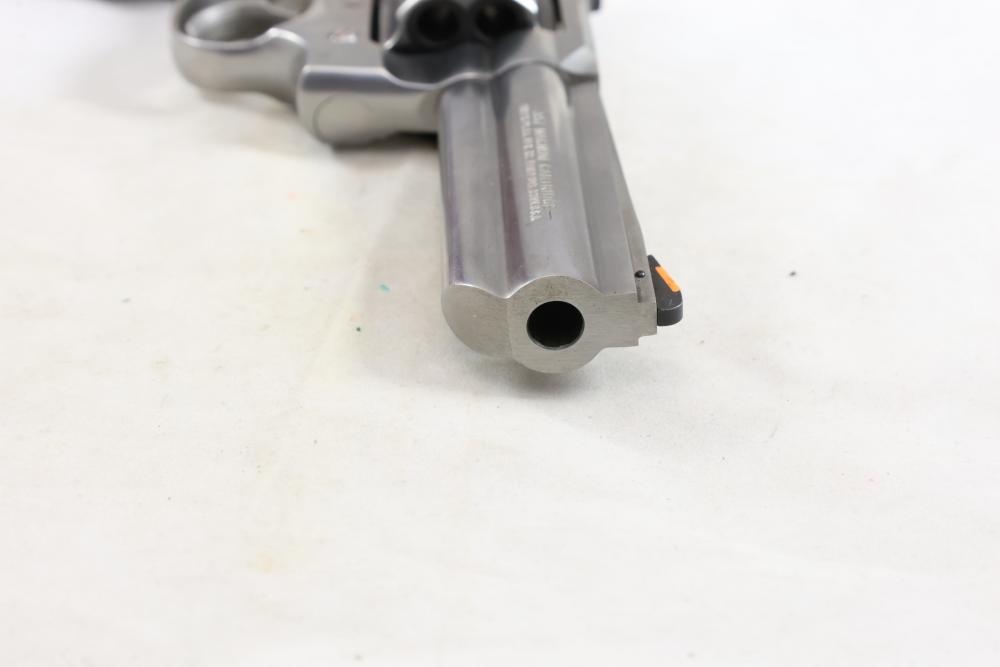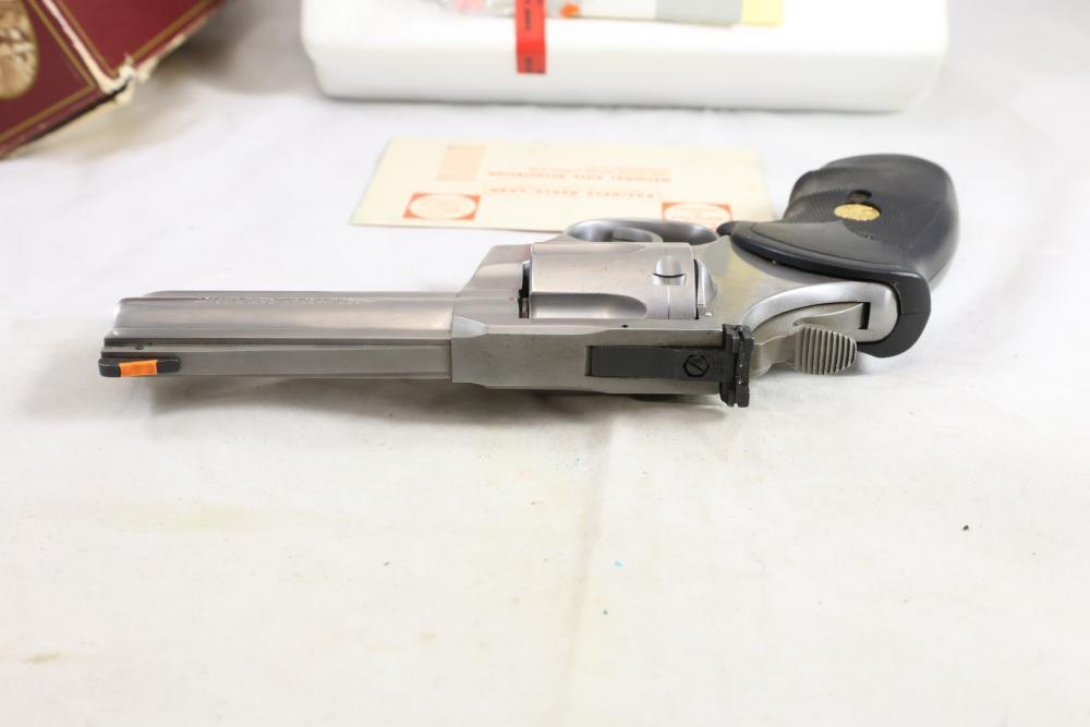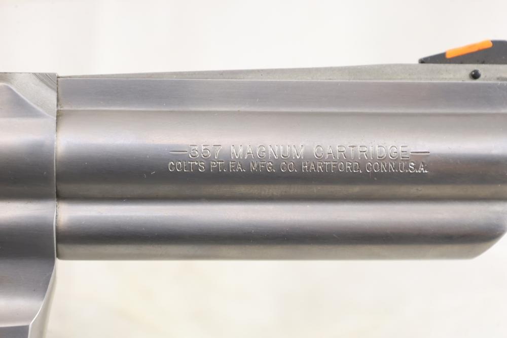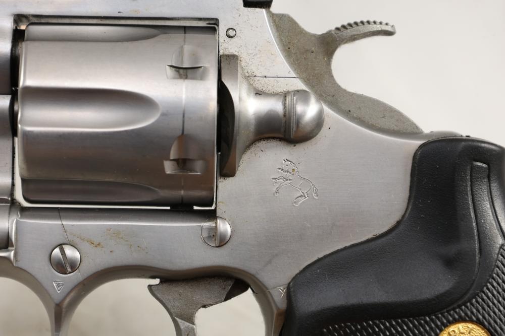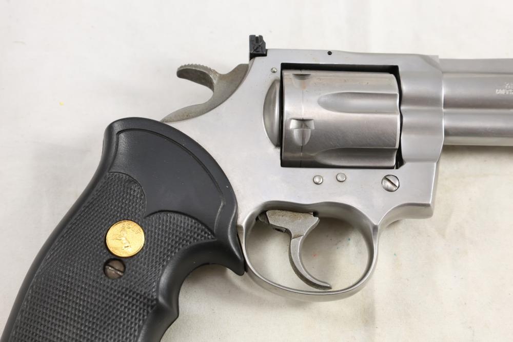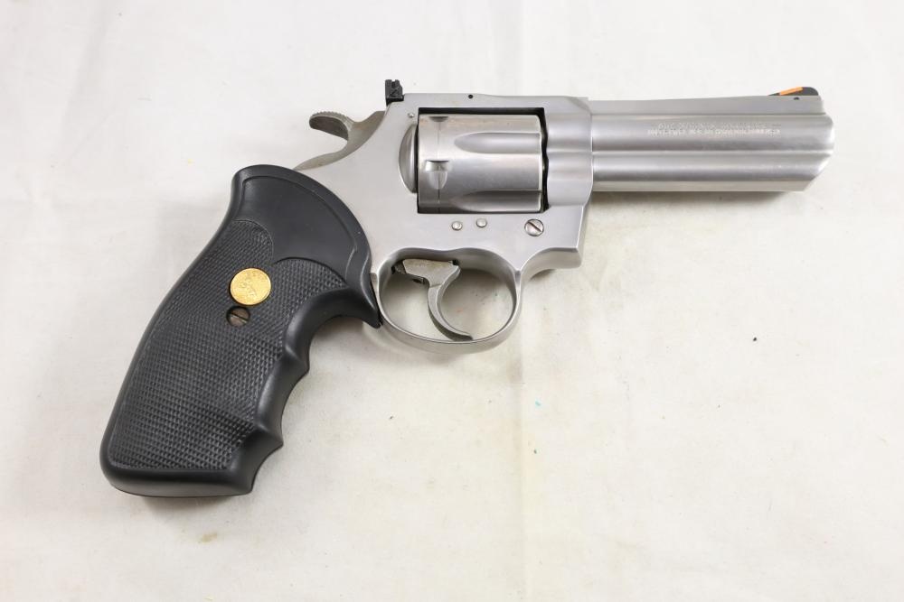 King Cobra Colt double-action revolver chambered in .357 Magnum, with black rubber grips, and including the factory Colt box and assorted paperwork. Serial Number 4246CK. All lots are subject to all applicable laws at the time of transfer. NOTE: Semi automatic rifles and all handguns require a license in NYS. There is a $35 transfer fee per long gun. There is a $40 transfer fee per hand gun. There is a $20 transfer fee per ammunition lot. If you fail the background check, the transfer fee still applies, and you are still required to make payment and then reconsign the lot to auction. FFL dealers are not exempt from these fees. A background check will be required for all buyers purchasing a firearm and/or ammunition. NYS charges a background check fee for all firearms and ammunition. The fee is $9 for firearms and $2.50 for ammunition. The NYS fee is per background check NOT per lot, will be collected directly by Civil Armory, and is in addition to any transfer All lots are subject to all applicable laws at the time of transfer. NOTE: Semi automatic rifles and all handguns require a license in NYS. There is a $35 transfer fee per long gun. There is a $40 transfer fee per hand gun. There is a $20 transfer fee per ammunition lot. If you fail the background check, the transfer fee still applies, and you are still required to make payment and then reconsign the lot to auction. FFL dealers are not exempt from these fees. A background check will be required for all buyers purchasing a firearm and/or ammunition. NYS charges a background check fee for all firearms and ammunition. The fee is $9 for firearms and $2.50 for ammunition. The NYS fee is per background check NOT per lot, will be collected directly by Civil Armory, and is in addition to any transfer