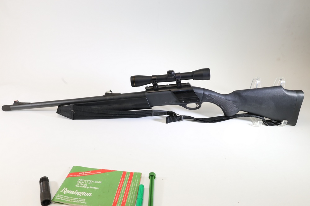Remington 11-87 Special Purpose semi-automatic shotgun chambered in 12 GA, with a synthetic stock, rubber butt pad, sling swivels, and a Leupold M8-4X Shotgun scope on a B-Square mount. Serial Number PC691277. All lots are subject to all applicable laws at the time of transfer. NOTE: Semi automatic rifles and all handguns require a license in NYS. There is a $35 transfer fee per long gun. There is a $40 transfer fee per hand gun. There is a $20 transfer fee per ammunition lot. If you fail the background check, the transfer fee still applies, and you are still required to make payment and then reconsign the lot to auction. FFL dealers are not exempt from these fees. A background check will be required for all buyers purchasing a firearm and/or ammunition. NYS charges a background check fee for all firearms and ammunition. The fee is $9 for firearms and $2.50 for ammunition. The NYS fee is per background check NOT per lot, will be collected directly by Civil Armory, and is in addition to transfer fees. All lots are subject to all applicable laws at the time of transfer. NOTE: Semi automatic rifles and all handguns require a license in NYS. There is a $35 transfer fee per long gun. There is a $40 transfer fee per hand gun. There is a $20 transfer fee per ammunition lot. If you fail the background check, the transfer fee still applies, and you are still required to make payment and then reconsign the lot to auction. FFL dealers are not exempt from these fees. A background check will be required for all buyers purchasing a firearm and/or ammunition. NYS charges a background check fee for all firearms and ammunition. The fee is $9 for firearms and $2.50 for ammunition. The NYS fee is per background check NOT per lot, will be collected directly by Civil Armory, and is in addition to transfer fees.