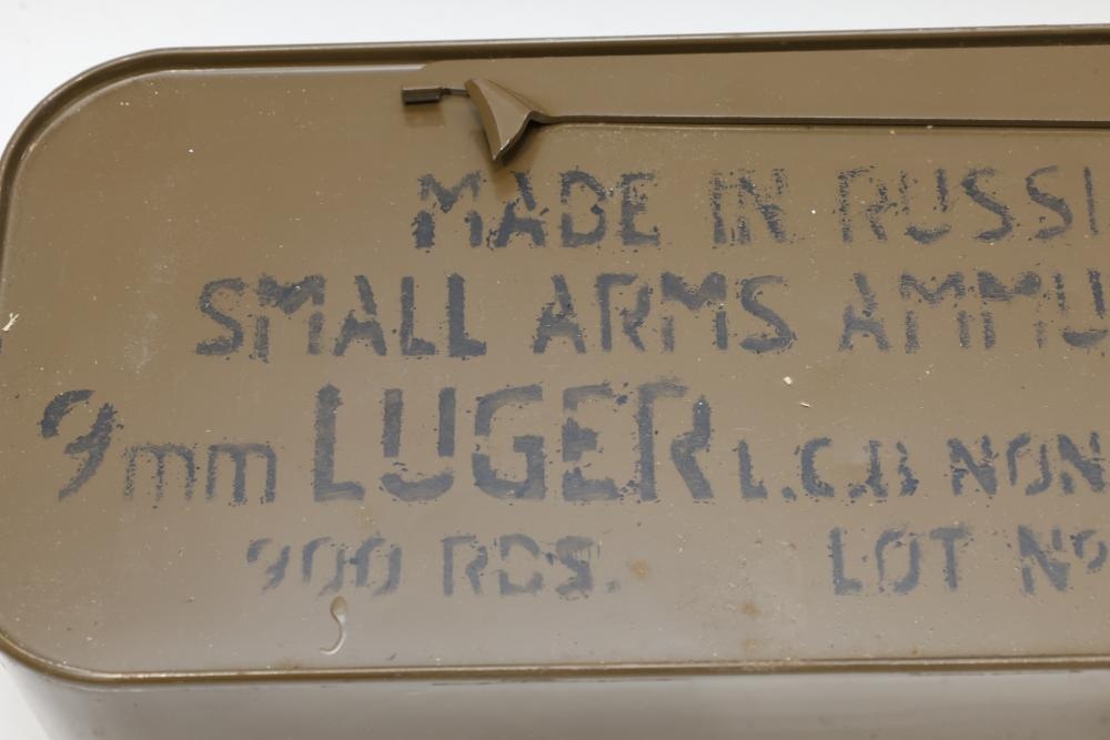 Russian-made small arms ammunition can labeled 9mm Luger L.C.B. non-corrosive, 900 rounds, Lot No. 2485-11. All lots are subject to all applicable laws at the time of transfer. NOTE: Semi automatic rifles and all handguns require a license in NYS. There is a $35 transfer fee per long gun. There is a $40 transfer fee per hand gun. There is a $20 transfer fee per ammunition lot. If you fail the background check, the transfer fee still applies, and you are still required to make payment and then reconsign the lot to auction. FFL dealers are not exempt from these fees. A background check will be required for all buyers purchasing a firearm and/or ammunition. NYS charges a background check fee for all firearms and ammunition. The fee is $9 for firearms and $2.50 for ammunition. The NYS fee is per background check NOT per lot, will be collected directly by Civil Armory, and is in addition to any transfer All lots are subject to all applicable laws at the time of transfer. NOTE: Semi automatic rifles and all handguns require a license in NYS. There is a $35 transfer fee per long gun. There is a $40 transfer fee per hand gun. There is a $20 transfer fee per ammunition lot. If you fail the background check, the transfer fee still applies, and you are still required to make payment and then reconsign the lot to auction. FFL dealers are not exempt from these fees. A background check will be required for all buyers purchasing a firearm and/or ammunition. NYS charges a background check fee for all firearms and ammunition. The fee is $9 for firearms and $2.50 for ammunition. The NYS fee is per background check NOT per lot, will be collected directly by Civil Armory, and is in addition to any transfer