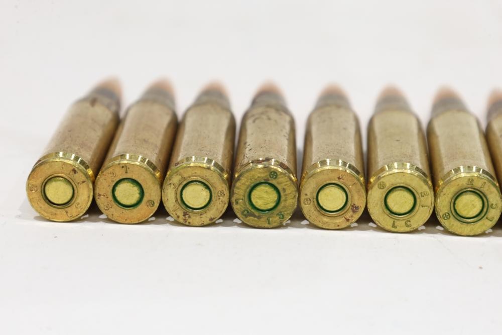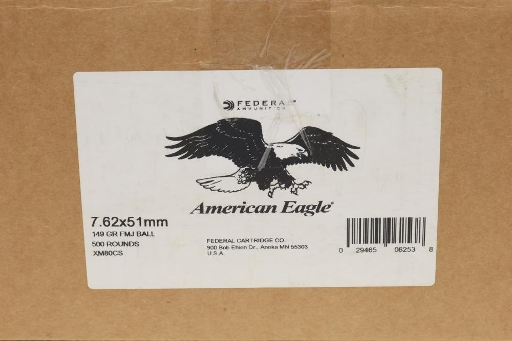 Federal American Eagle box of centerfire rifle ammunition labeled 7.62x51mm 149 GR FMJ Ball, 500 rounds (XM80CS). The visible loose cartridges show “LC” headstamps with green primer sealant. Count not verified. All lots are subject to all applicable laws at the time of transfer. NOTE: Semi automatic rifles and all handguns require a license in NYS. There is a $35 transfer fee per long gun. There is a $40 transfer fee per hand gun. There is a $20 transfer fee per ammunition lot. If you fail the background check, the transfer fee still applies, and you are still required to make payment and then reconsign the lot to auction. FFL dealers are not exempt from these fees. A background check will be required for all buyers purchasing a firearm and/or ammunition. NYS charges a background check fee for all firearms and ammunition. The fee is $9 for firearms and $2.50 for ammunition. The NYS fee is per background check NOT per lot, will be collected directly by Civil Armory, and is in addition to any transfer All lots are subject to all applicable laws at the time of transfer. NOTE: Semi automatic rifles and all handguns require a license in NYS. There is a $35 transfer fee per long gun. There is a $40 transfer fee per hand gun. There is a $20 transfer fee per ammunition lot. If you fail the background check, the transfer fee still applies, and you are still required to make payment and then reconsign the lot to auction. FFL dealers are not exempt from these fees. A background check will be required for all buyers purchasing a firearm and/or ammunition. NYS charges a background check fee for all firearms and ammunition. The fee is $9 for firearms and $2.50 for ammunition. The NYS fee is per background check NOT per lot, will be collected directly by Civil Armory, and is in addition to any transfer