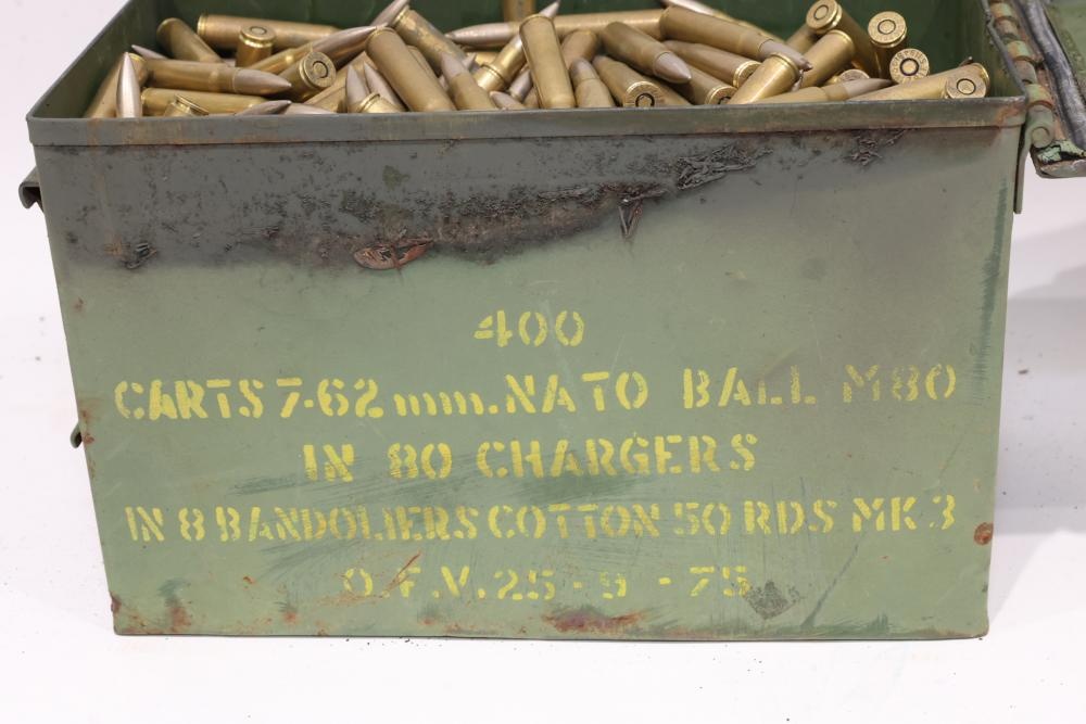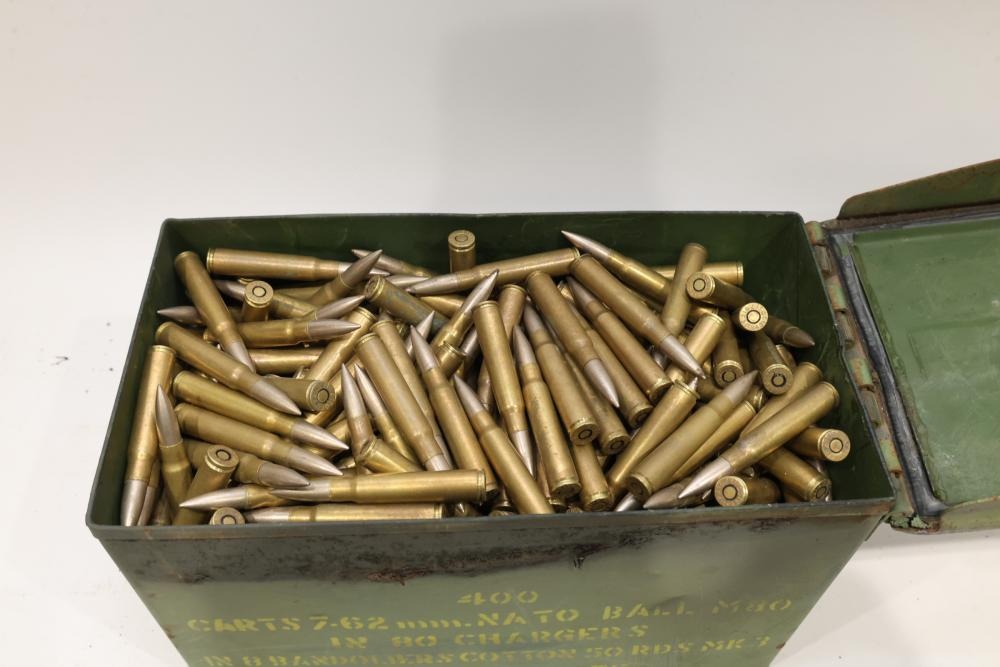 7.62×51mm NATO cartridges stored in a vintage green military ammunition can stenciled for 400 rounds of M80 ball. All lots are subject to all applicable laws at the time of transfer. NOTE: Semi automatic rifles and all handguns require a license in NYS. There is a $35 transfer fee per long gun. There is a $40 transfer fee per hand gun. There is a $20 transfer fee per ammunition lot. If you fail the background check, the transfer fee still applies, and you are still required to make payment and then reconsign the lot to auction. FFL dealers are not exempt from these fees. A background check will be required for all buyers purchasing a firearm and/or ammunition. NYS charges a background check fee for all firearms and ammunition. The fee is $9 for firearms and $2.50 for ammunition. The NYS fee is per background check NOT per lot, will be collected directly by Civil Armory, and is in addition to transfer fees. All lots are subject to all applicable laws at the time of transfer. NOTE: Semi automatic rifles and all handguns require a license in NYS. There is a $35 transfer fee per long gun. There is a $40 transfer fee per hand gun. There is a $20 transfer fee per ammunition lot. If you fail the background check, the transfer fee still applies, and you are still required to make payment and then reconsign the lot to auction. FFL dealers are not exempt from these fees. A background check will be required for all buyers purchasing a firearm and/or ammunition. NYS charges a background check fee for all firearms and ammunition. The fee is $9 for firearms and $2.50 for ammunition. The NYS fee is per background check NOT per lot, will be collected directly by Civil Armory, and is in addition to transfer fees.