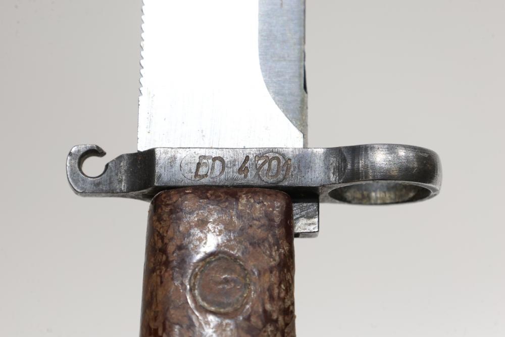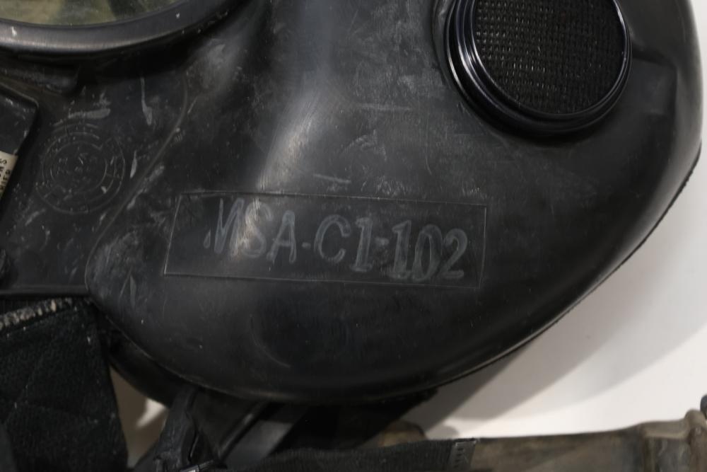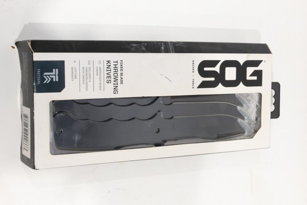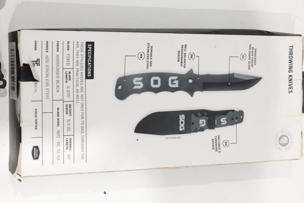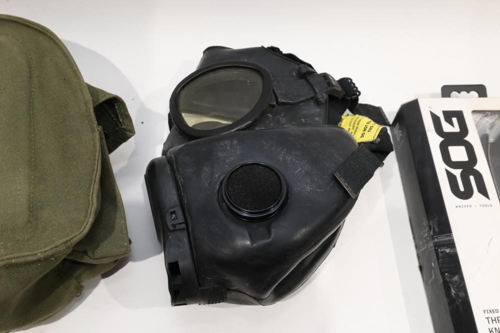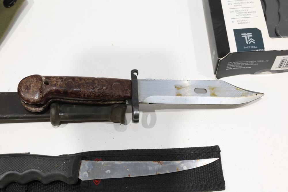 Boxed SOG fixed-blade throwing knife set (three knives, D2 steel, black finish, Model TRK102-CP), a U.S. M17A1 protective mask carrier with an MSA-marked gas mask (marking “MSA C1-102”), a fixed-blade knife with nylon sheath marked “Smith & Wesson,” and a bayonet with scabbard bearing the visible marking “BD 470.” All lots are subject to all applicable laws at the time of transfer. NOTE: Semi automatic rifles and all handguns require a license in NYS. There is a $35 transfer fee per long gun. There is a $40 transfer fee per hand gun. There is a $20 transfer fee per ammunition lot. If you fail the background check, the transfer fee still applies, and you are still required to make payment and then reconsign the lot to auction. FFL dealers are not exempt from these fees. A background check will be required for all buyers purchasing a firearm and/or ammunition. NYS charges a background check fee for all firearms and ammunition. The fee is $9 for firearms and $2.50 for ammunition. The NYS fee is per background check NOT per lot, will be collected directly by Civil Armory, and is in addition to any transfer All lots are subject to all applicable laws at the time of transfer. NOTE: Semi automatic rifles and all handguns require a license in NYS. There is a $35 transfer fee per long gun. There is a $40 transfer fee per hand gun. There is a $20 transfer fee per ammunition lot. If you fail the background check, the transfer fee still applies, and you are still required to make payment and then reconsign the lot to auction. FFL dealers are not exempt from these fees. A background check will be required for all buyers purchasing a firearm and/or ammunition. NYS charges a background check fee for all firearms and ammunition. The fee is $9 for firearms and $2.50 for ammunition. The NYS fee is per background check NOT per lot, will be collected directly by Civil Armory, and is in addition to any transfer